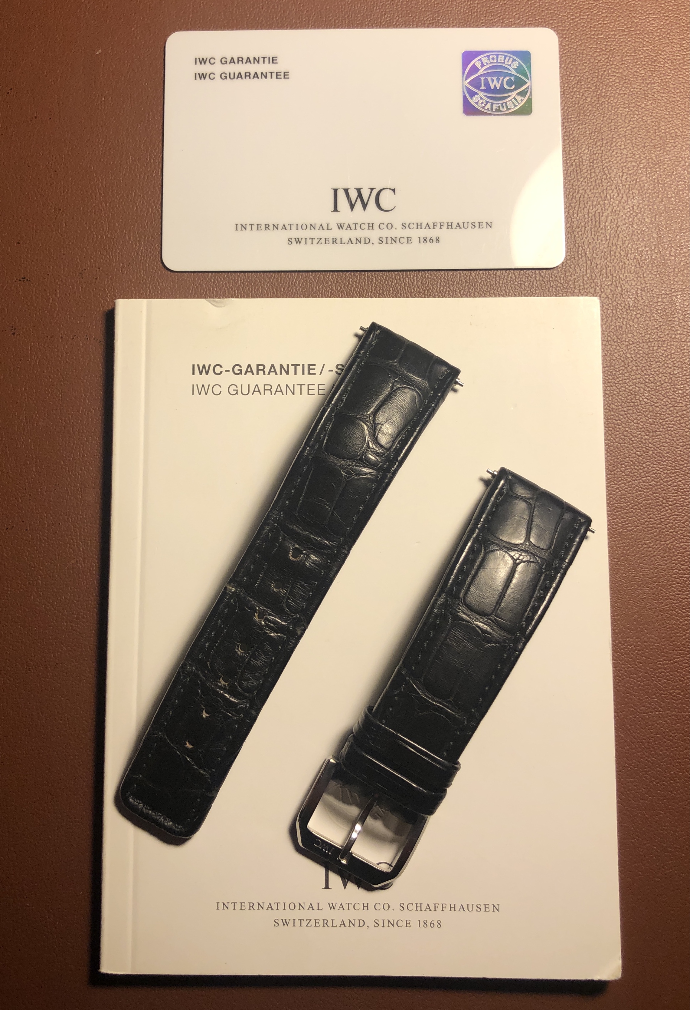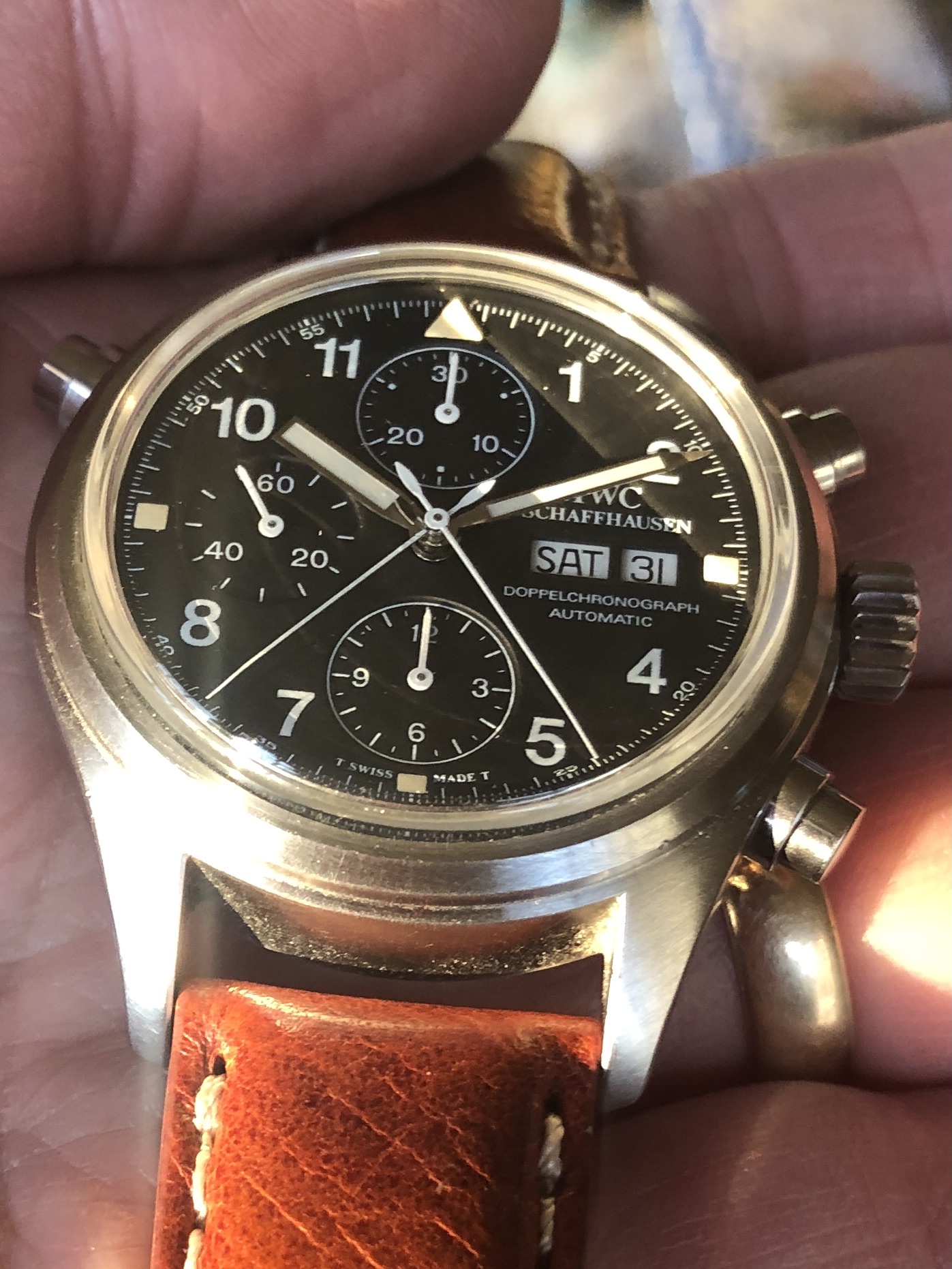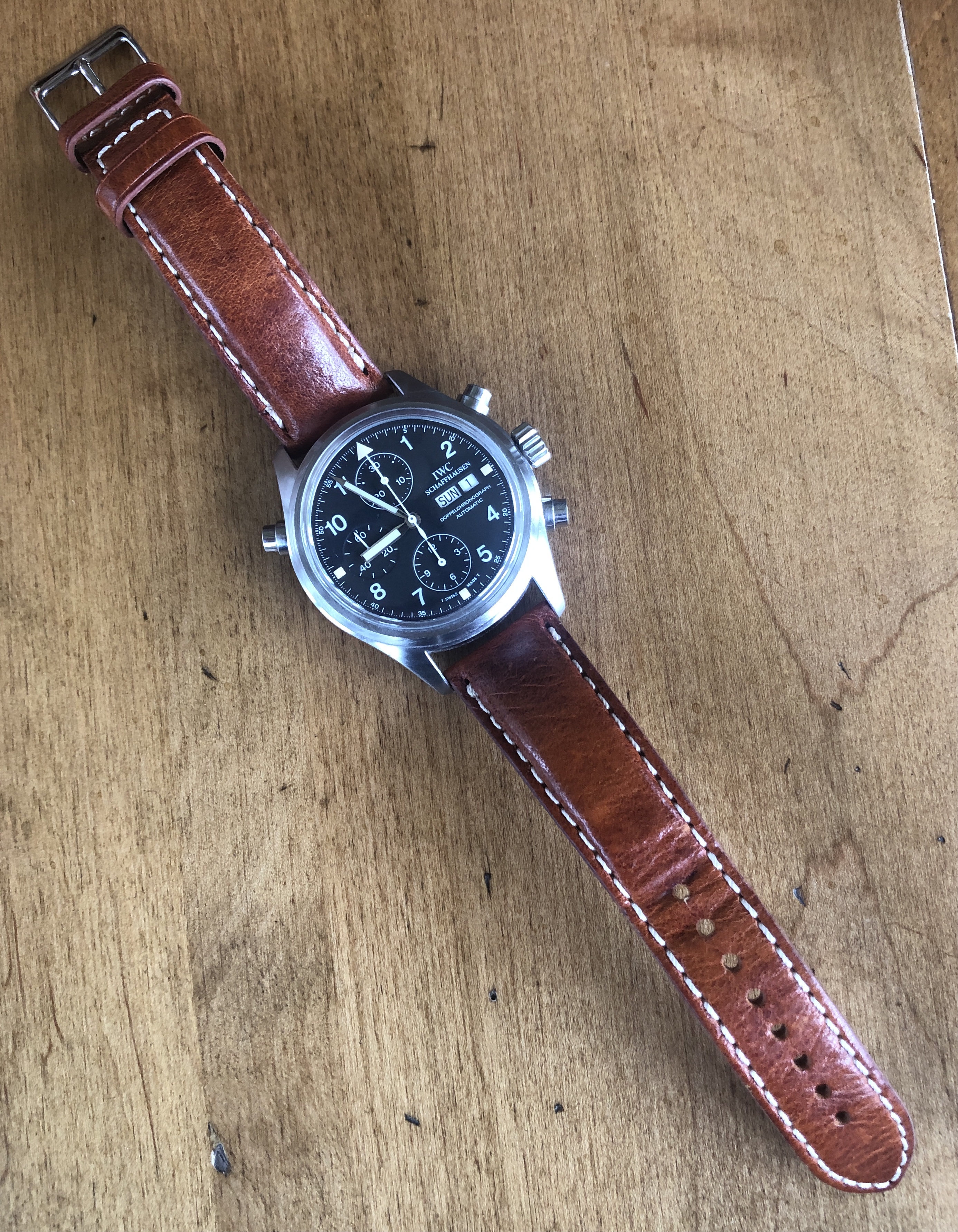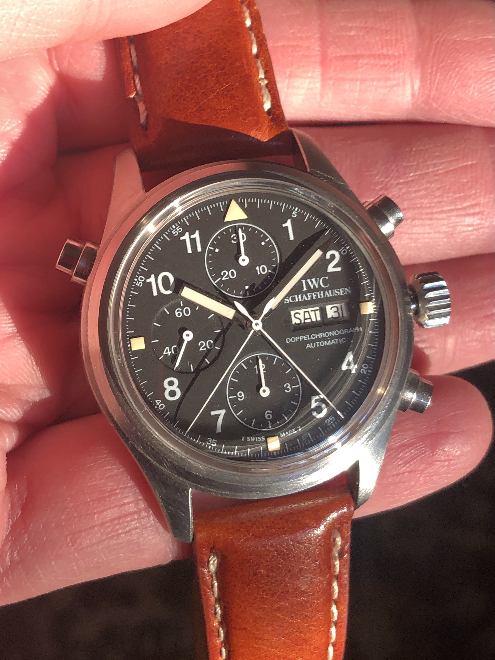 The domed sapphire crystal is unique to the 3711, and is in excellent shape with no chips or scratches. Fitted with a padded chestnut colored aftermarket strap and buckle with minor wear as shown. Original IWC branded black alligator strap and IWC buckle showing some wear is also included.
