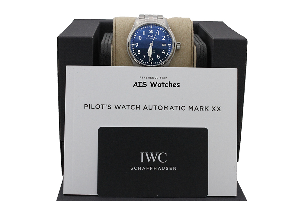 Up for sale is an IWC Schaffhausen IW328204 Pilot's Watch Mark XX Blue Dial 40MM SS Bracelet Box & Papers. The timepiece is in excellent condition.