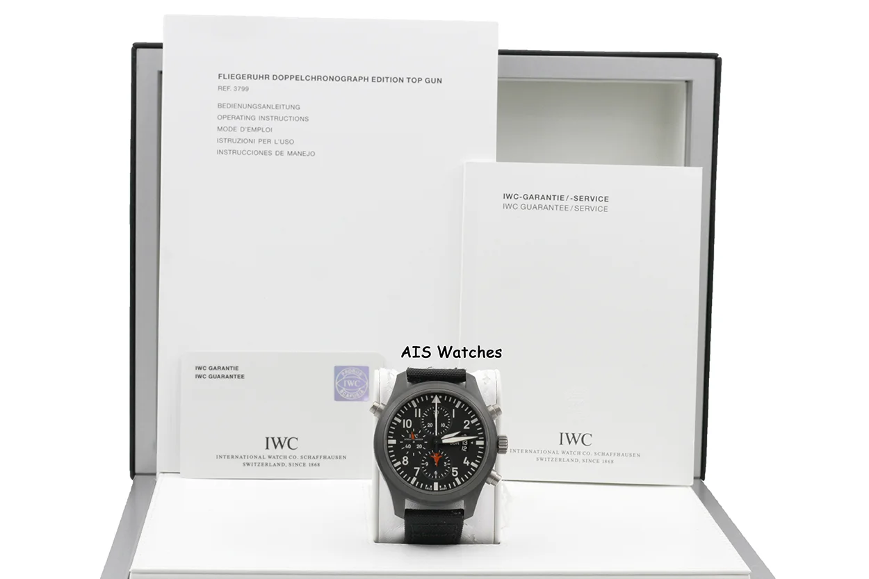 Up for sale is an IWC Schaffhausen Pilot Double Chronograph Edition TOP GUN 46MM Ceramic IW379901 B&P. The timepiece is in excellent condition.