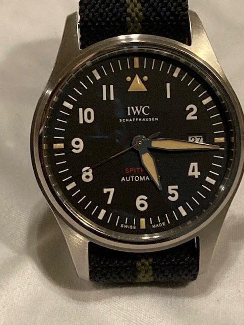 This Spitfire is in excellent condition and shows light use, without any really obvious or significant dings, dents, scrapes. scratches or swirls on the topcase, lugs or crystal, and the superbly comfortable IWC leather/textile strap has seen little use. An IWC calfskin strap is also available separately. As always, please see the images below for a clearer guide to condition and let me know if you'd like more or higher-resolution pix.