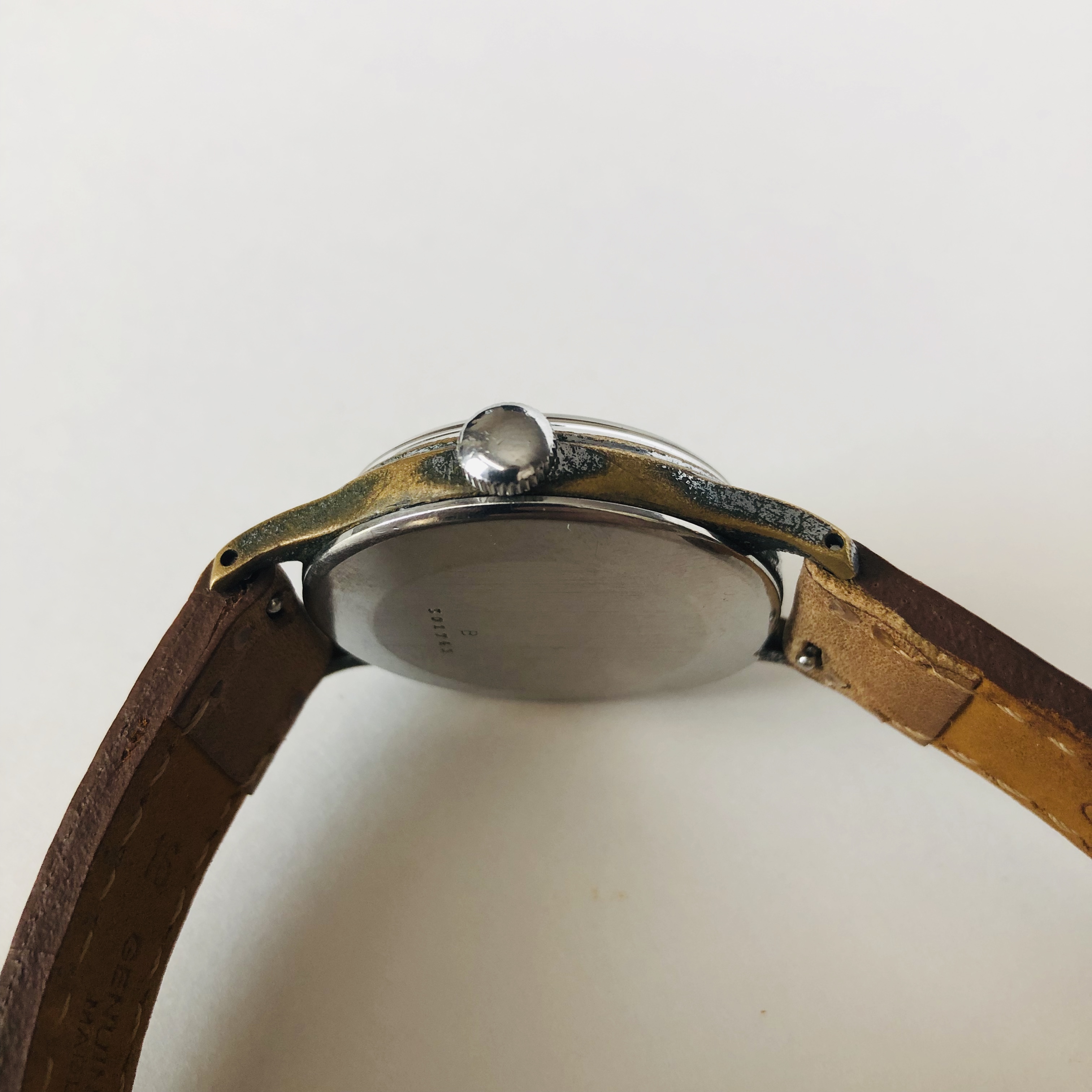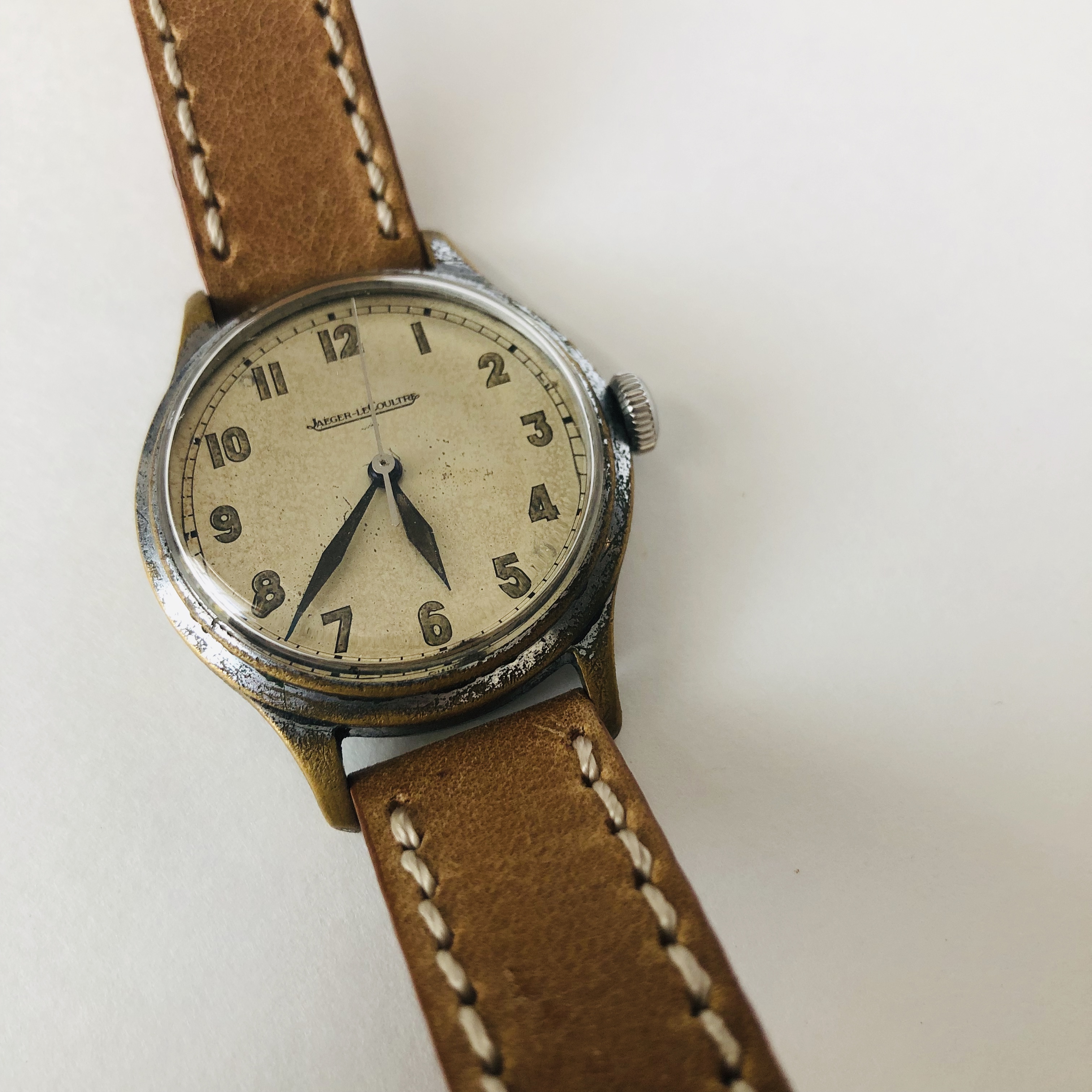 ·This is a 1944 WWII era Jaeger-LeCoultre 159. This watch has the chrome plated case used during the war to save money as stainless steel was very hard to come by at the time due to war shortages. Quite a few were used by pilots on both sides of the conflict. Original dial, hands, etc. The watch is 34mm.