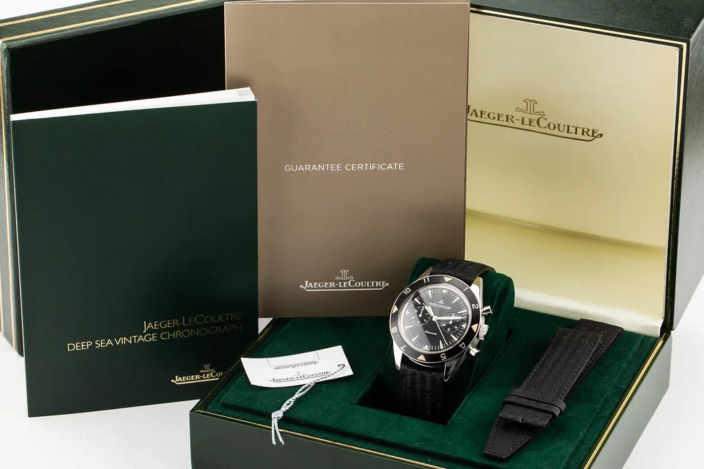 ·Up for sale is an excellent condition Boutique Only Jaeger LeCoultre JLC Deep Sea Vintage Chronograph Tribute 40mm reference # 207857J Q207857J Now extremely rare and sought after. It comes with all boxes, papers, booklets, hang tag, extra strap and JLC Guarantee Certificate dated June 2017.