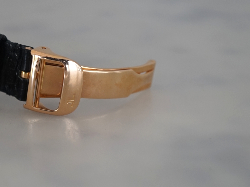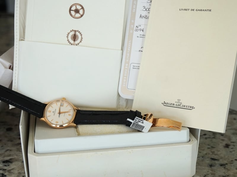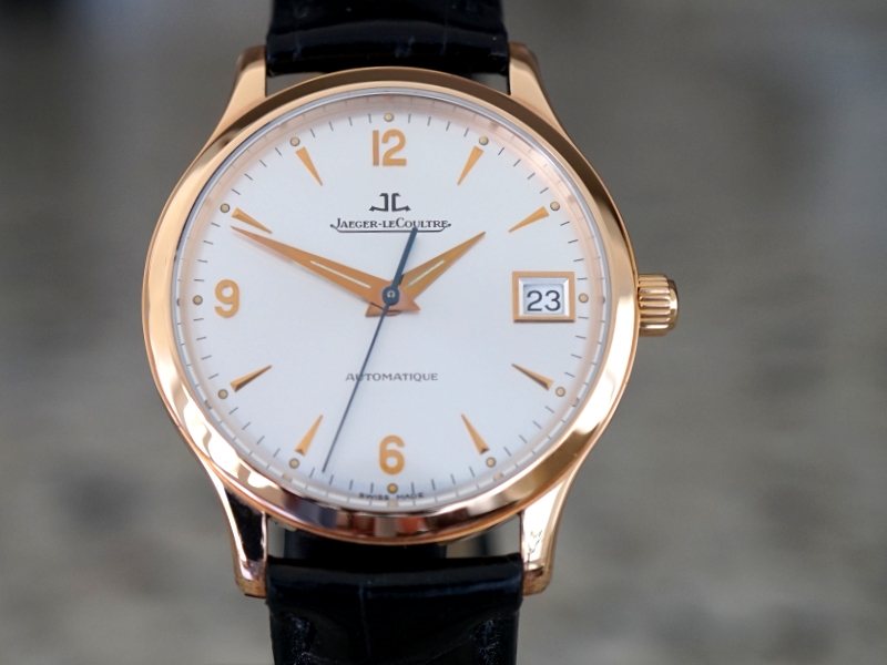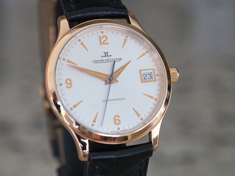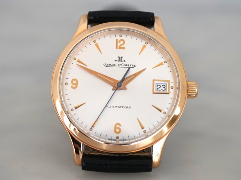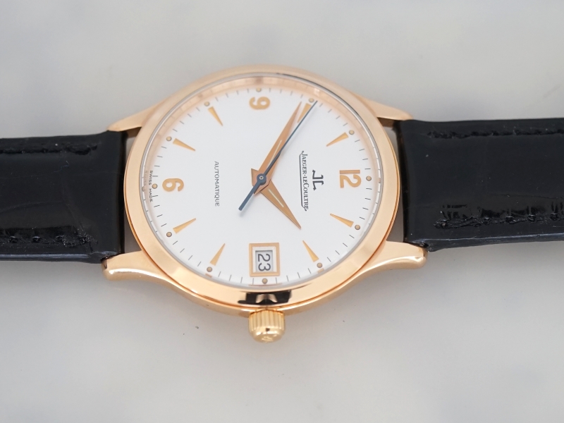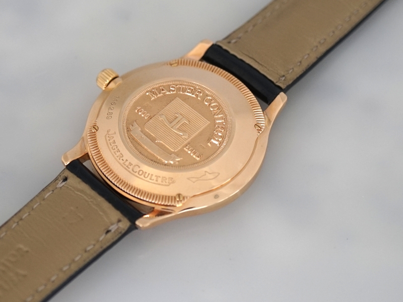 ·Jaeger-LeCoultre Master Control Automatic Q145.2.89, 18k rose gold on a strap with an 18k rose gold tang buckle, automatic JLC Calibe, date at 3 o'clock, centered sweep second hand, sapphire crystal, silver dial with applied rose gold hour markers and Arabic numerals, display back, water resistant to 50 meters, diameter: 34mm, thickness: 7.5mm. near mint condition with box and papers