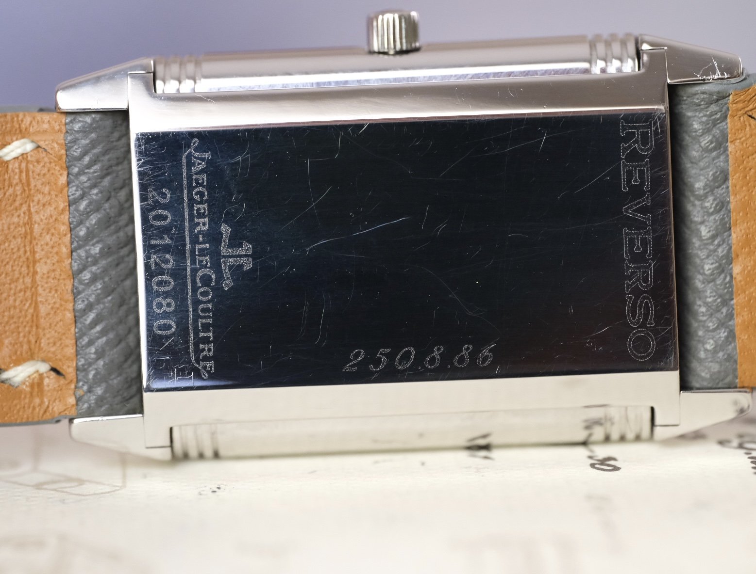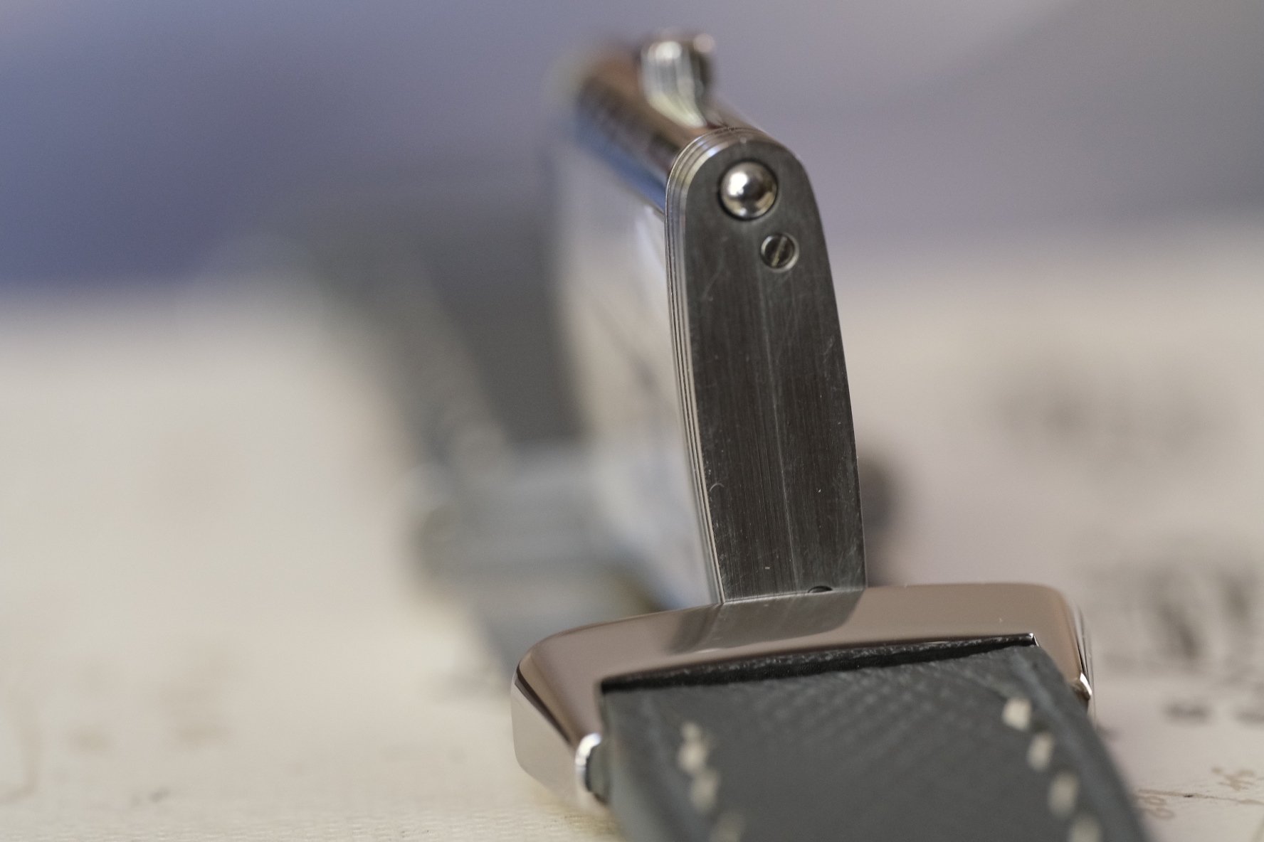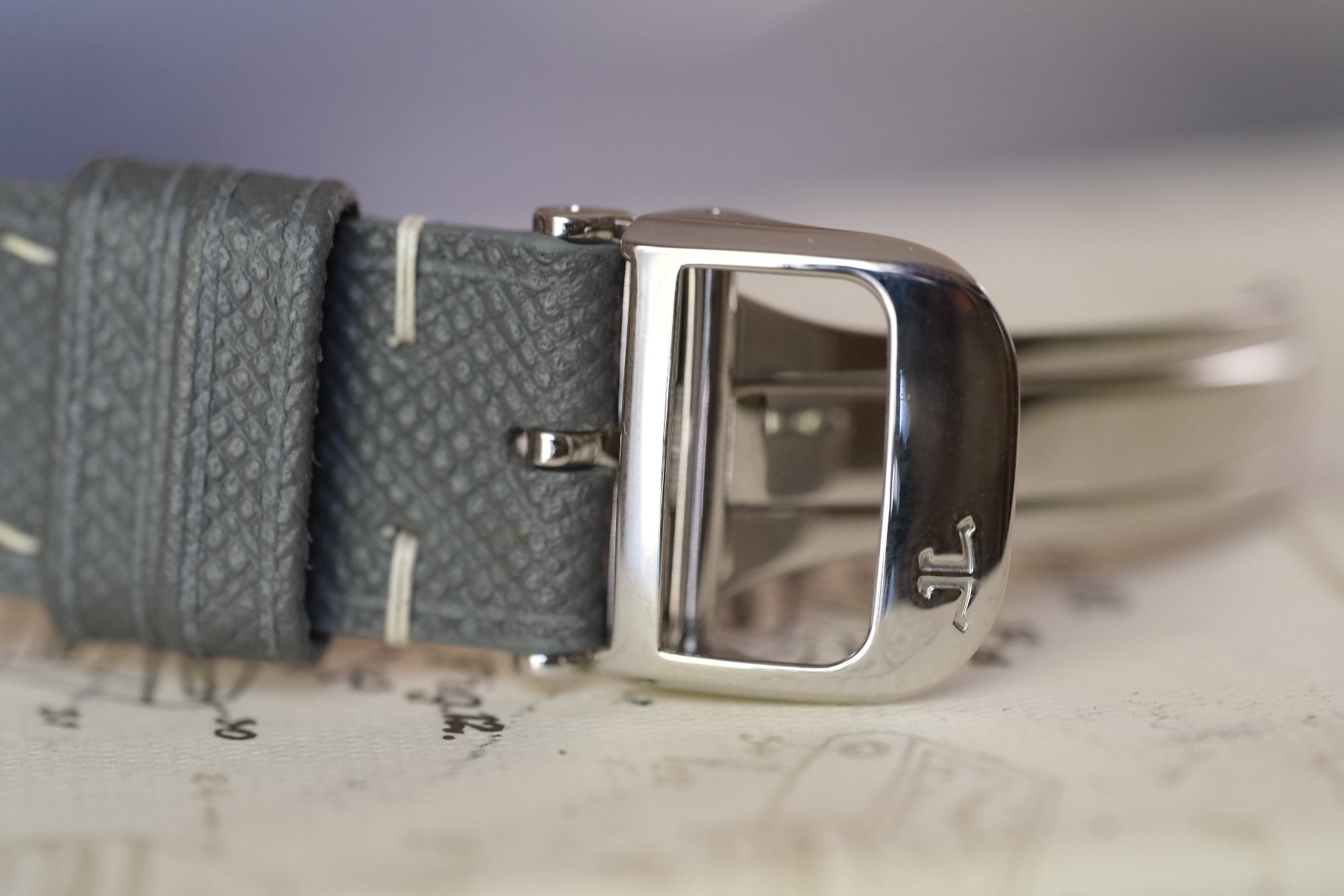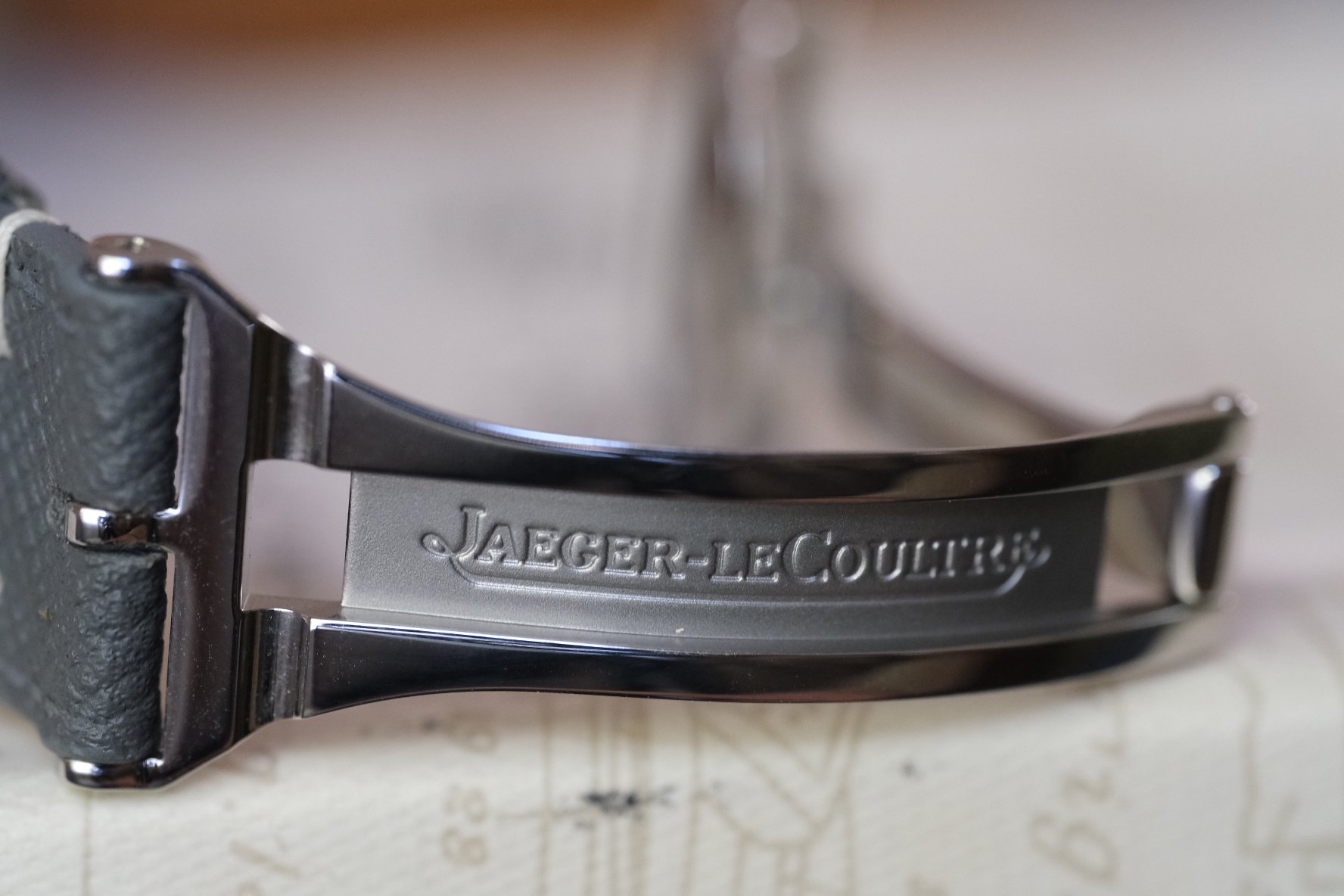 STRAP: Comes on a brand new, handmade, gray French leather strap, that I think pairs beautifully with that dial! Complete with its original JLC deployant clasp.