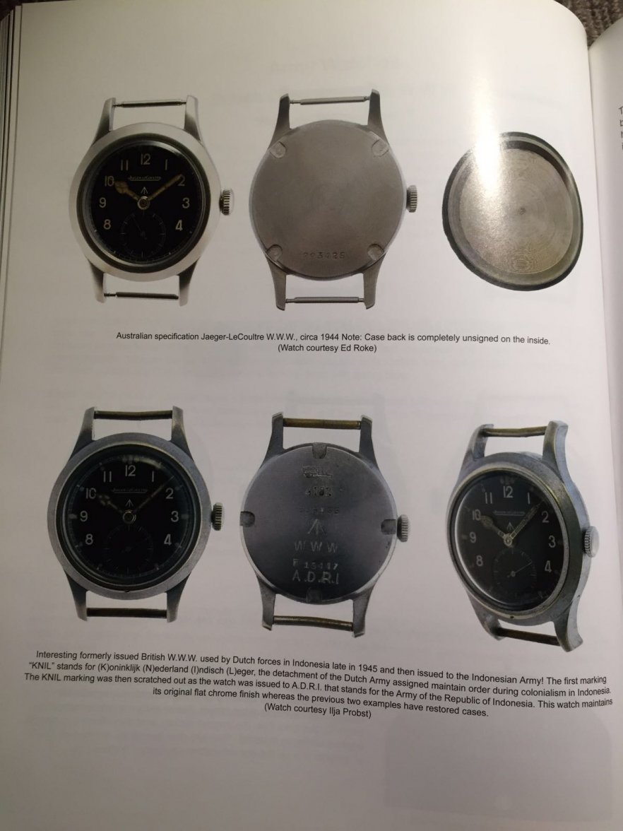 Australian and British cases are different, the Australian examples seen have spring bars and the British version has fixed bars. The original finish on the Australian ones seems to be shiny, and the original finish on the British ones is matte. The lugs on the Australian one seem to be slimmer than the British version. The heavy case has a slim bezel and a glass that screws in from the back to provide a dustproof seal. The caseback is numbered 293xxx and like all the Australian issue WWW watches, does not have the WWW caseback markings. I have also include a photo of a page from the JLC book by Zaf Basha regarding JLC WWW that shows the Australian specification.
