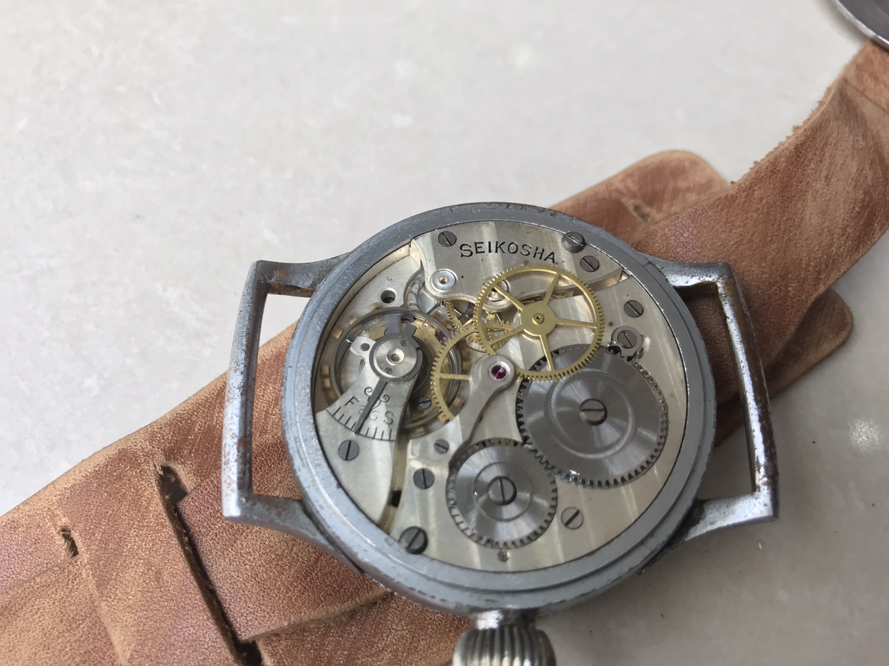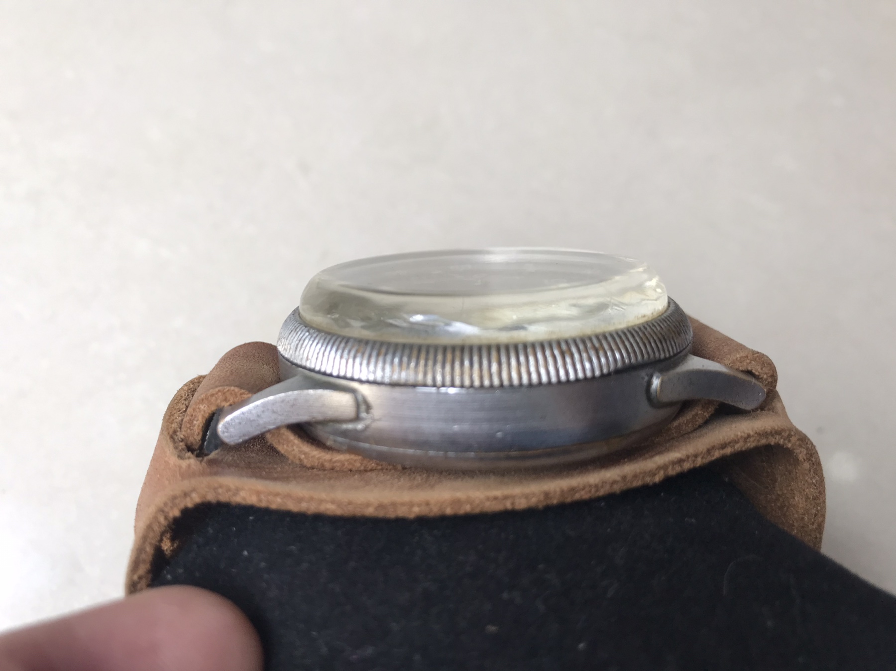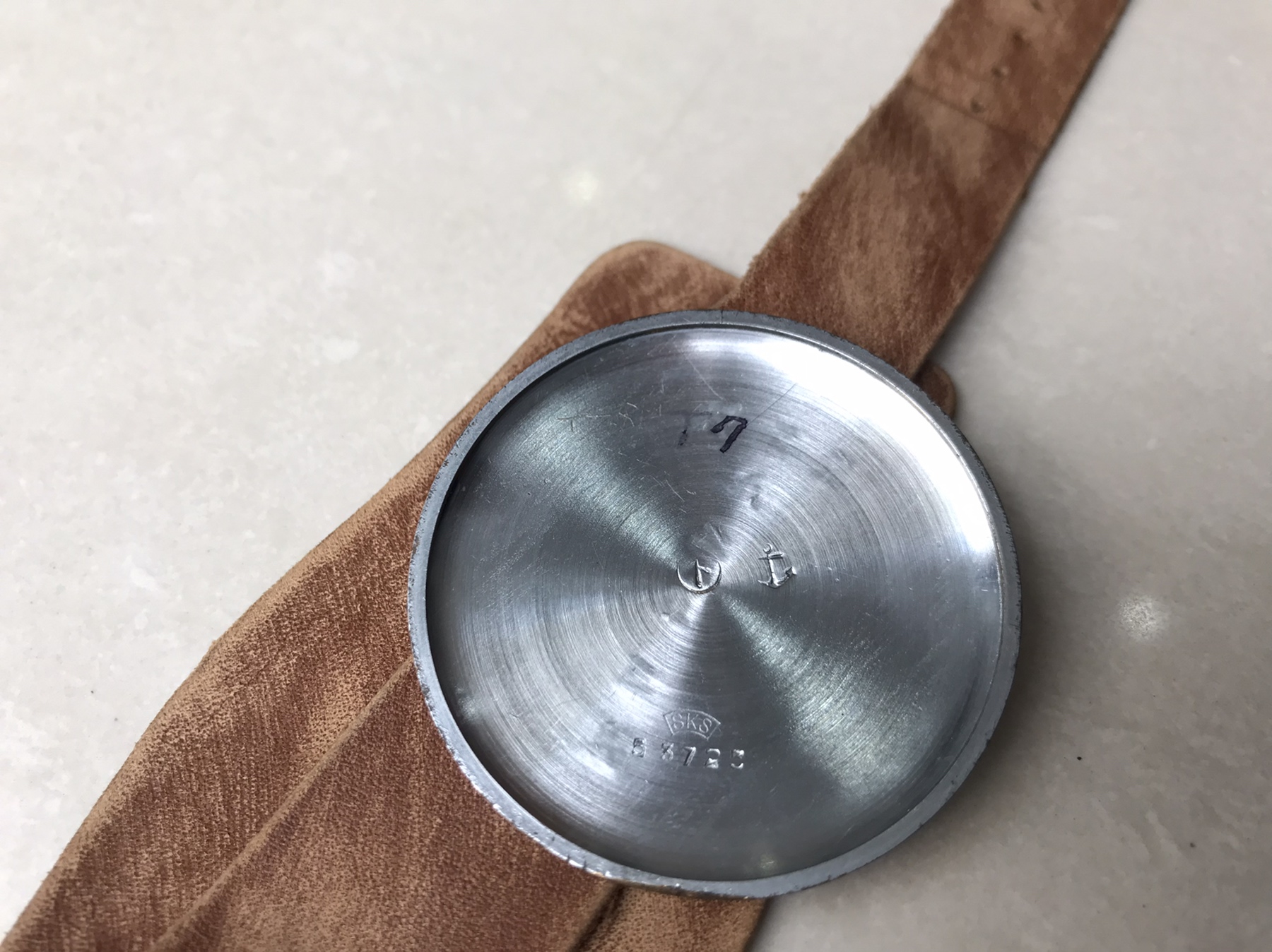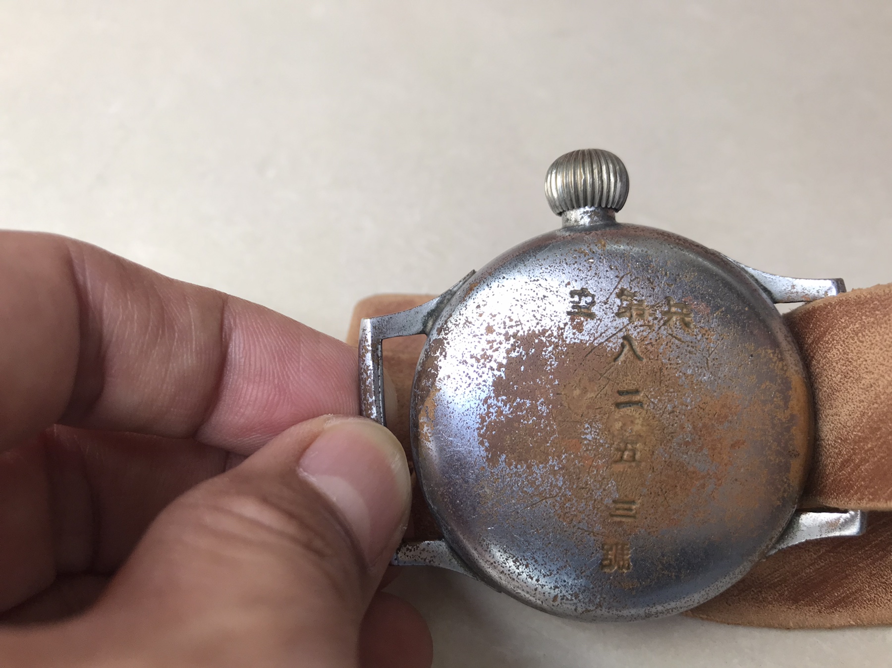 This watch type was used by the Navy Type 0 carrier fighter pilots. The anchor stamp on the case back shows this was supplied to the navy. Apparently, it was mounted to the thigh rather than the wrist.