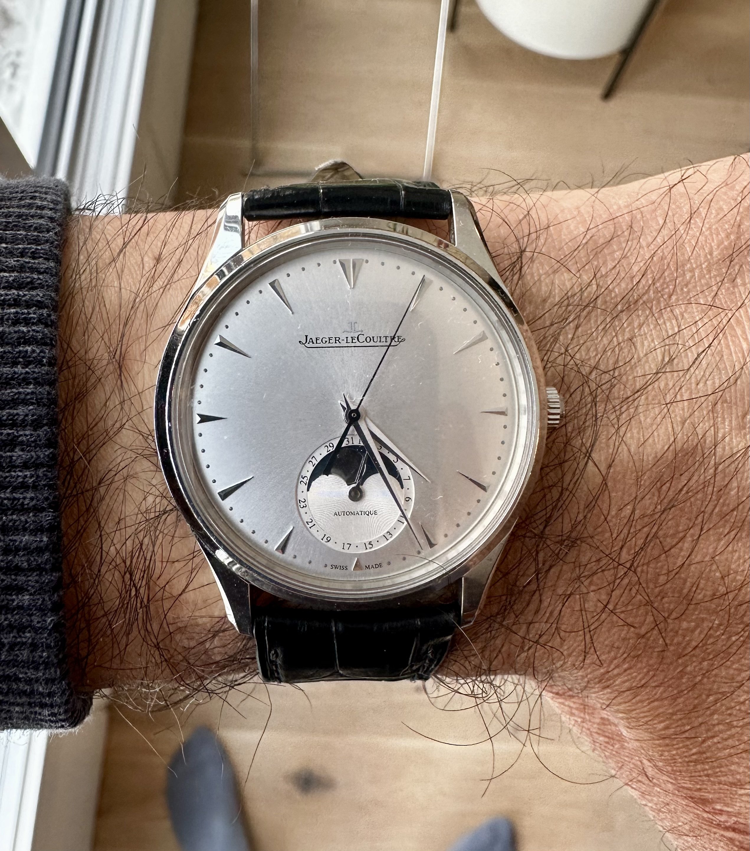 I was married 5 years ago, and my father-in-law has a tradition of buying a watch for each son-in-law as a gift to mark the occasion - an incredible gesture. The first brother in law received a Cartier Pasha watch - certainly very nice but also very much not my style. Knowing I’m a watch guy, I was given a budget to choose my own. I found a JLC Moonphase Ultra Thin, pre-owned, with silver dial. It didn’t quite squeak into the budget but I supplemented the purchase (unbeknownst to my father in law) with an extra $1,500 to make the math work. (The last brother in law, who knows nothing about watches, chose a Moonwatch with my advice).