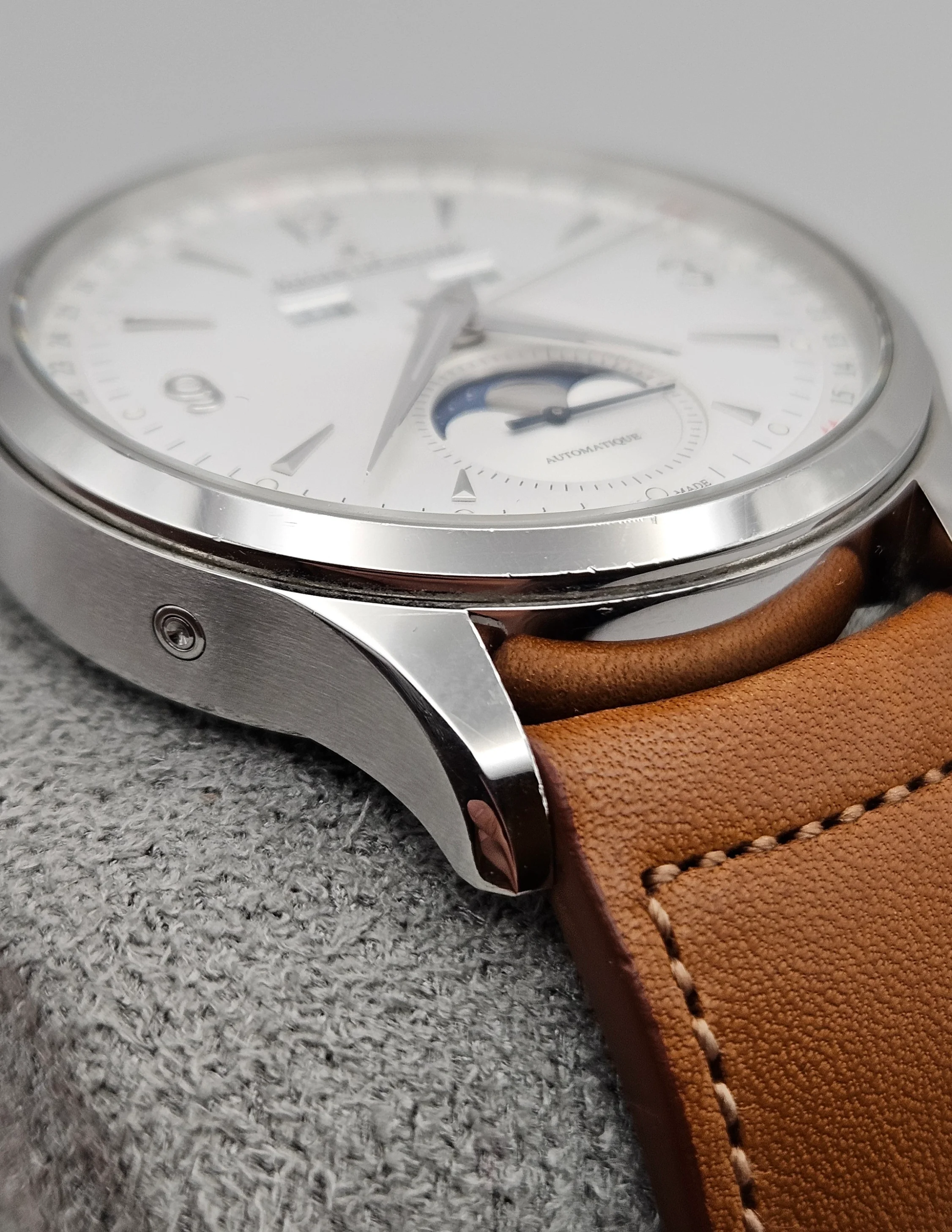 Bracelet: JLC leather strap & deployant clasp. Will fit wrist sizes 7.0" - 8.25". Smaller straps are available from JLC