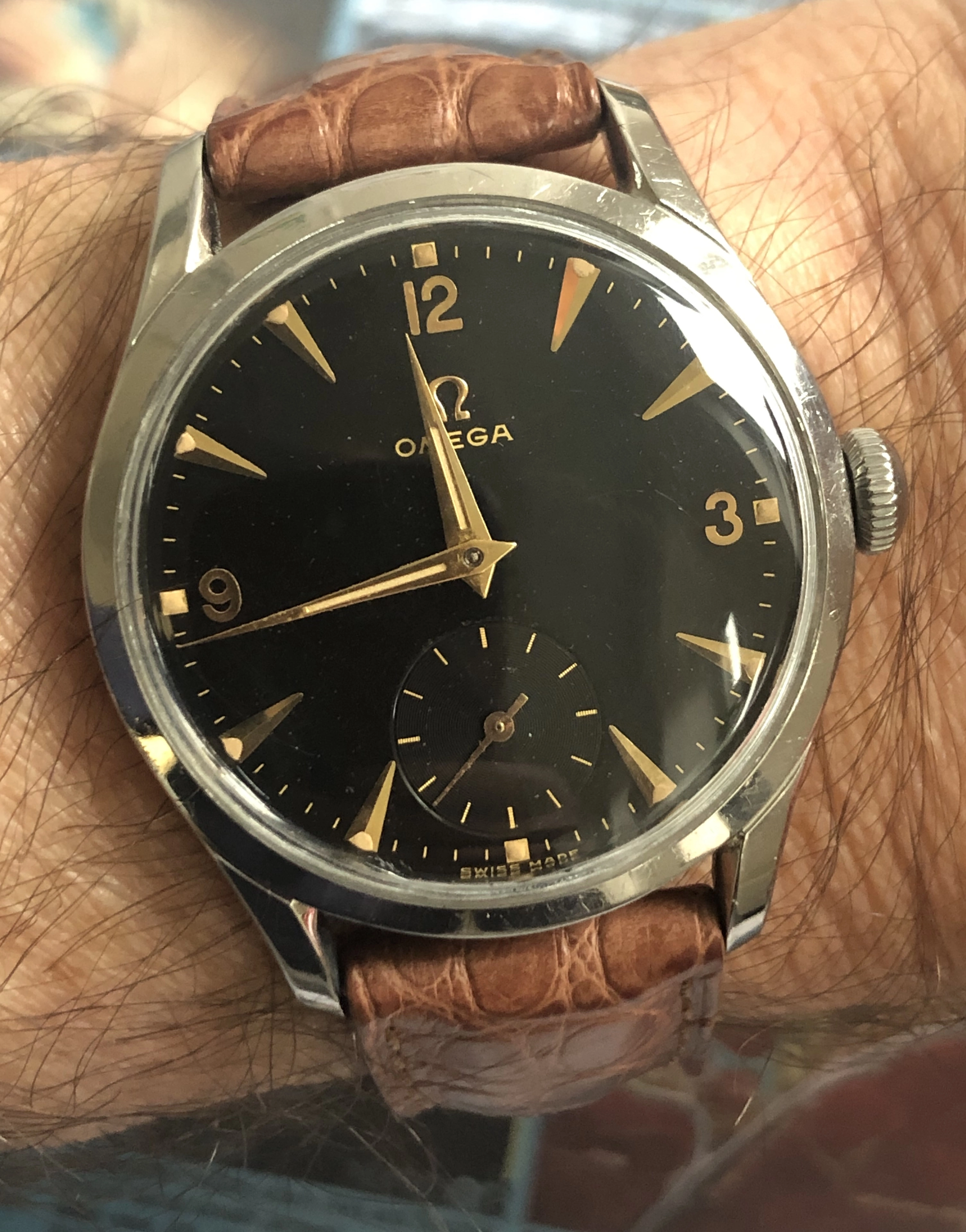 After a couple of years, I was able to obtain a set of NOS central hands and I had my watchmaker preserve the original set and install the new set. I was quite happy with the result!