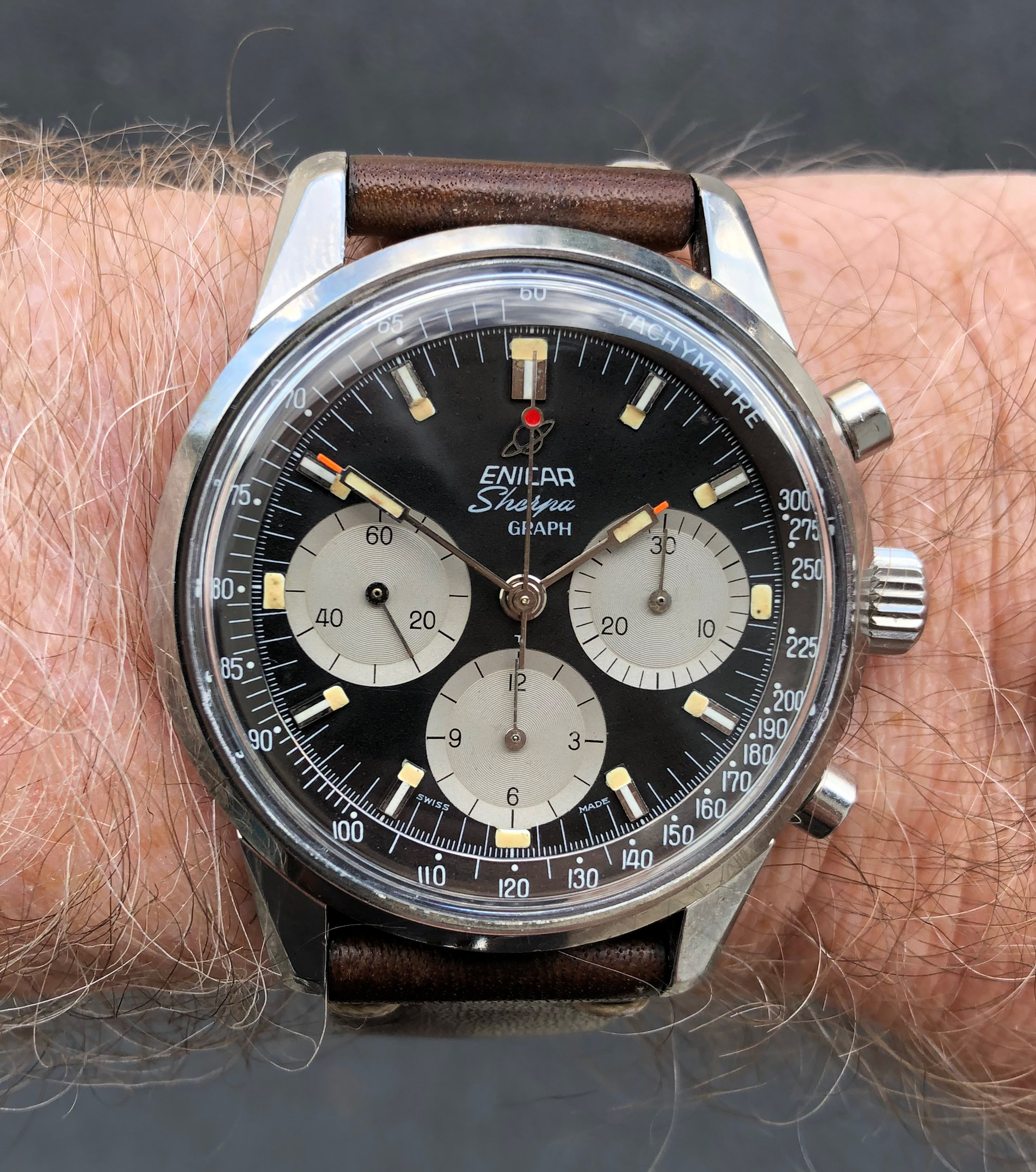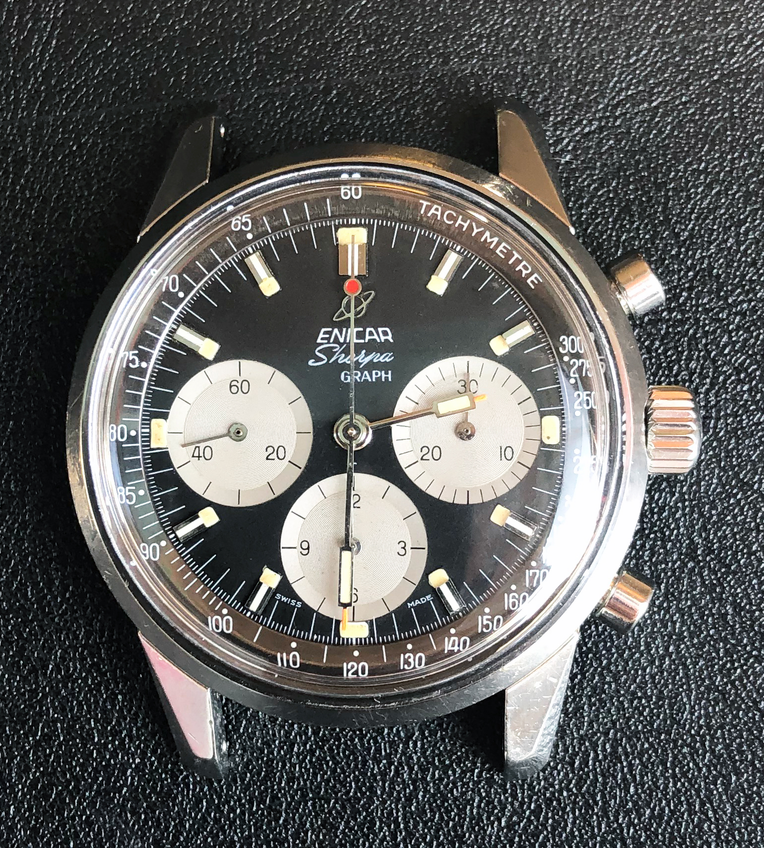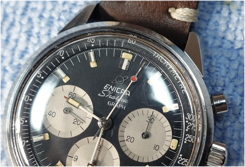 I own an Enicar Sherpa Graph Mark III (12-66) that has a very clean dial, but at the time of purchase, the central hands had been painted because they had rusted.