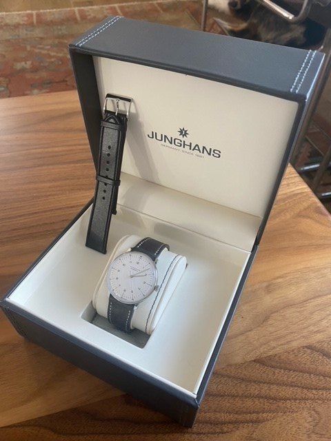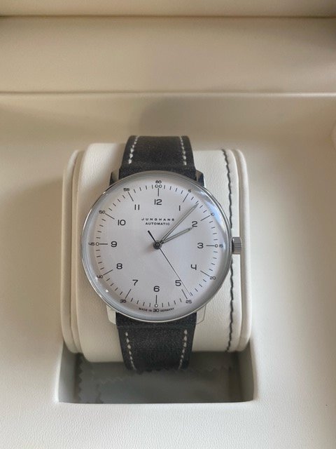 路For Sale is my personal Junghans Max Bill (upgraded to Sapphire Crystal at the factory when purchased). Original Plexi will be included with purchase. Comes with slate gray Hodinkee strap and original OEM black leather strap (tang buckle). The OEM strap is brand new (never worn). Watch comes with box and papers. Condition is 9.5 out of 10. Slight swirls on back of case. Dial, crystal, case and lugs in MINT condition. I have a 7" wrist and this case size wears great.