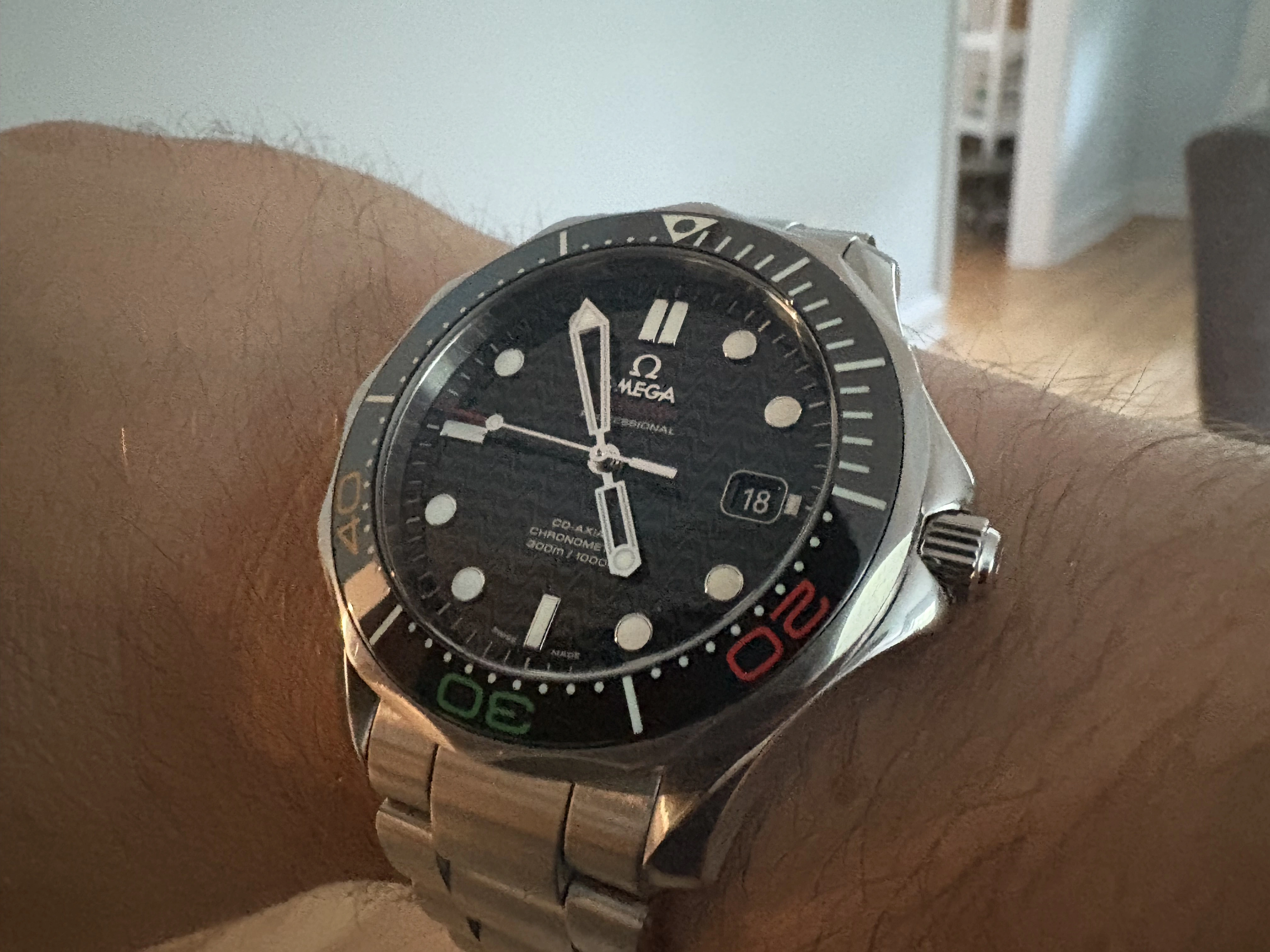 After getting it preowned off eBay maybe 18 months ago or so, I sent it off to Omega for a full service and it came back looking new and keeping excellent time: running about 2 seconds fast each day. I wore it just about every day, all day—at work, the pool, the gym, walking the dog—you get it.