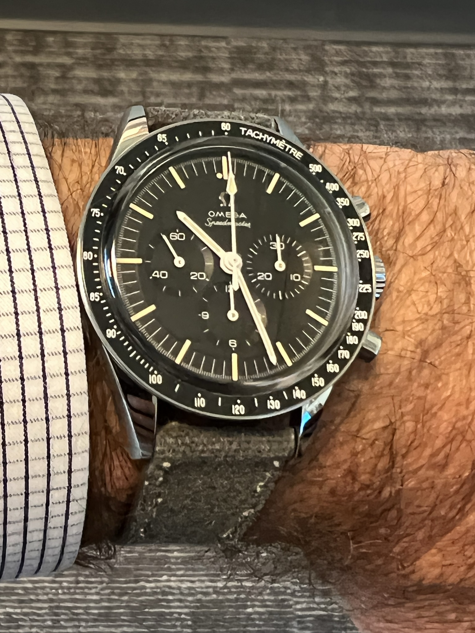 Gorgeous Speedmaster. I've thought about picking one up on the gray market, but at least for the moment I just can't justify the price when I've already got a '69 Straight Writing 145.022. I wish that Omega would put a ceramic bezel on the "entry level" 3861 because that would probably be the tipping point for me to purchase one. It's not like a ceramic bezel is that expensive. My 2017 SMPc came with one and I picked that up new on the gray market for less than $2,900. Sadly, that pricing for a new Omega is long gone.