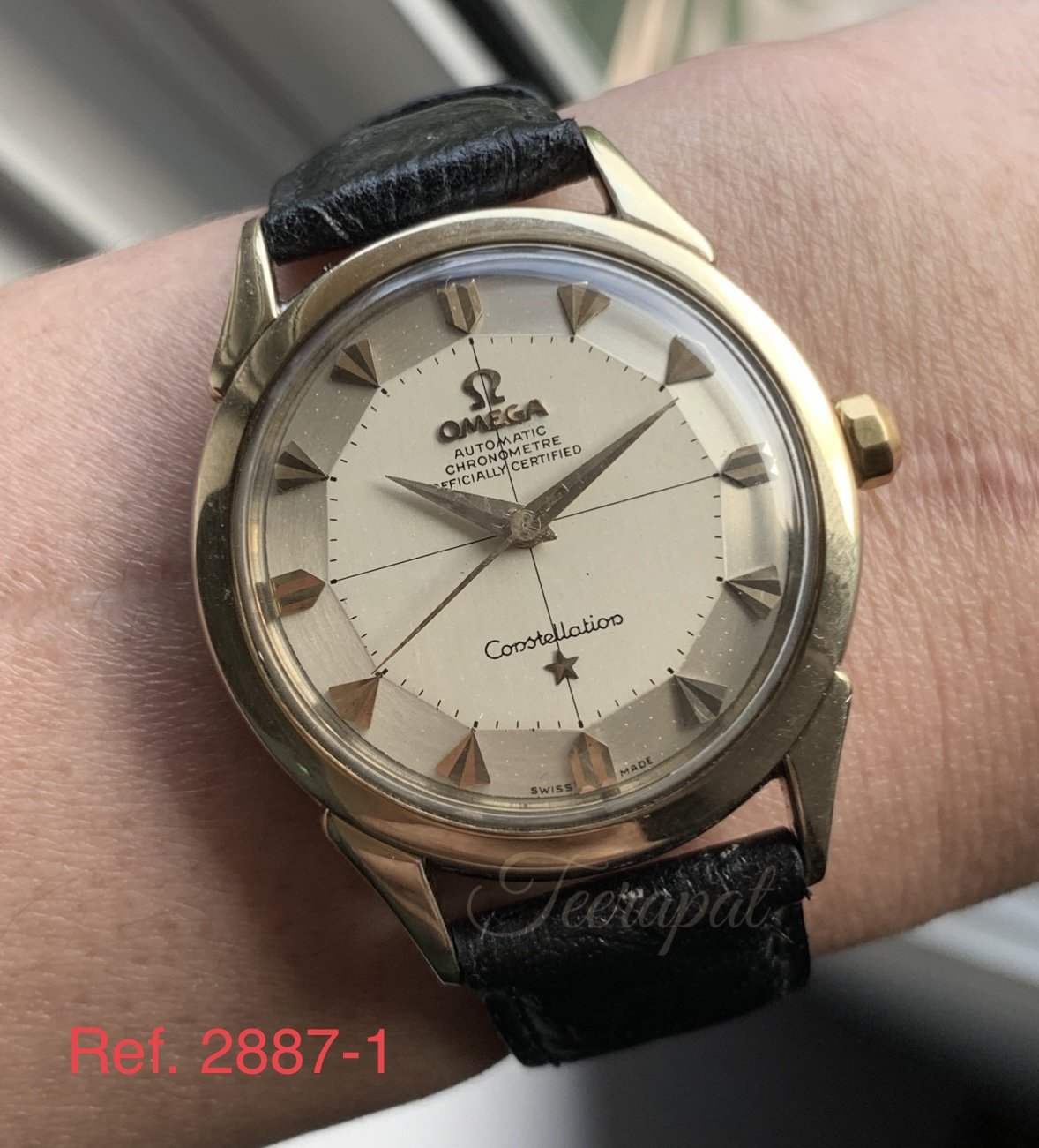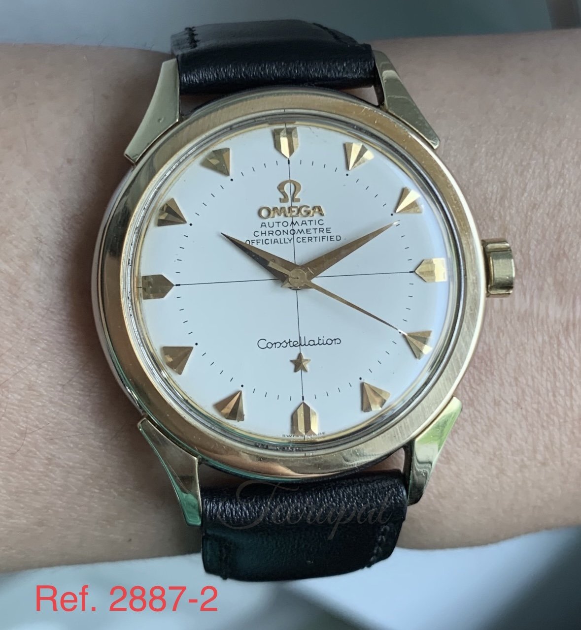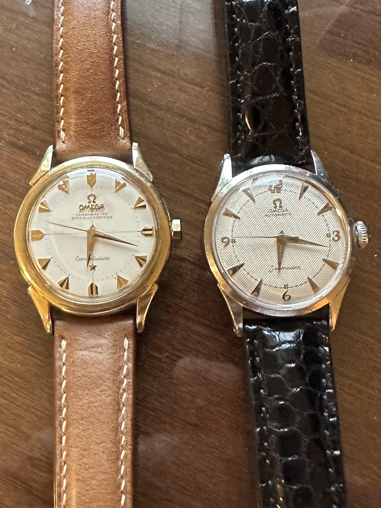·So I thought that I would share these two since they are somewhat uncommon. On the left we have a seldom seen 1954 Constellation reference 2887 in gold cap with a crosshair dome dial and arrowhead markers. On the right, we have a 1952 Seamaster reference 2635 in steel with a rail track waffle dial, Breguet numerals and dagger style markers. Enjoy. 😀
