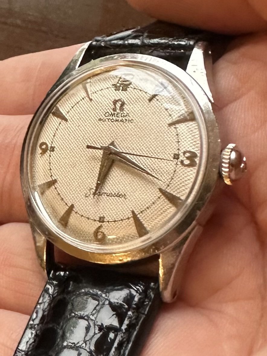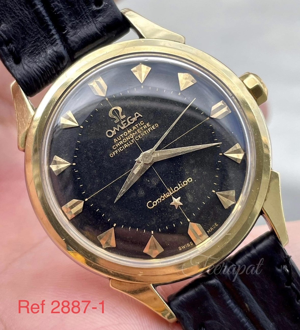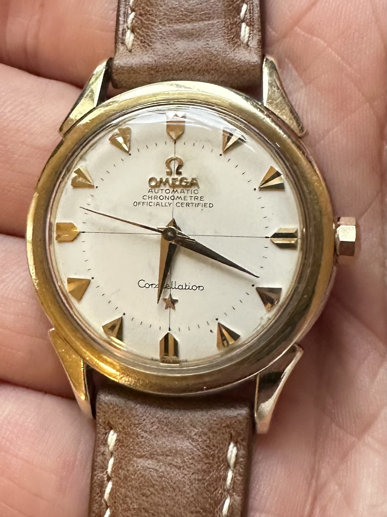 ·So I thought that I would share these two since they are somewhat uncommon. On the left we have a seldom seen 1954 Constellation reference 2887 in gold cap with a crosshair dome dial and arrowhead markers. On the right, we have a 1952 Seamaster reference 2635 in steel with a rail track waffle dial, Breguet numerals and dagger style markers. Enjoy. 😀
