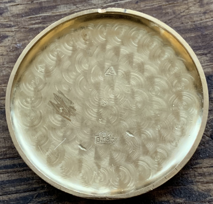 The 750 with this kind of geometric figure can be found in Swiss made cases, but also in South America's and others. And in Swiss cases, it is usually much better done - compare for instance with the pic posted by Hoipolloi. Moreover, in a 18K gold case of that period, there should be a Helvetica. I do not have the knowledge to say it was absolutley mandatory, but in my exeprience it is clear that this case is not Swiss made. I do not see any reason to think it is, except your wish to have a very particular watch (which I understand!).