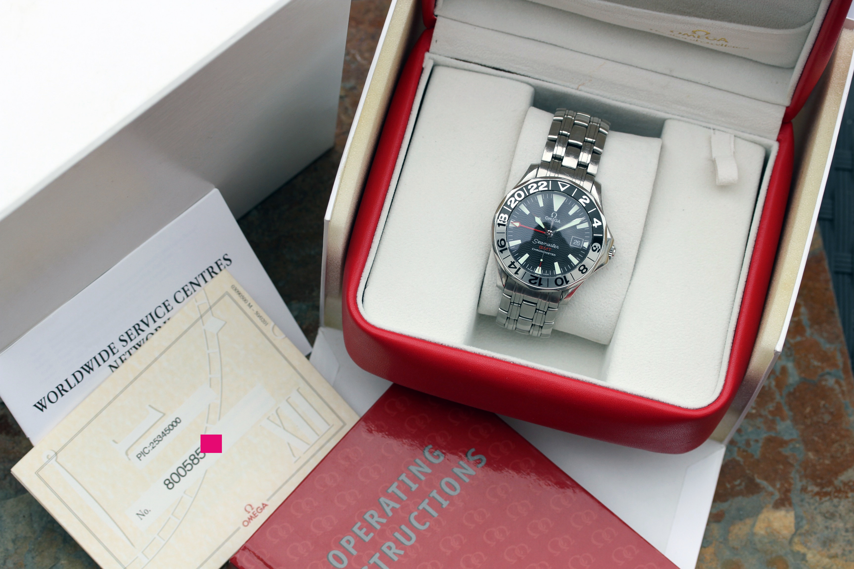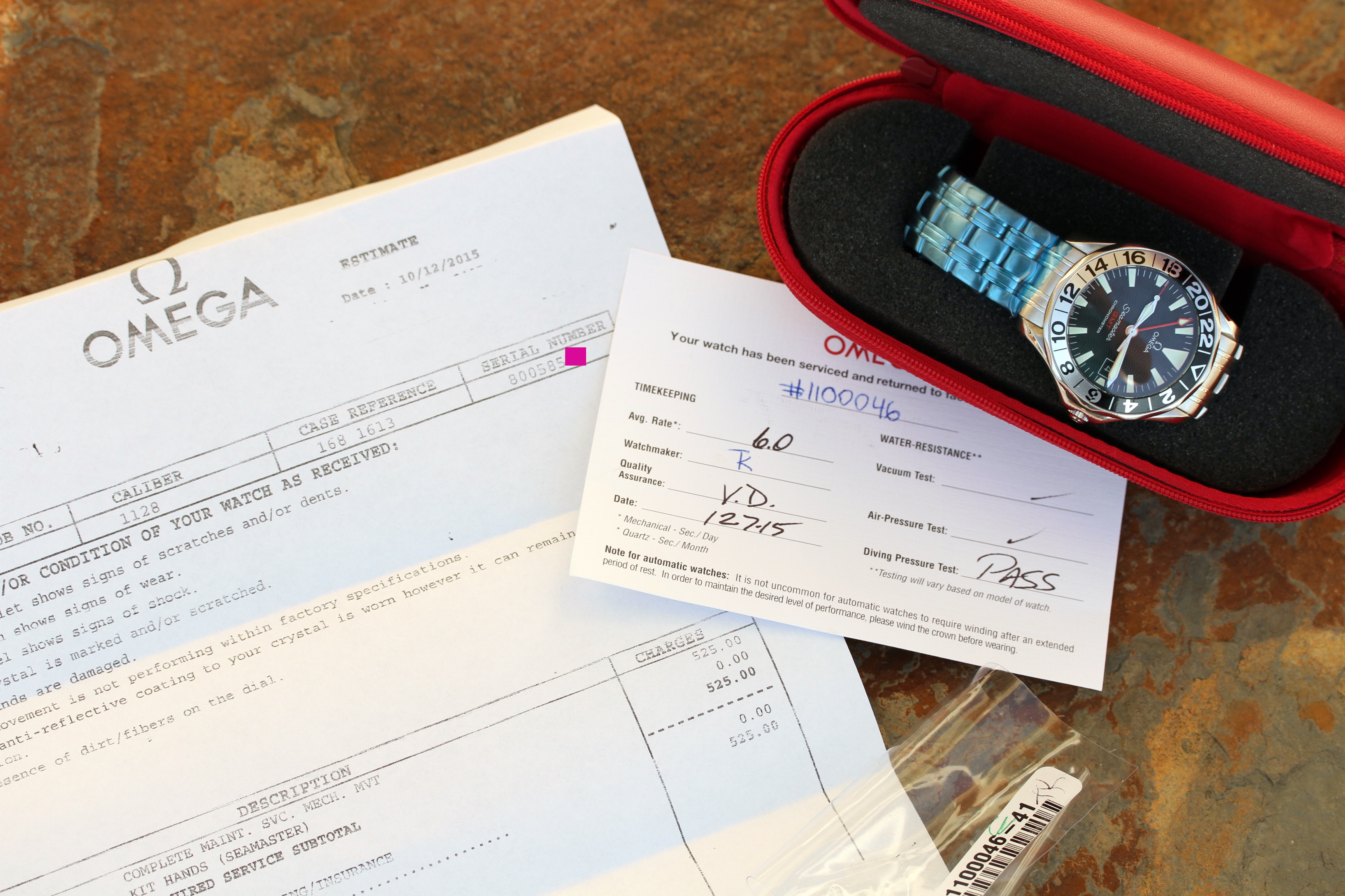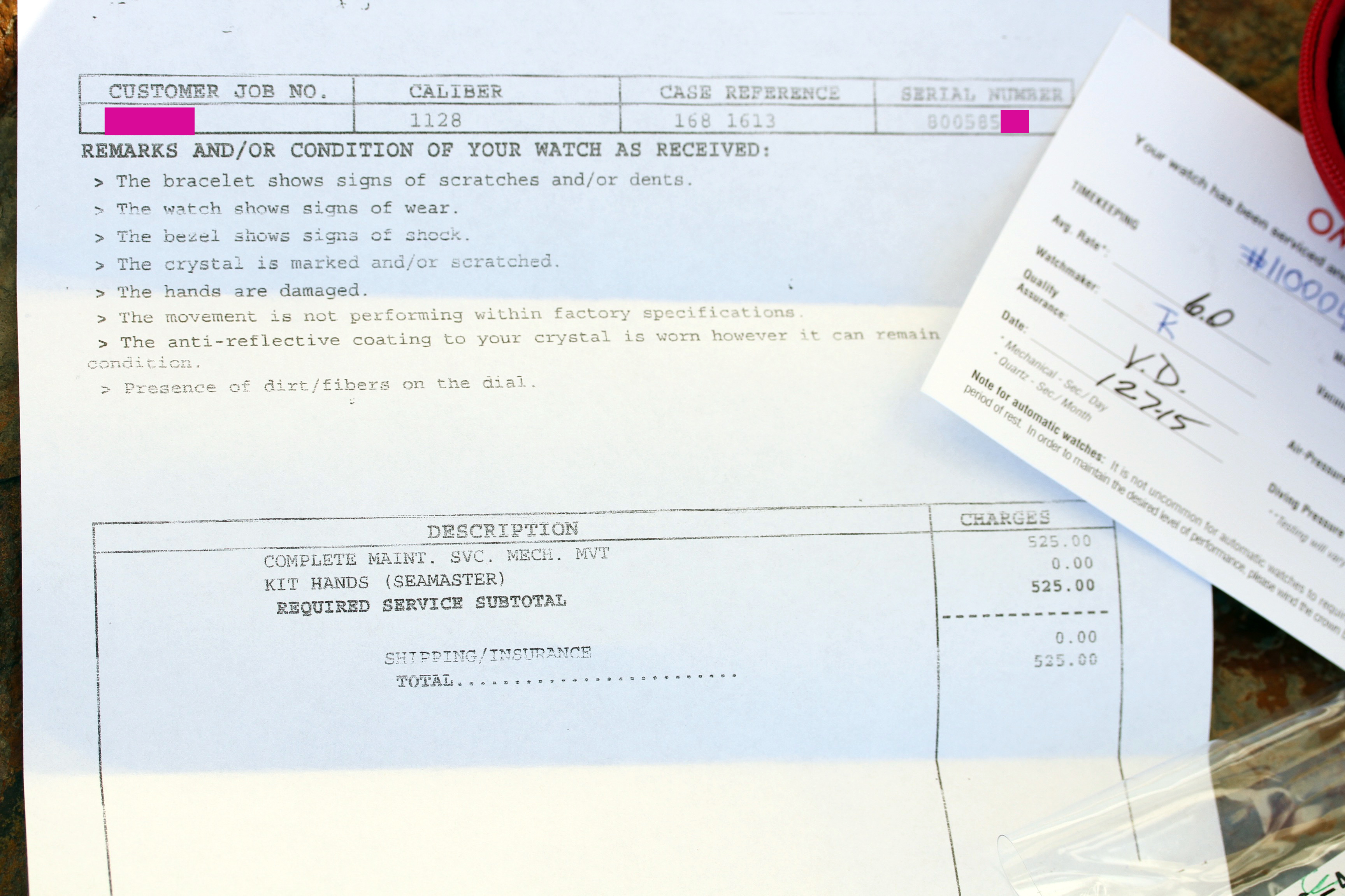 Watch comes with Omega boxes, manual, COSC booklet with matching serial. No warranty card. Watch also comes with Omega service box, QC card, and invoice for $525 for service charge at Omega.