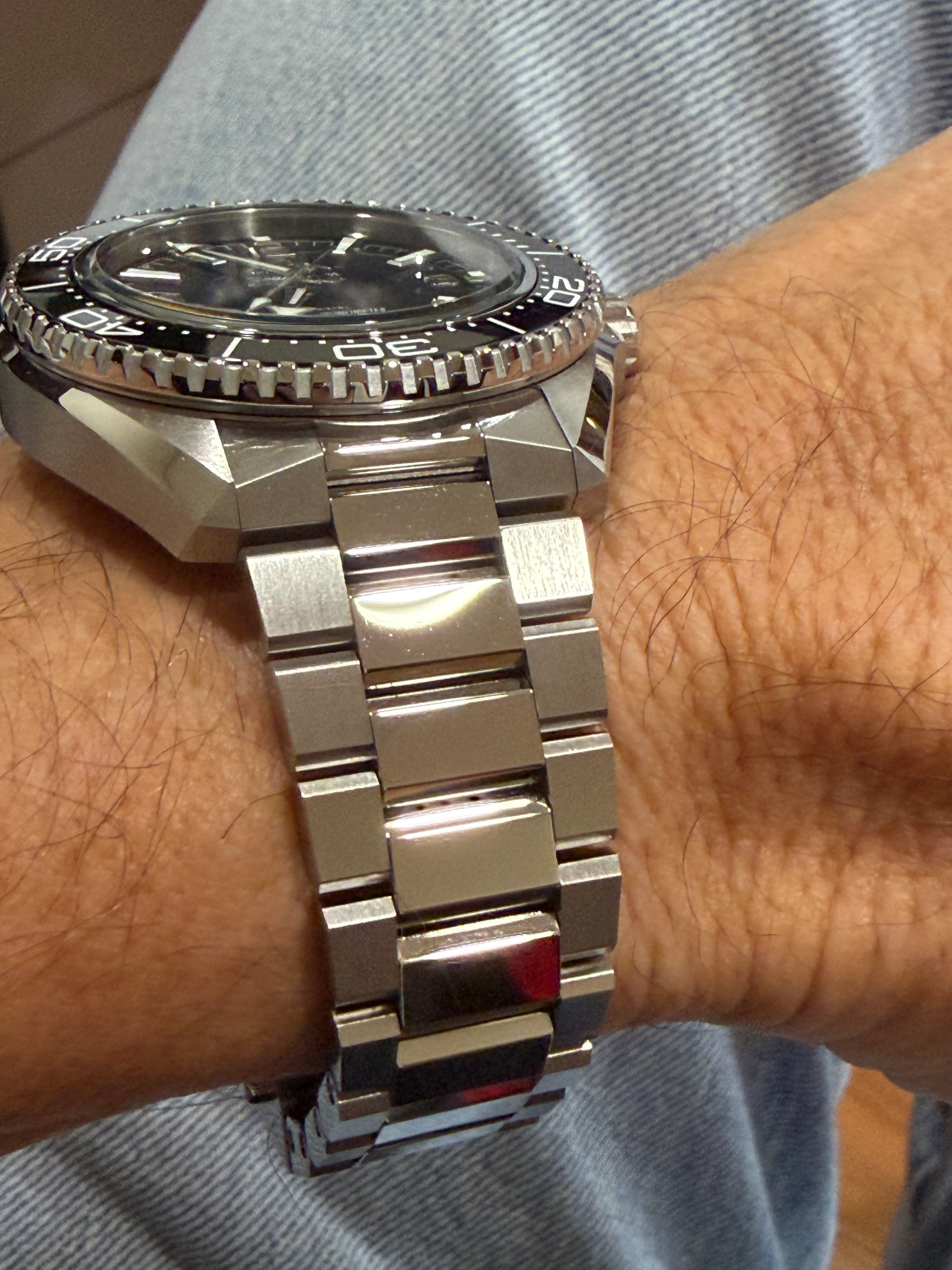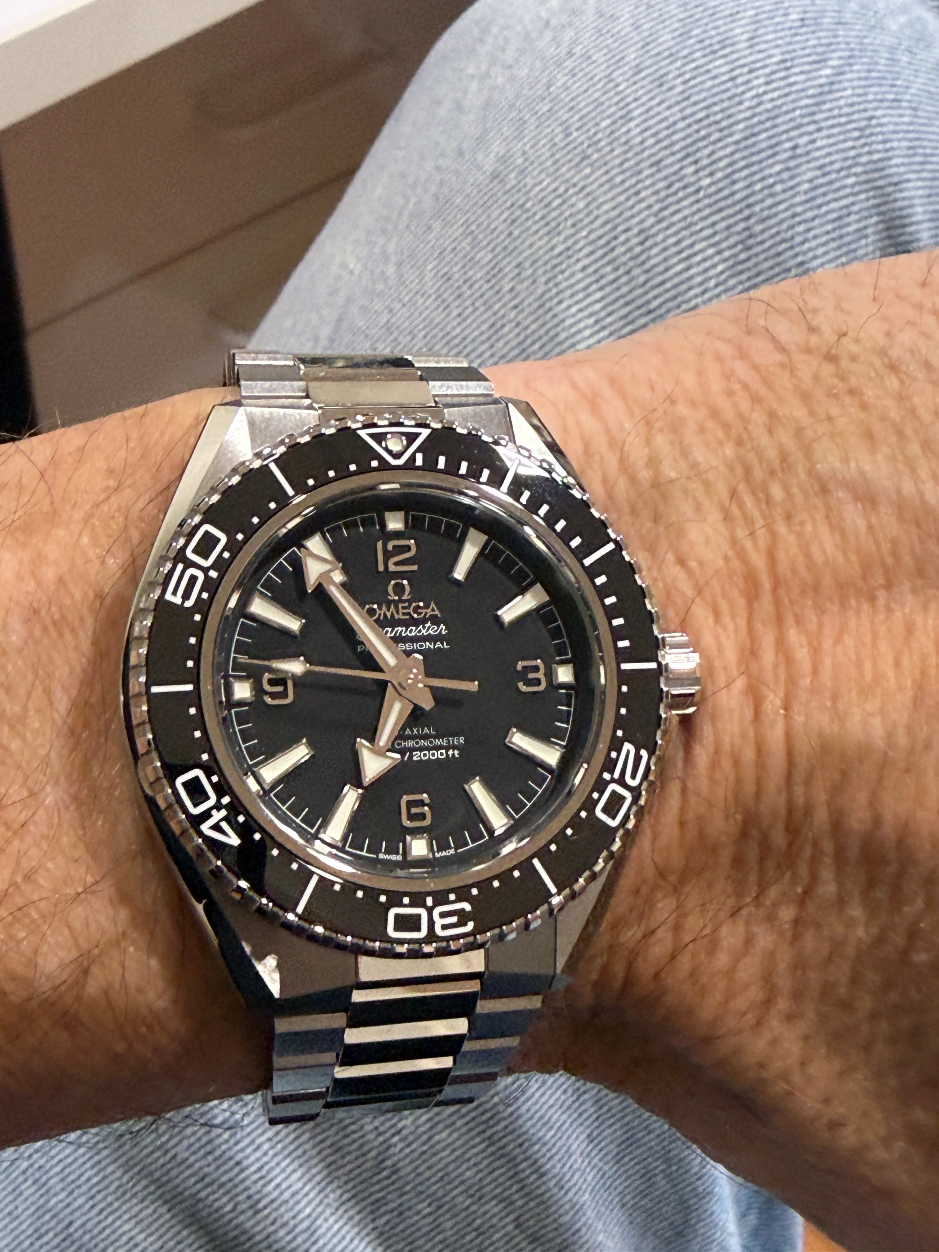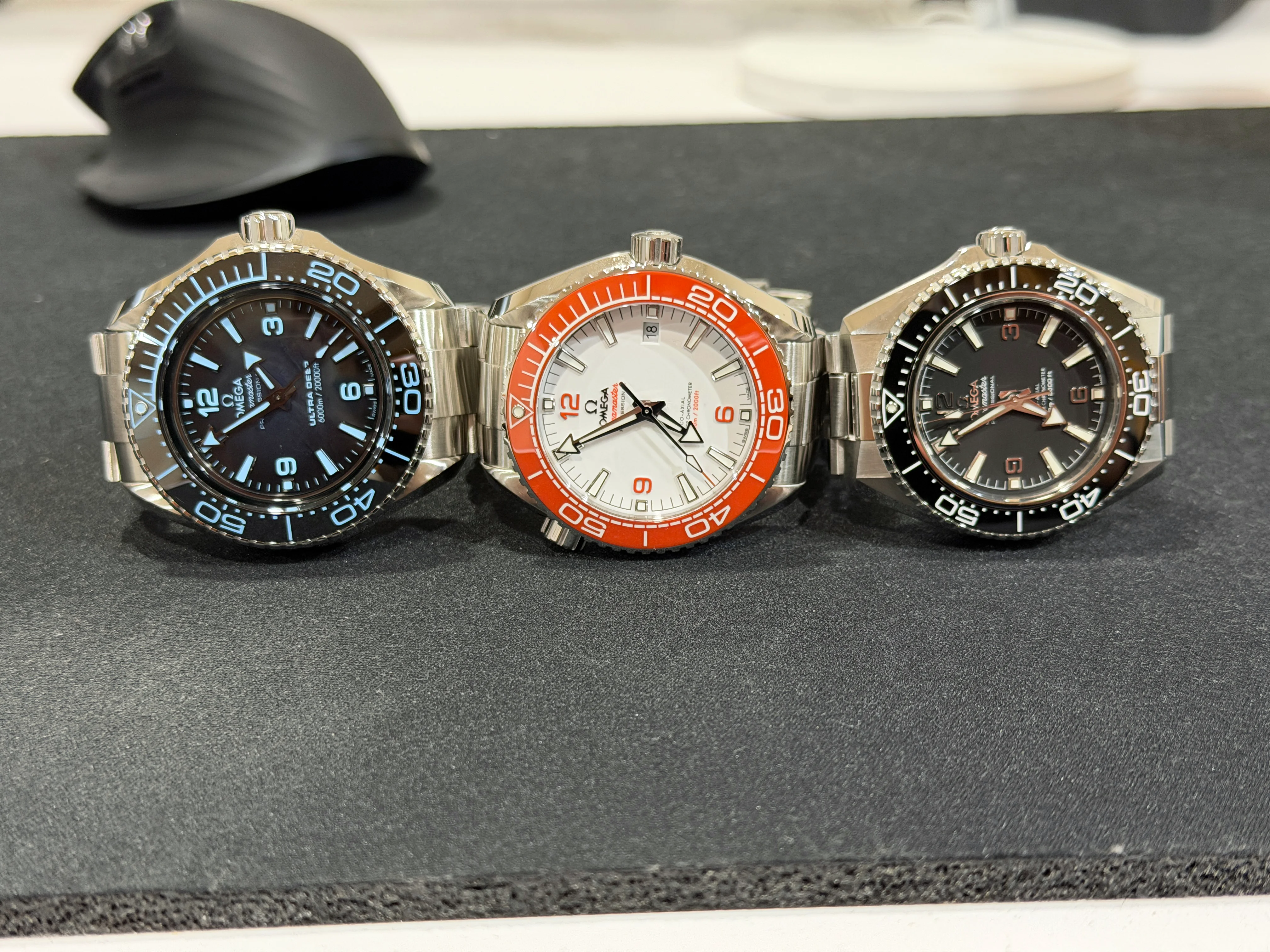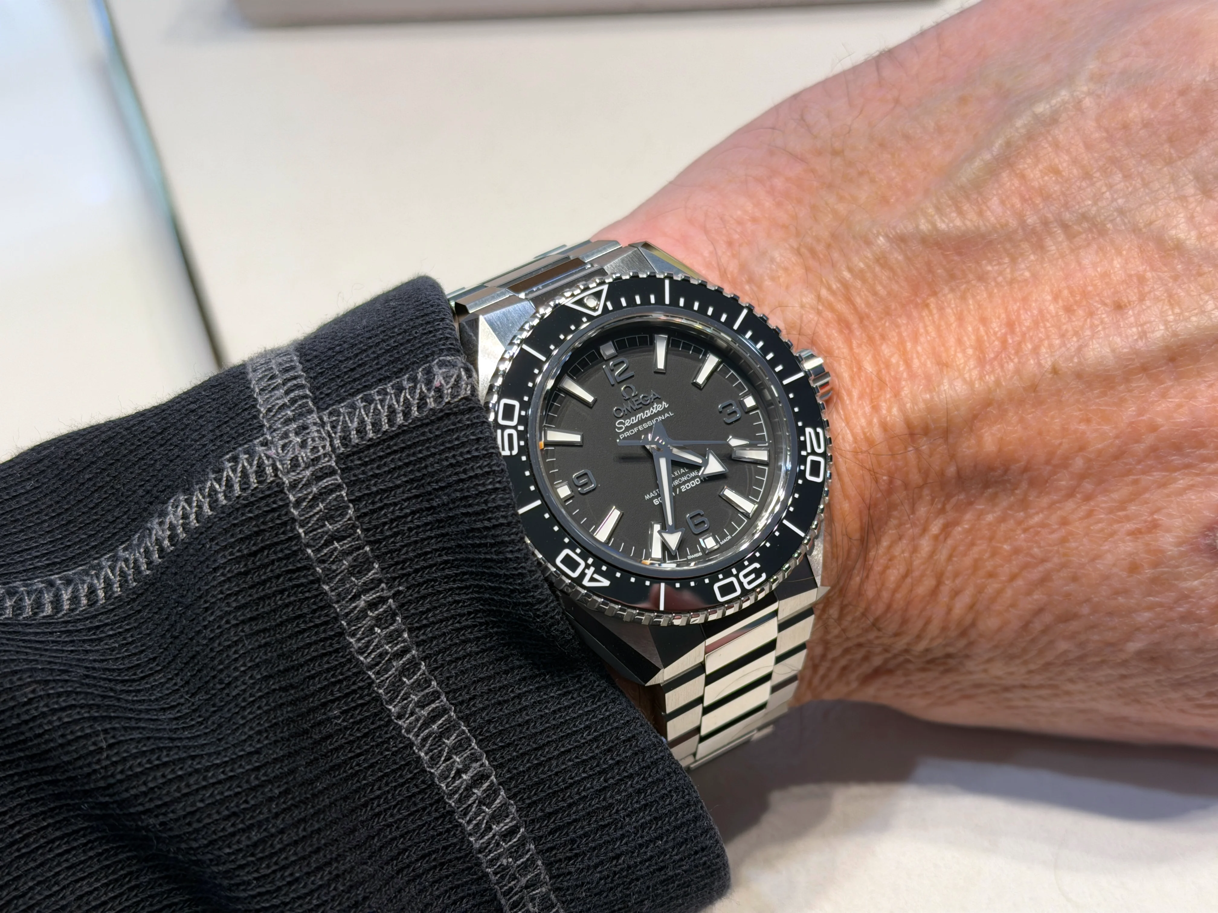 While I did try on the model with the blue bezel, on rubber strap, I did not grab any pics. But there are plenty online. The rubber strap was excellent, extremely comfortable. But the bracelet was way too nice and, at least for me, this was definitely the way to go. I truly think Omega did an amazing job with with this watch. And if you look at their website, they cleaned up the Planet Ocean line and have fewer models, at least for now. I think this is a good sign and can't wait to see what they do next.