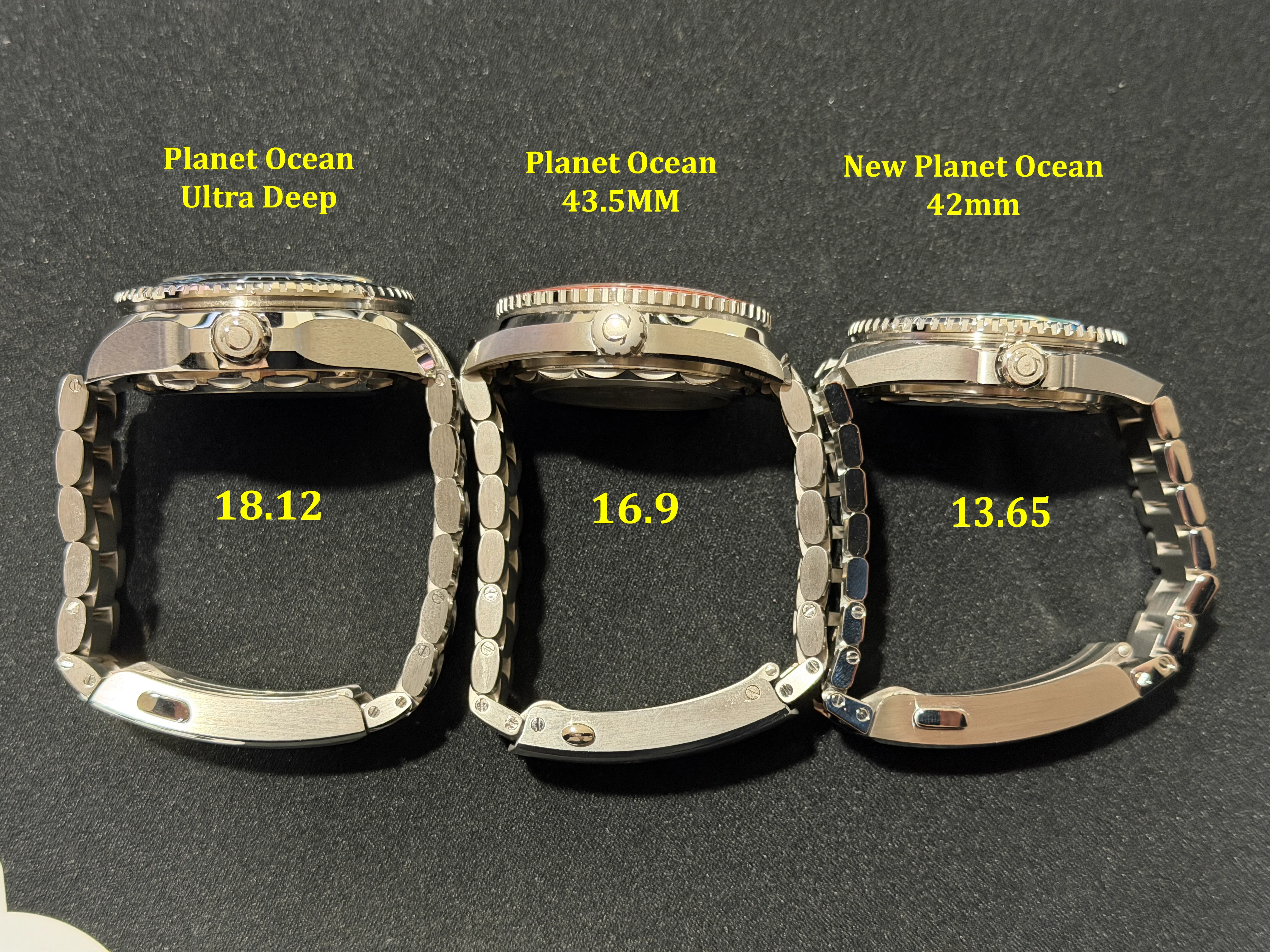 As pointed out my many people, one of the biggest changes is the thickness of the watch. They made it thinner by over two millimeters. Here is a thickness comparison between the Ultra Deep, the previous generation Planet Ocean and the new one.