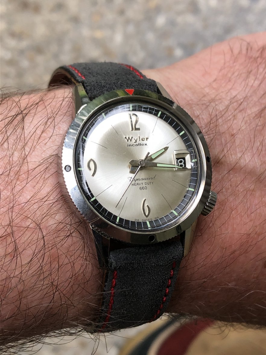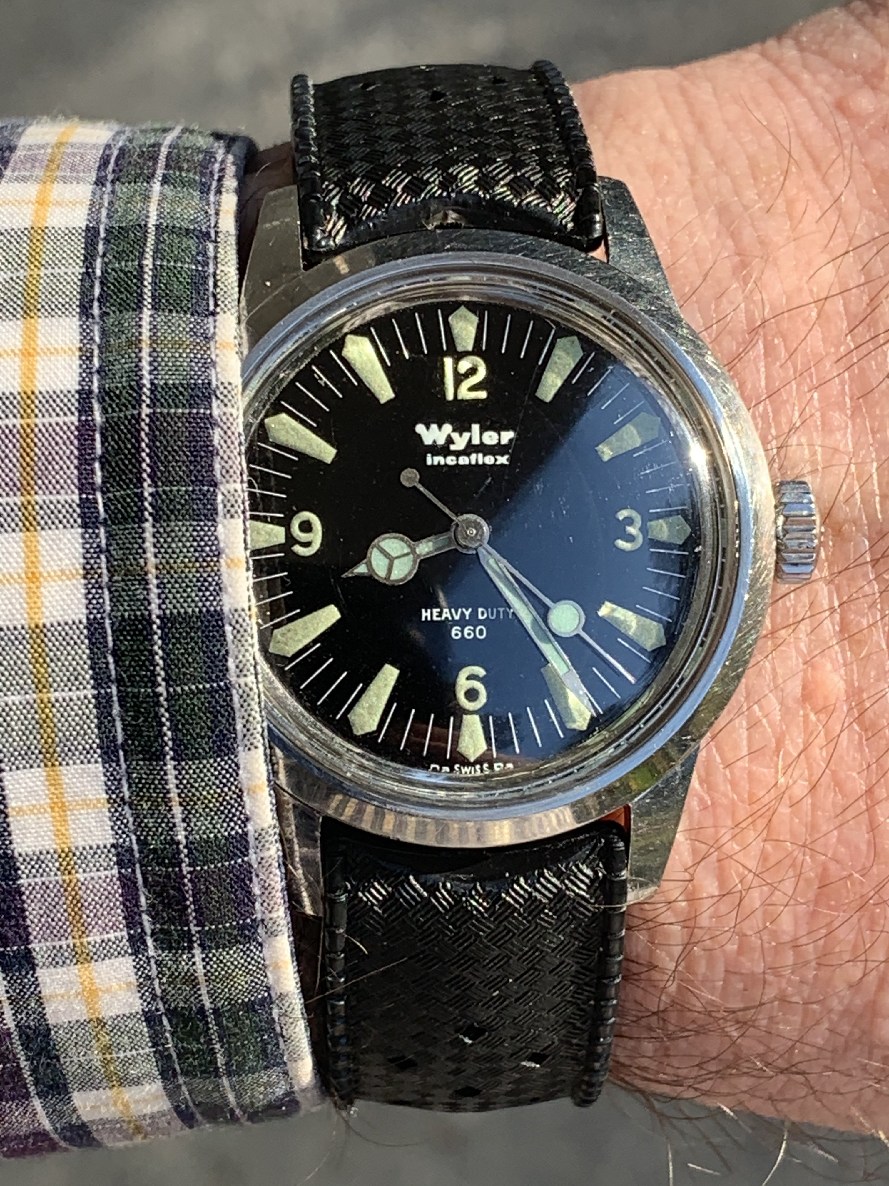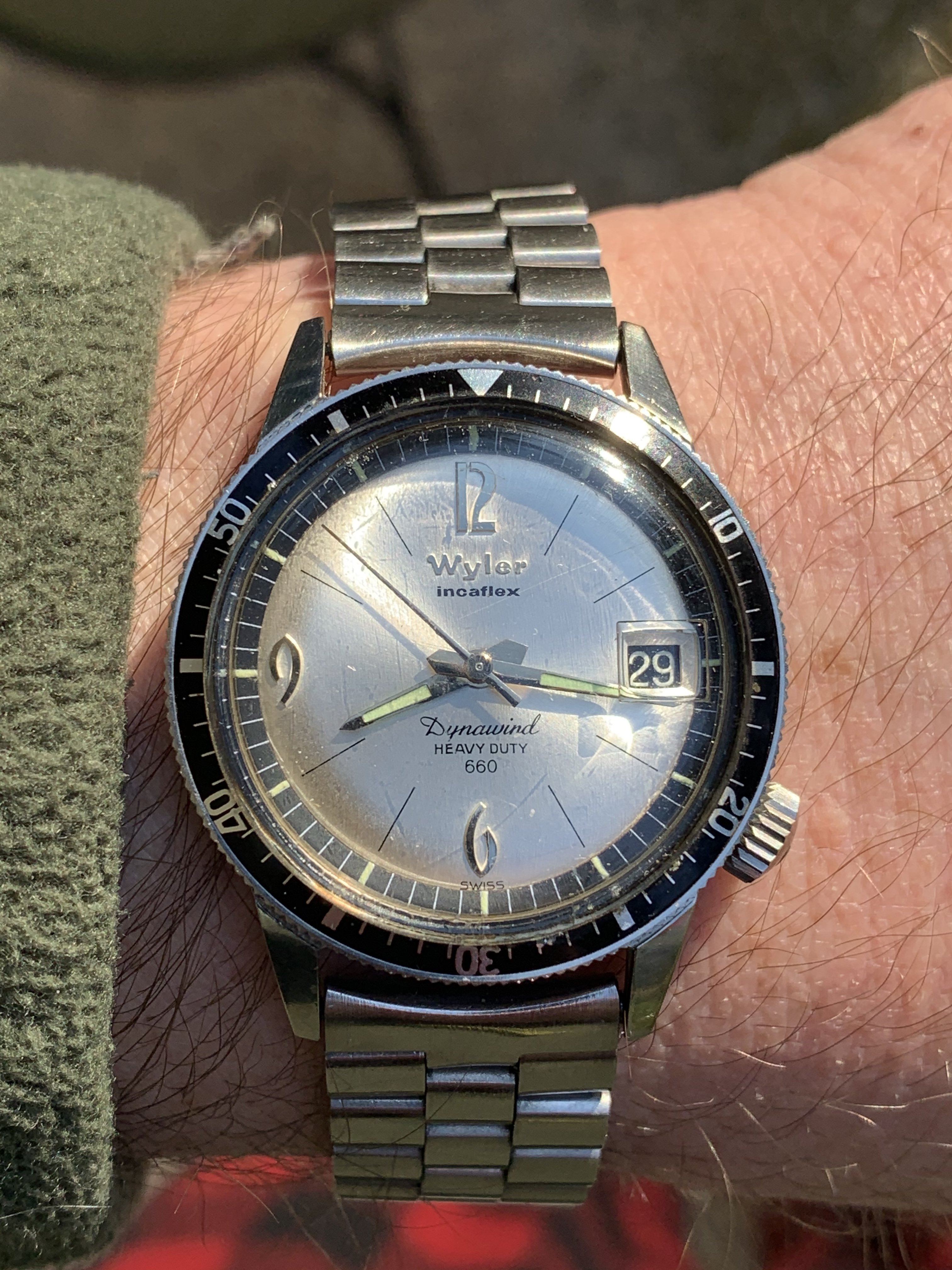 ·I saw this one for cheap today on eBay been wanting to try a vintage Wyler diver since some sell for a fair price. Saw this one for starting price 200 and buy now for 300 with three watching on eBay. This model I have not seen just the ones that sort of look like a vintage Rolex Explorer but this one the dial looks like a Omega 300 with a different style bezel ring. I said screw it lost one last week in a bidding war 300 is cheap. I guess a service and that strap has to go and replaces with a tropic strap. Hoping the lume is in better shape hope the seller just takes crappy photo's.