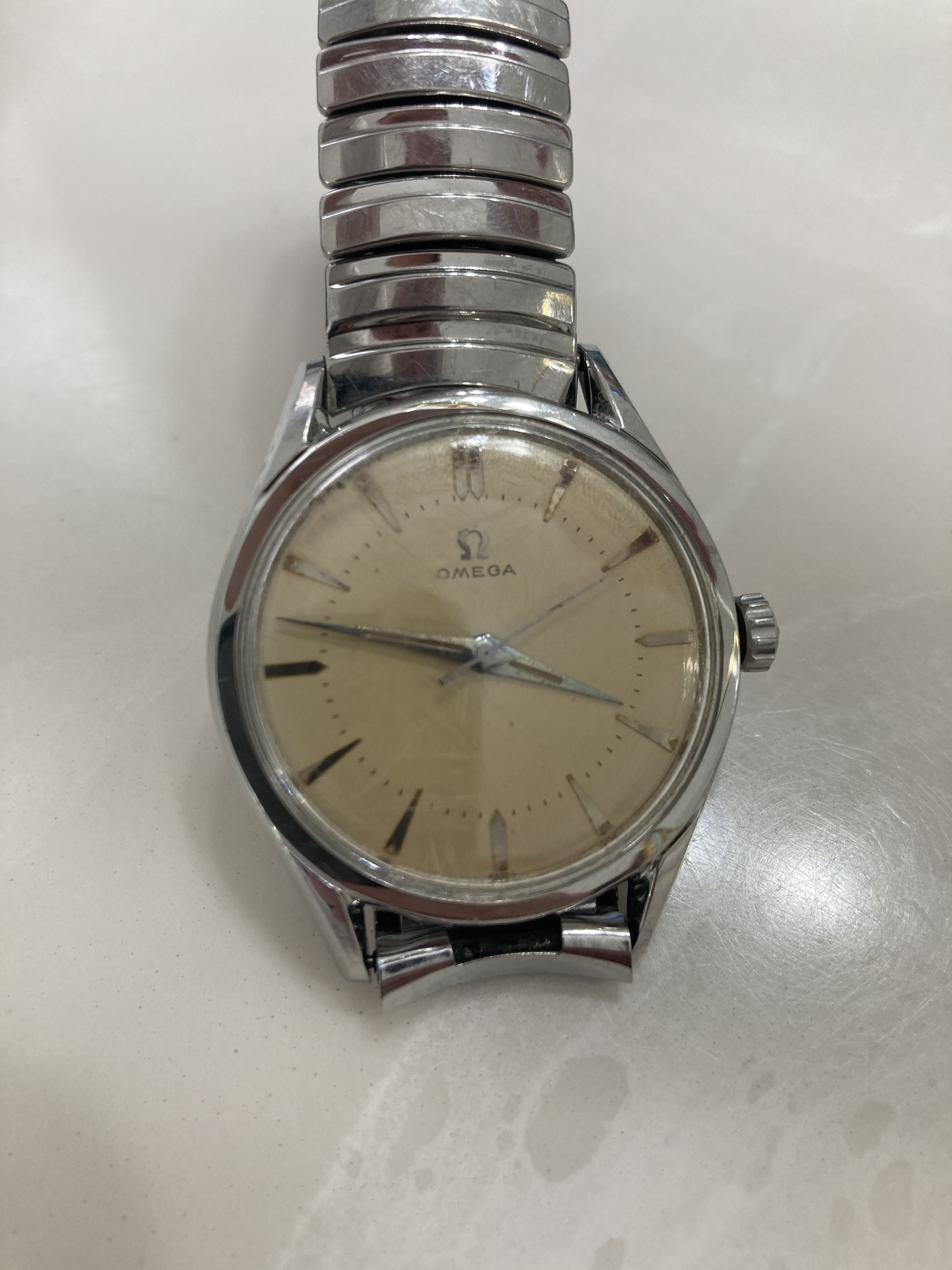 Hard to tell without better photos including the movement and inside of the case back, but it looks legit to me. I would guess maybe an early 60's Seamaster reference, some of which did not have the Seamaster text on the dial. Interesting bracelet, which looks like a stretch model of some type, and which I assume is not original to the watch. If the watch is legit, the dial has aged beautifully.