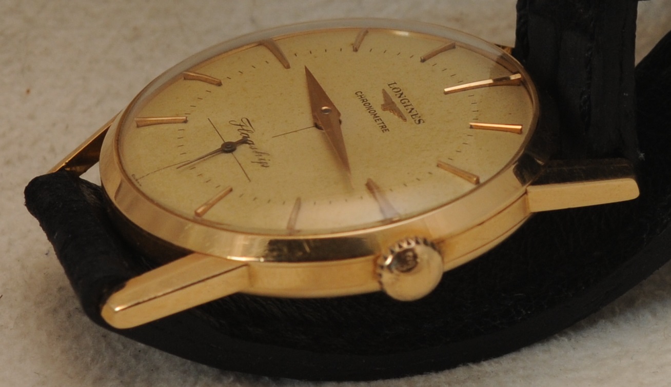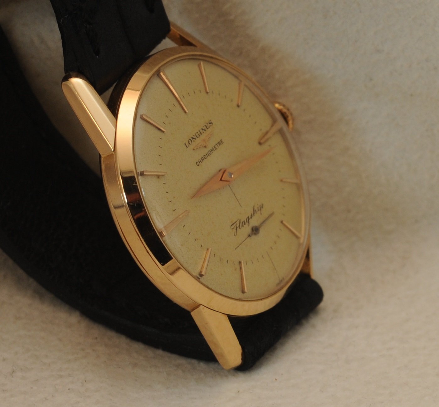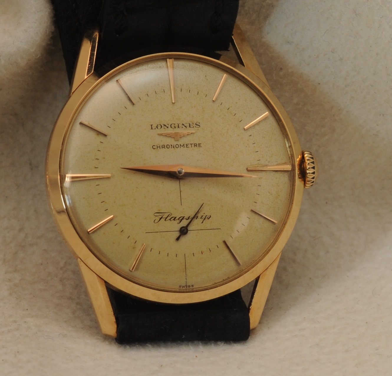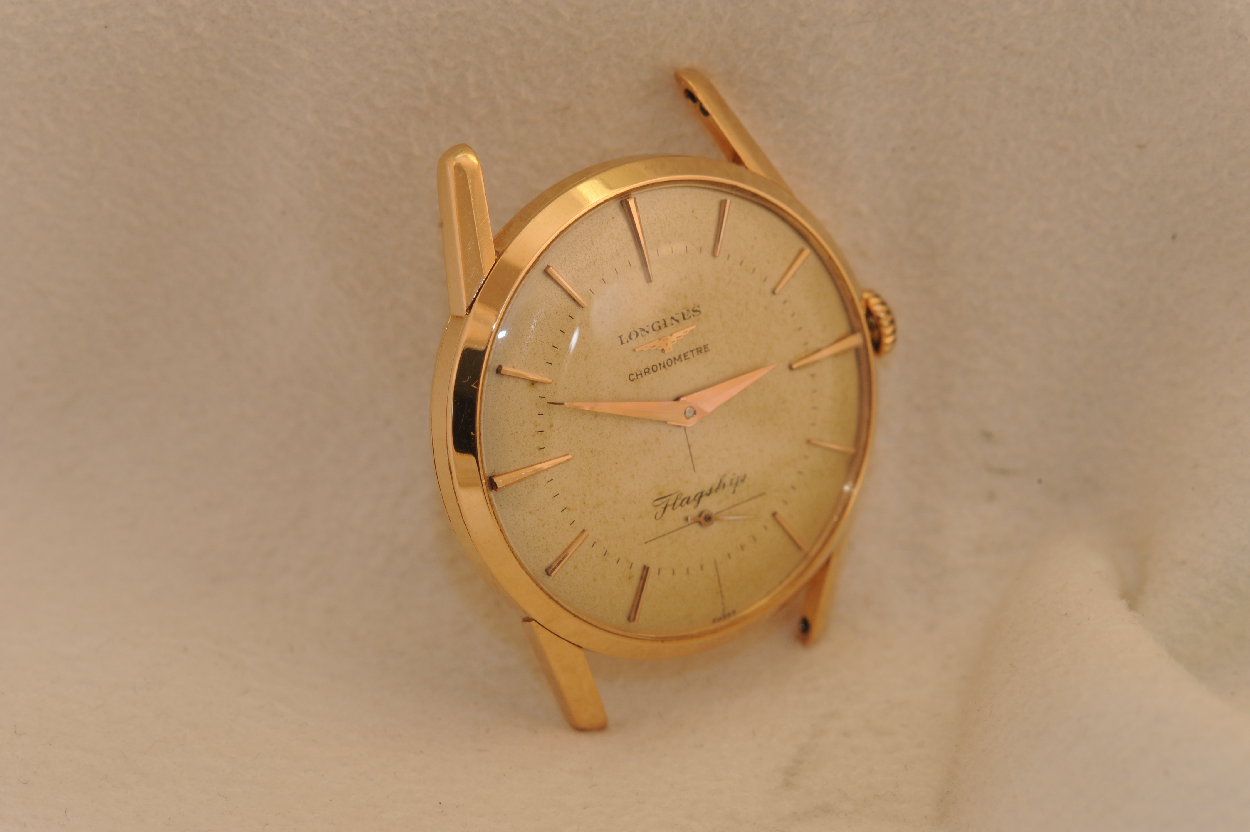 Dial flaw: Cardinal marker at 3:00 appears to have been glued to dial. Difficult if not impossible to visualize with naked eye, easy to see under magnification. It really jumps out in the pics--as do most flaws.. the marker is well positioned in the vertical plane, and perhaps a hairs breadth closer to the case (in the horizontal plane) than it's partner at 9:00.