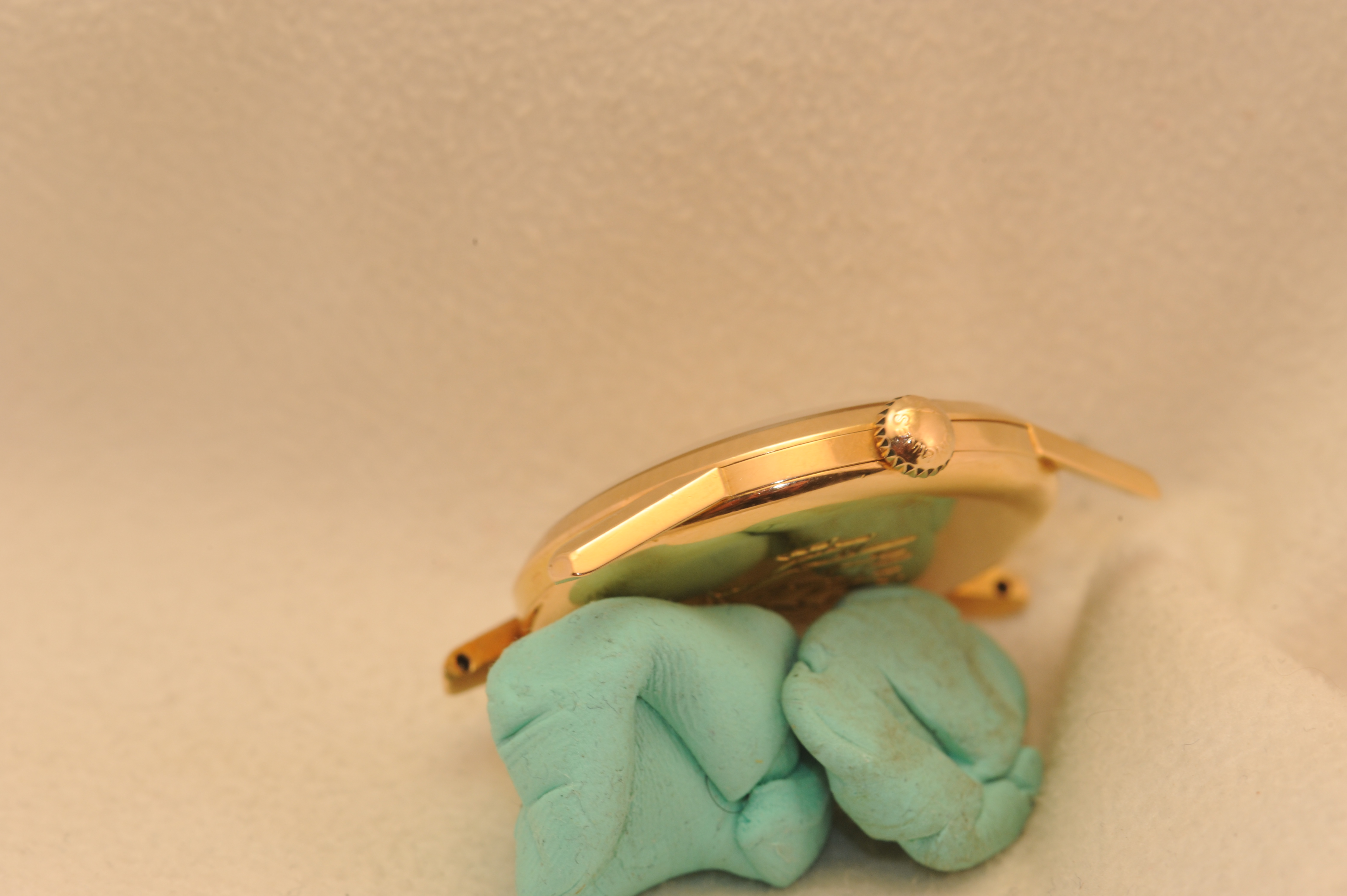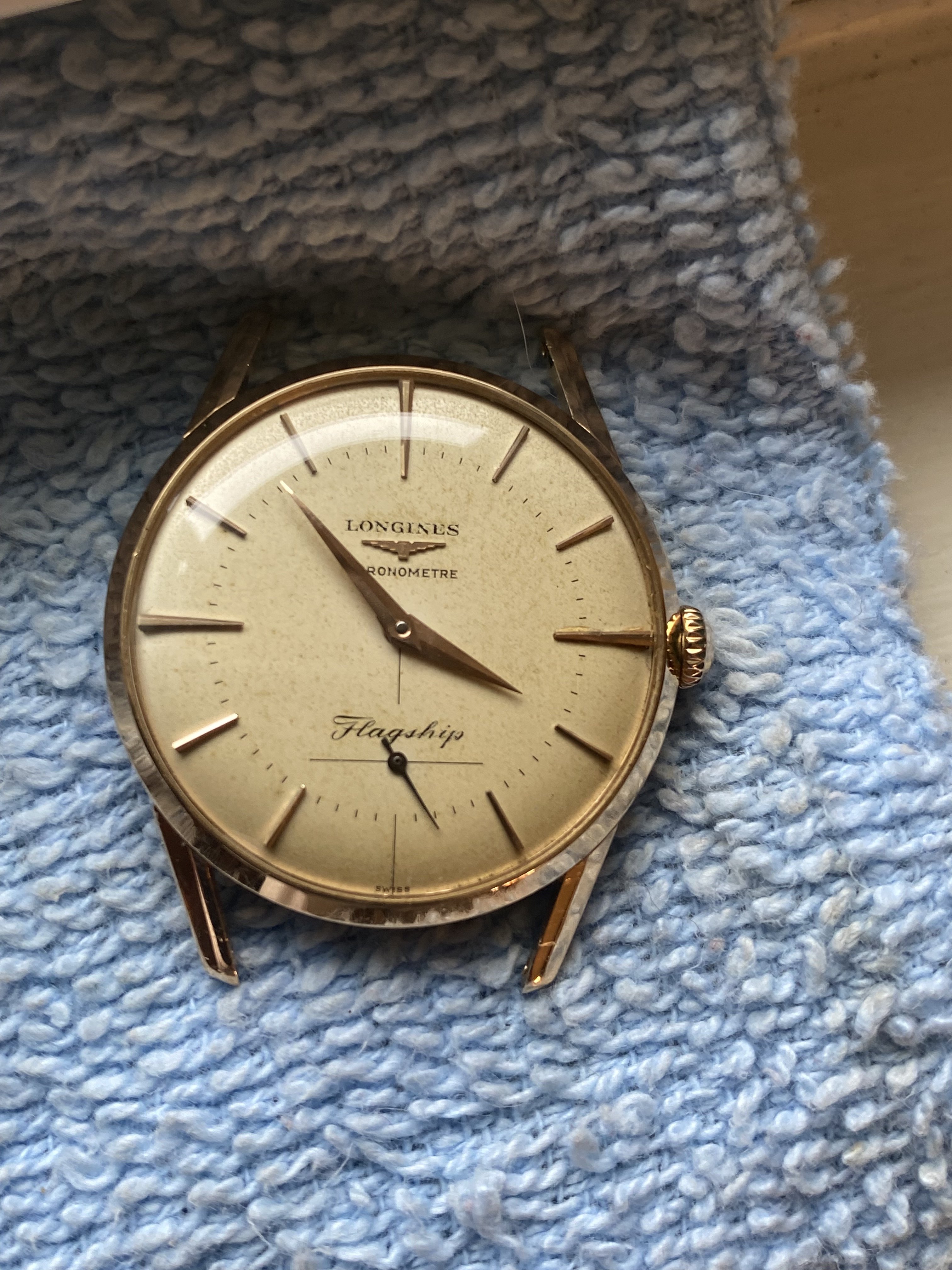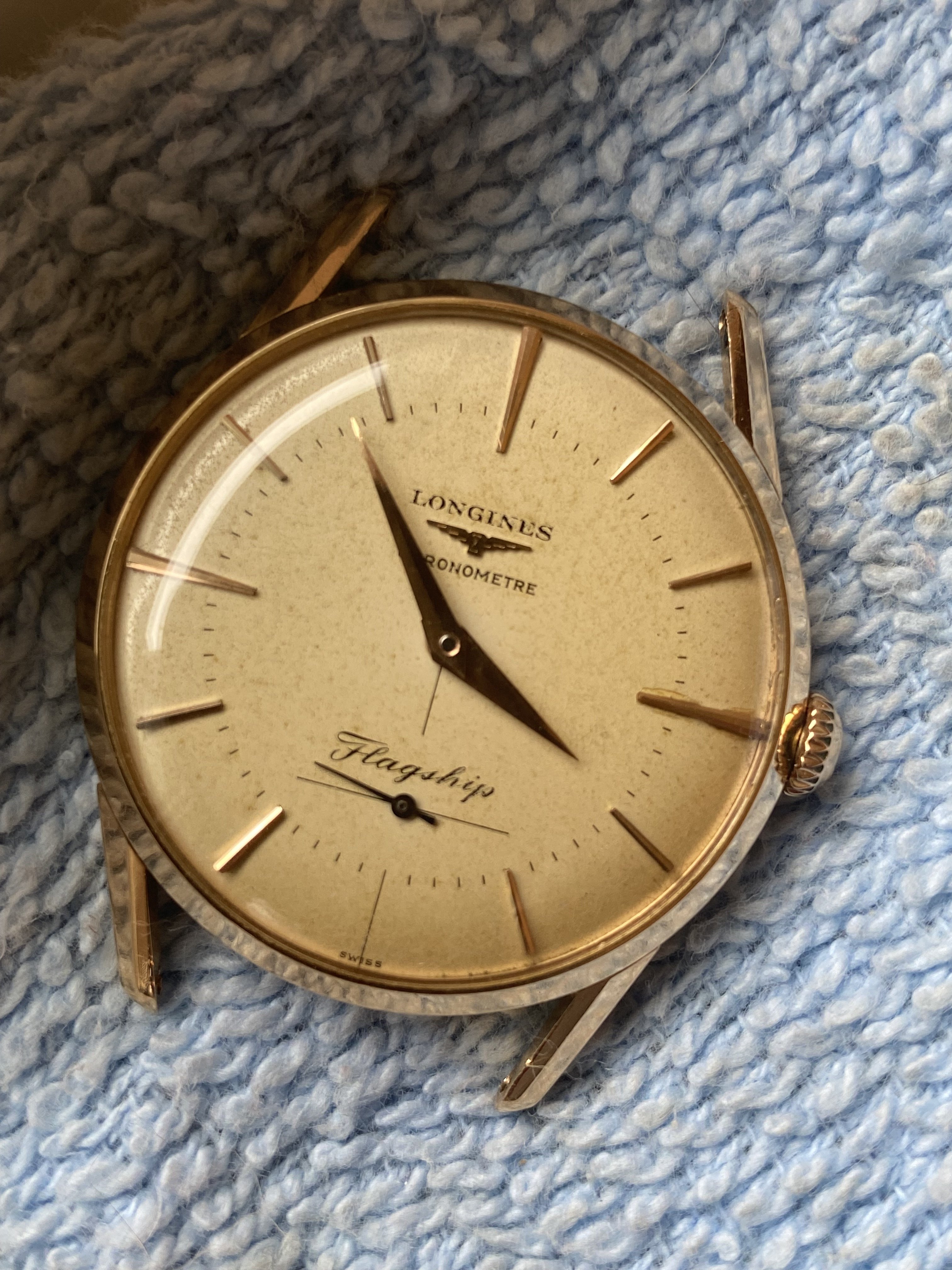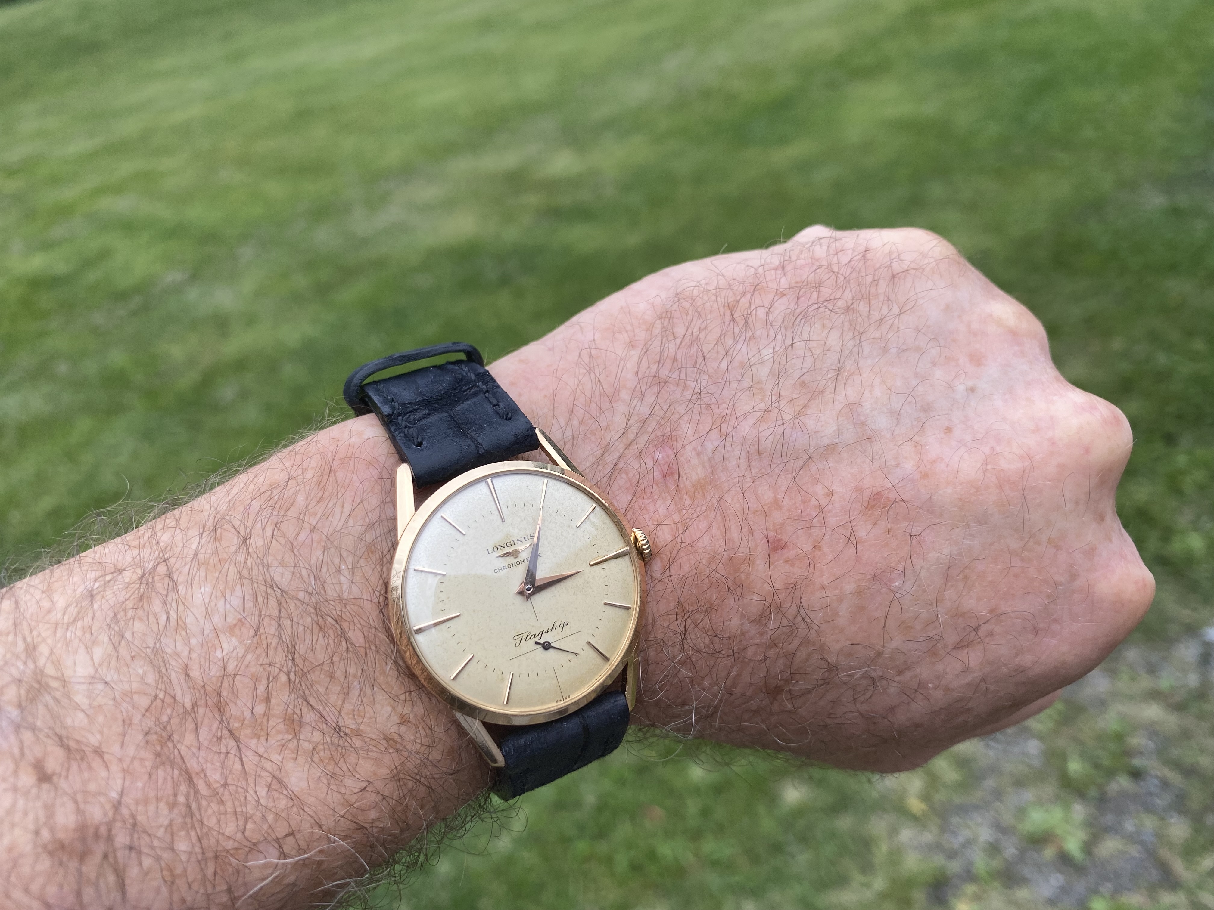 Dial flaw: Cardinal marker at 3:00 appears to have been glued to dial. Difficult if not impossible to visualize with naked eye, easy to see under magnification. It really jumps out in the pics--as do most flaws.. the marker is well positioned in the vertical plane, and perhaps a hairs breadth closer to the case (in the horizontal plane) than it's partner at 9:00.