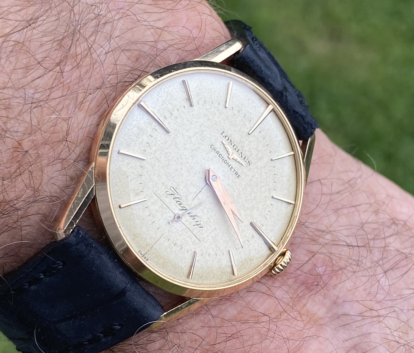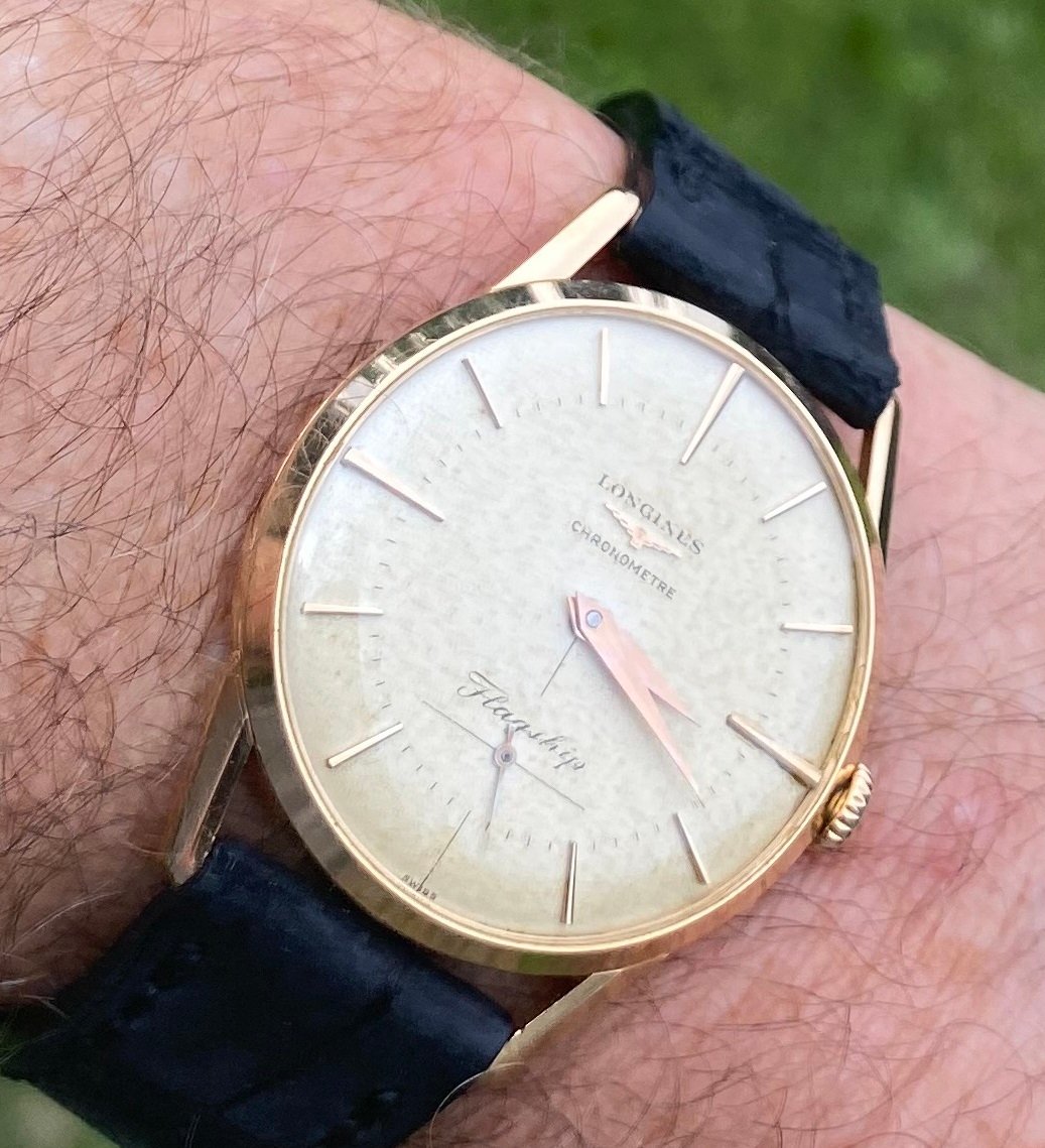 Dial: A stunning and homogenous "parchment" patina. Pink gold markers in good shape. Hour and minute hands excellent. Seconds hand looks as if it were plated and looks like a combo of gold and ss. I can only see this under loupe.