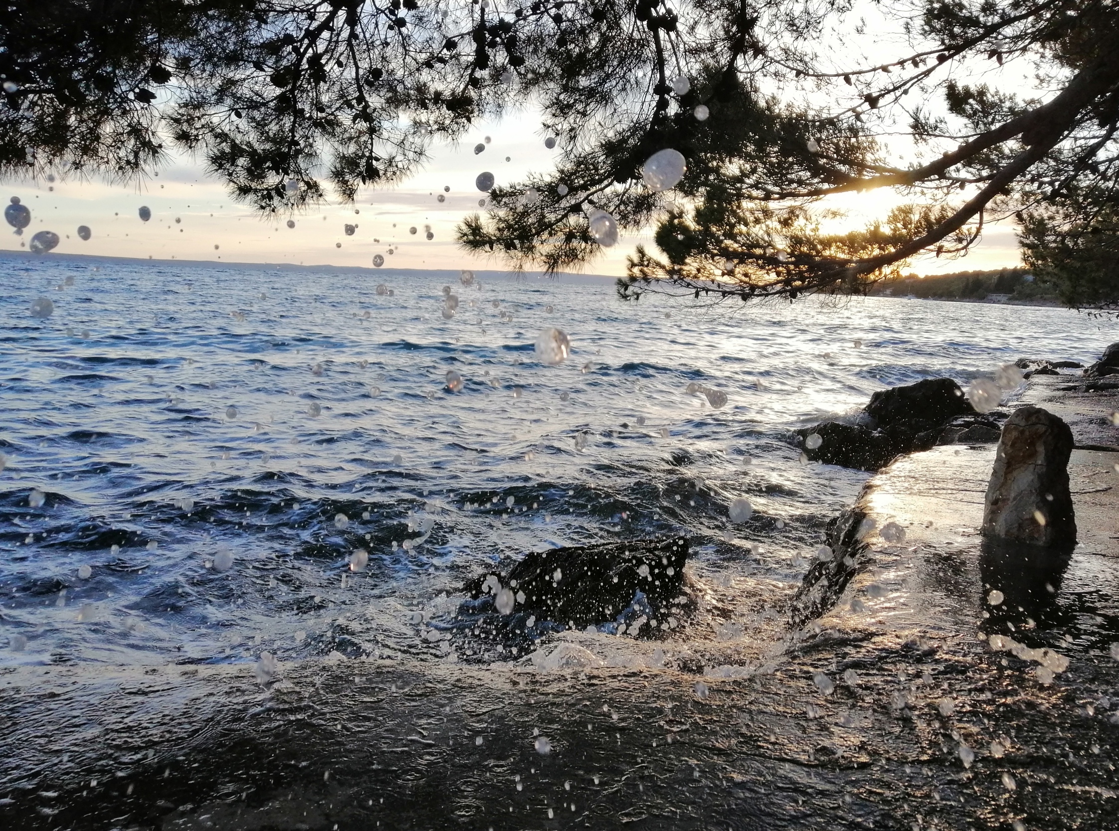 Love that "action shot" of waves lapping. Is much larger in scope than a photograph I took with a cheap digital camera of a section of the shoreline of our place on the lake. It's large acreage and Mrs. noelekal and I had hiked to the far end and rested on some rocks, sticking our bare feet in the water in the late afternoon one hot July day. It was 100F that afternoon, but cool under the shade of the overhanging trees with the breeze blowing in our faces from the southeast over the water. Your photograph was taken with camera pointing the same direction on the compass and at near the same time of day and same time of year.