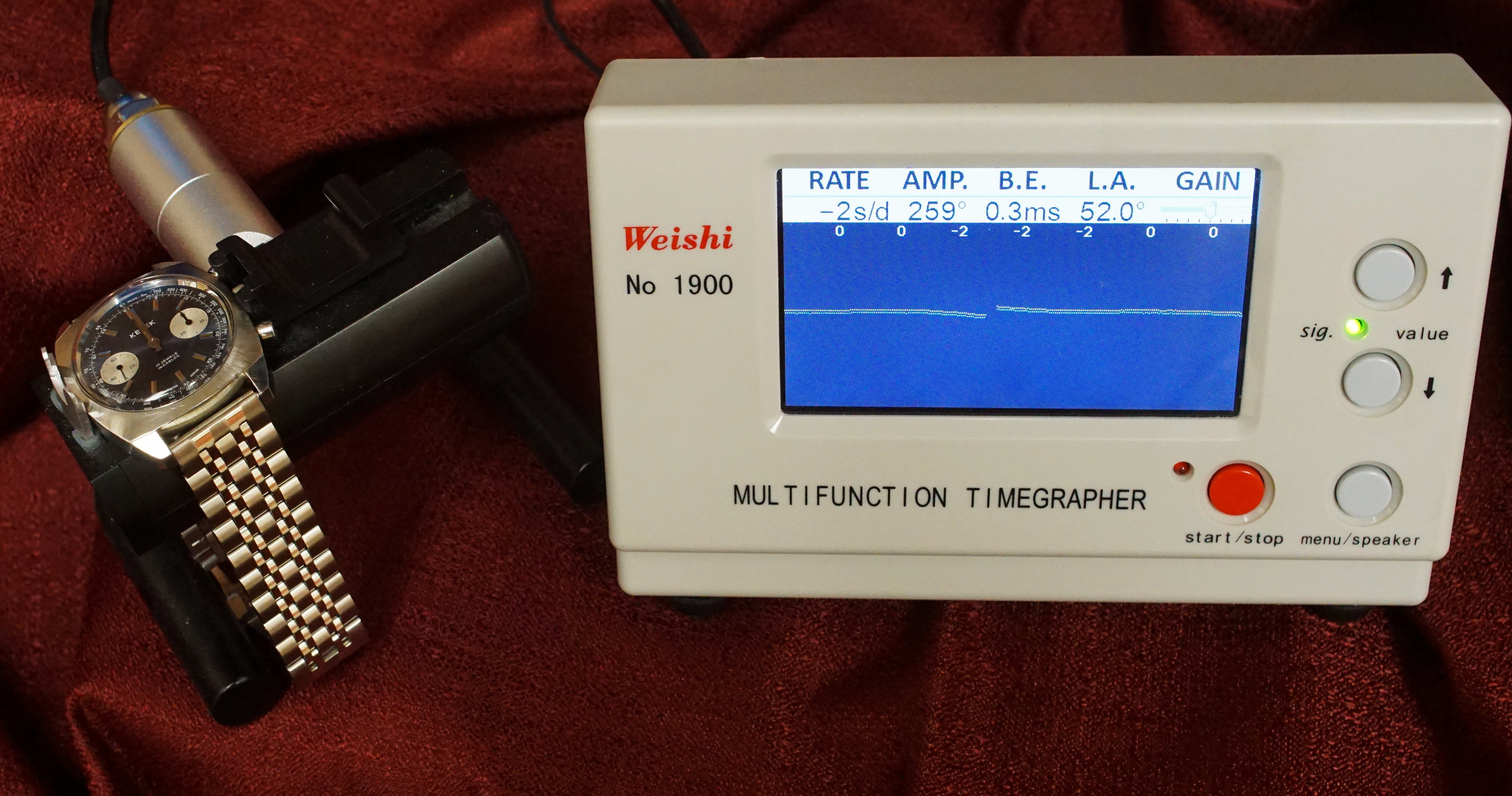 Timegrapher 1900 readings in dial up position: 0 to -2 seconds a day; 259 degrees of amplitude; 0.3 milliseconds of beat error; 48 degrees lift angle