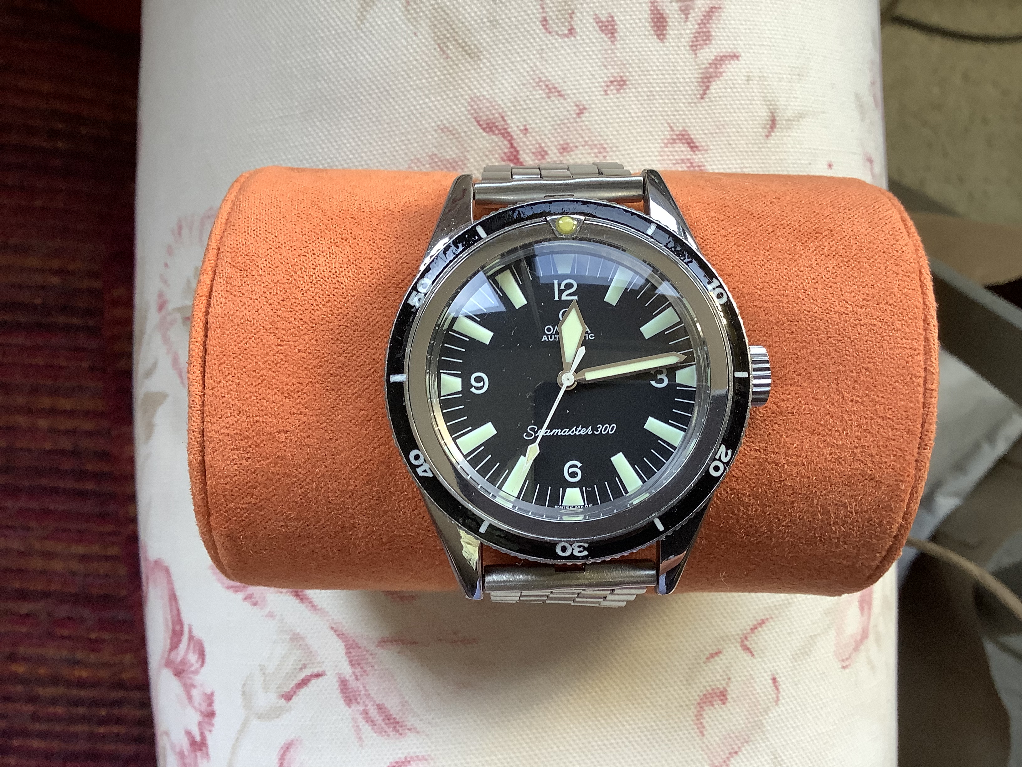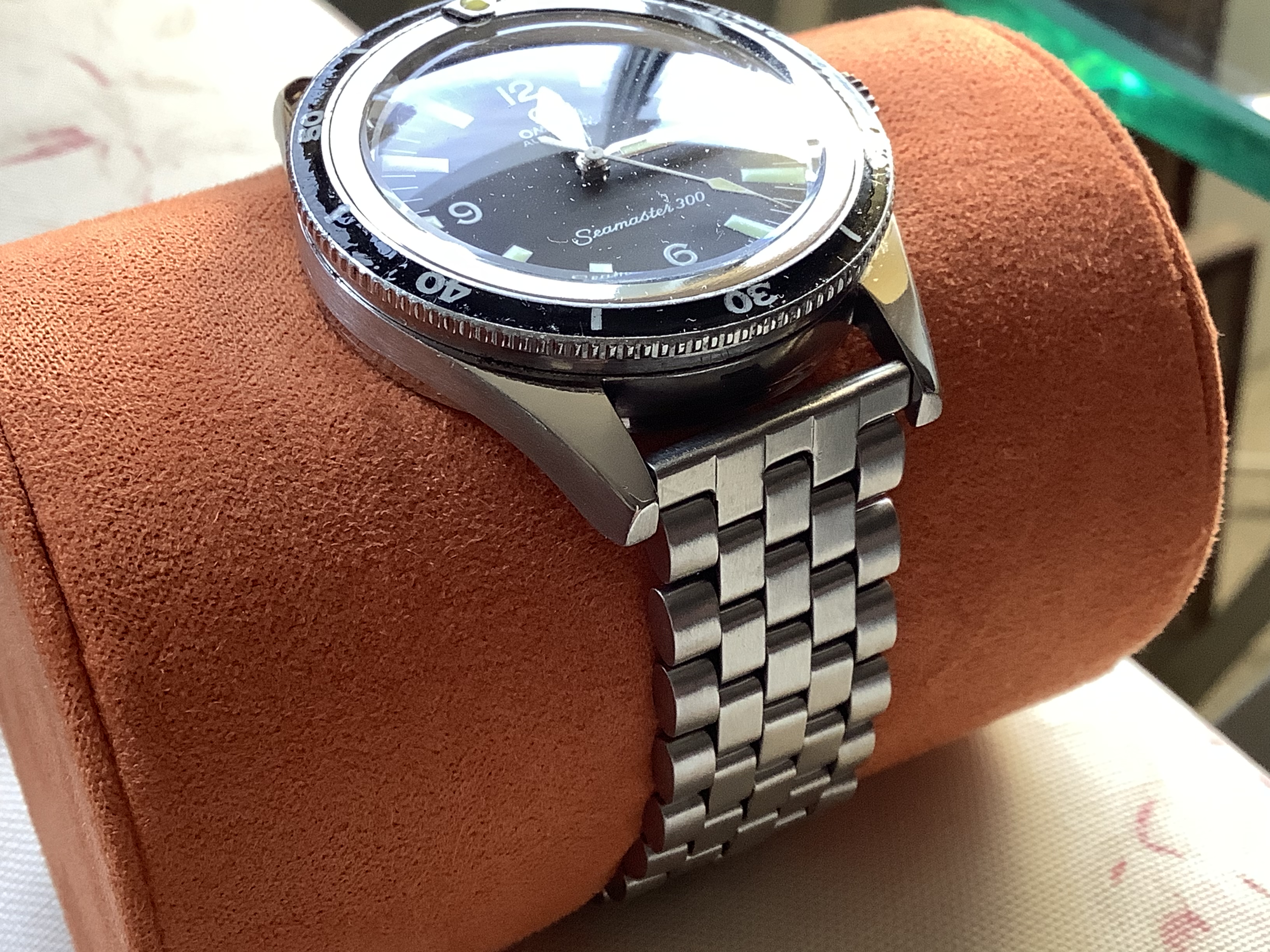 Here’s a Frankie Seamaster 300 with flat lugs. It’s got a mash up of many different parts from different eras and references, but it’s fun and comfortable to wear, and really easy to read.