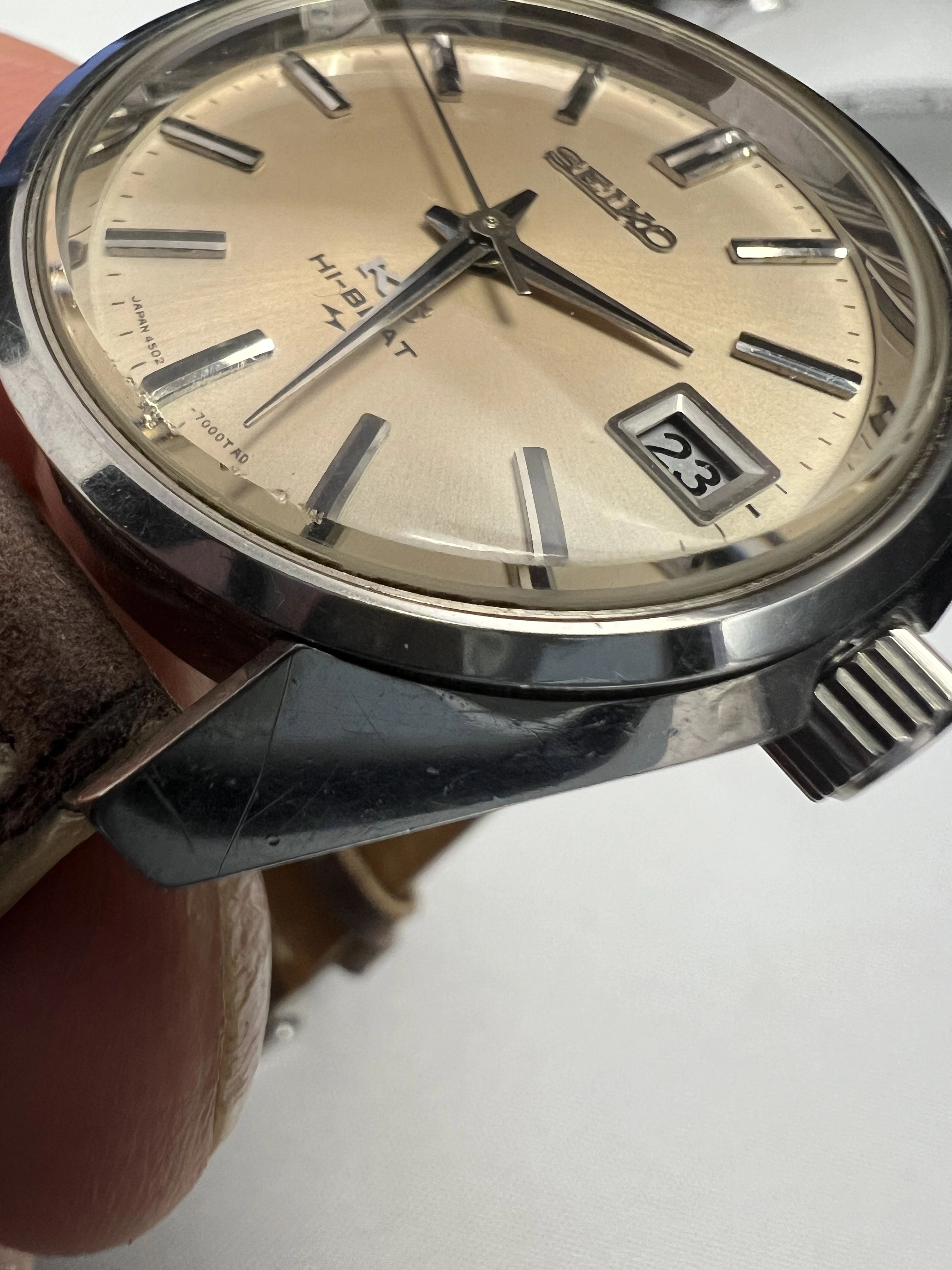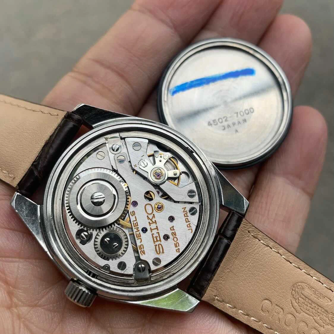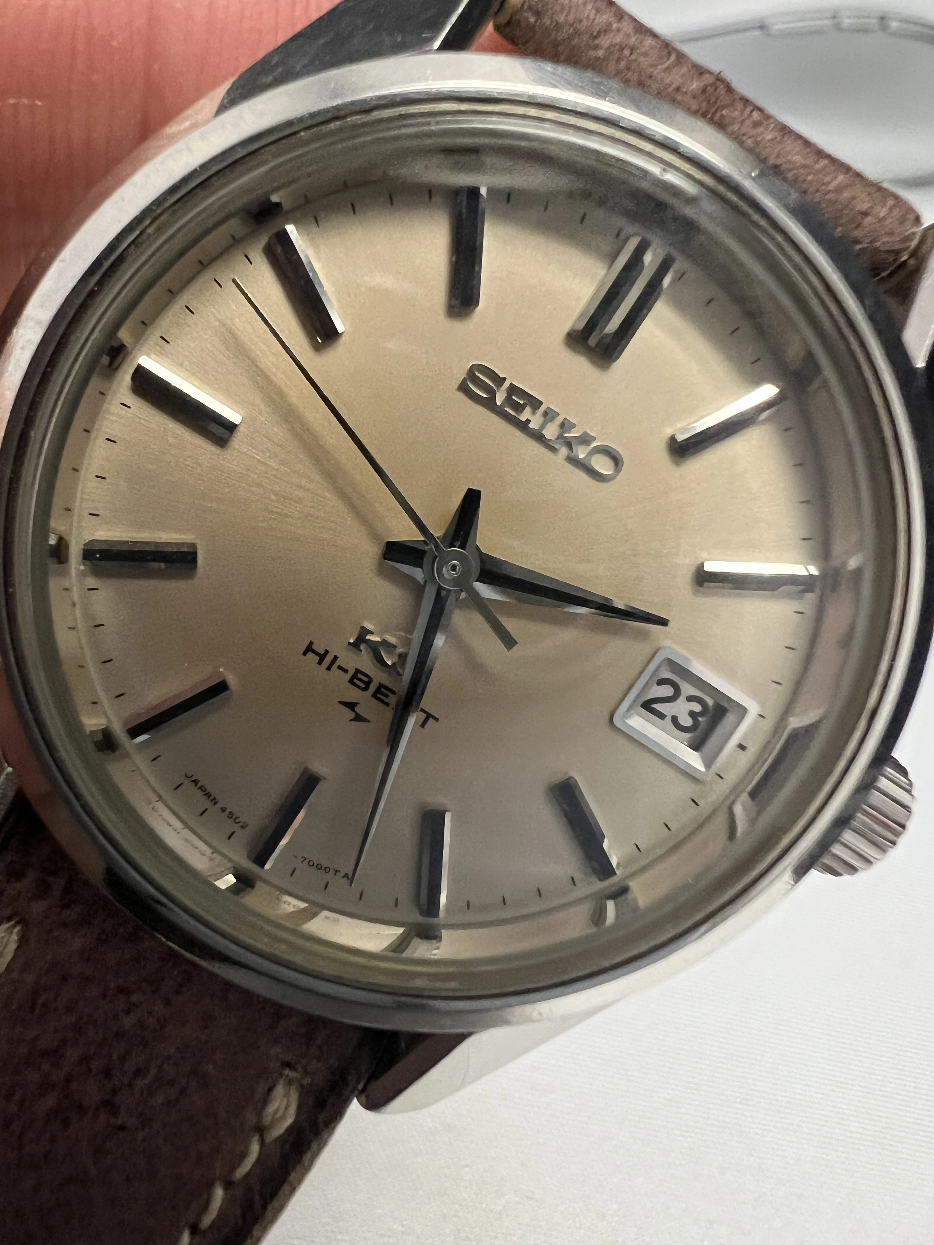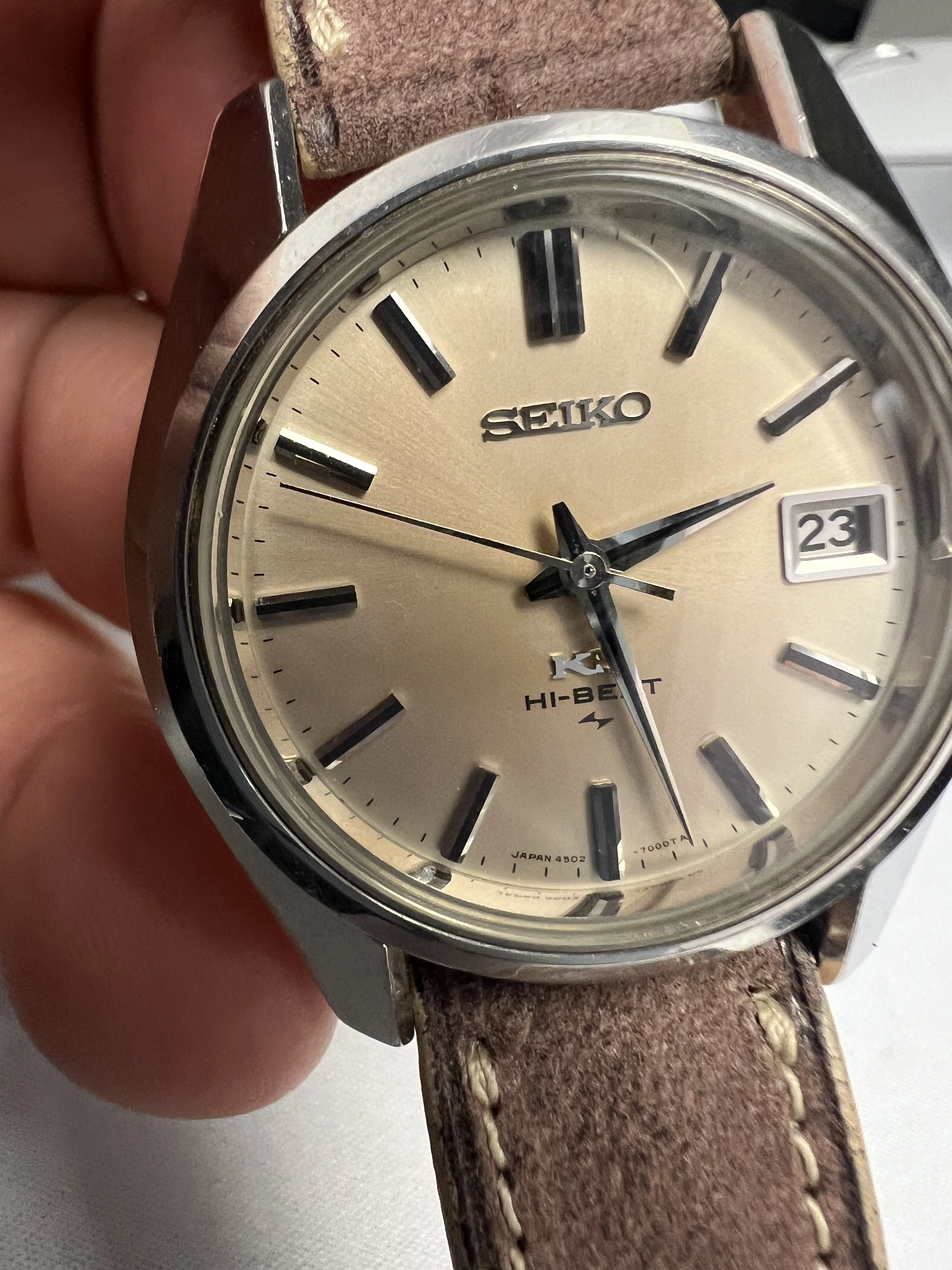 路King Seiko HI-Beat 4502-7000 watch, Vintage from 1969. 36000 bph watch. Manual winding caliber 4502a movement with 25 jewel. Original Seiko white dial with uniform pink patina, no marks or scratches dial is excellent.