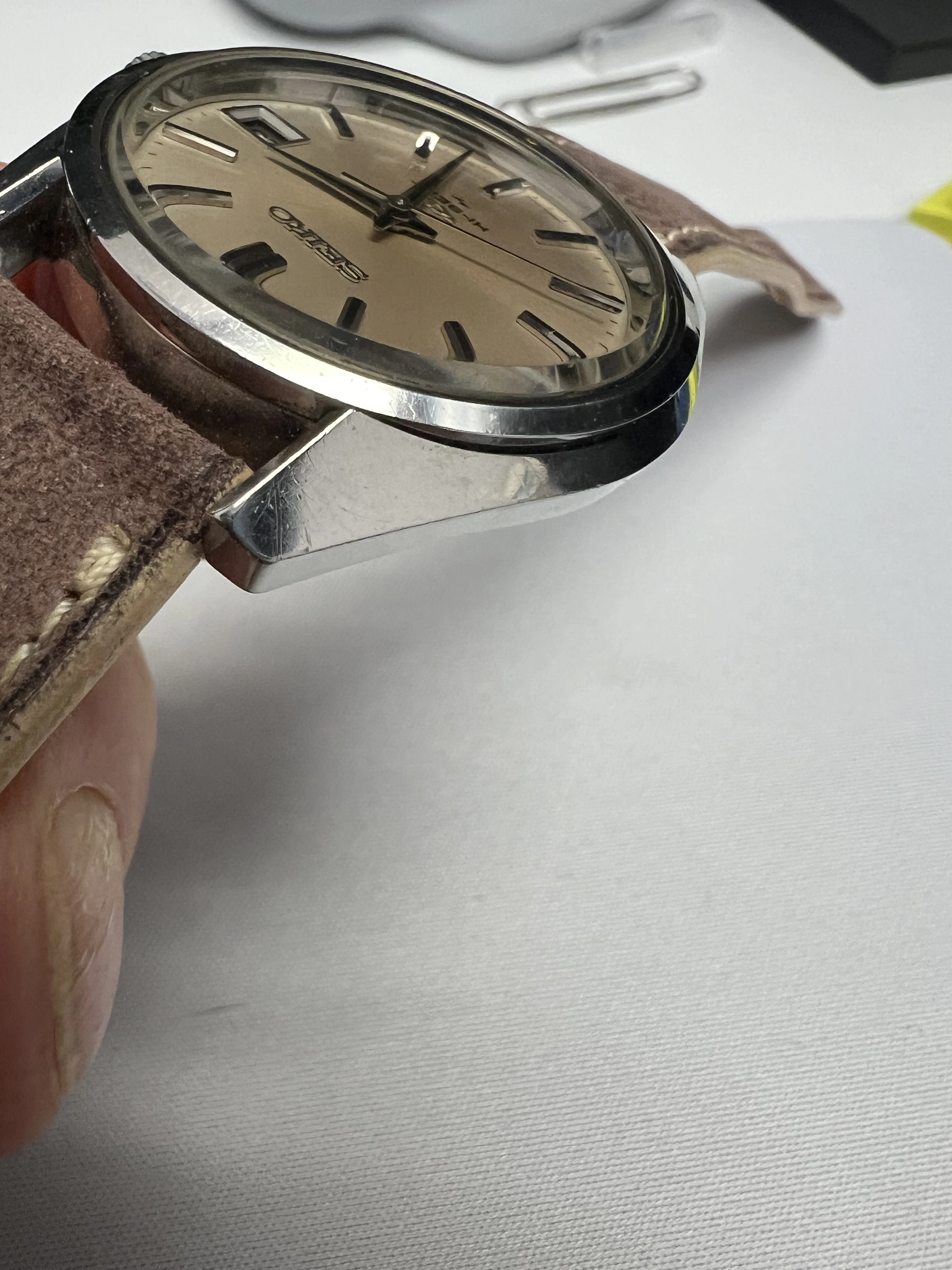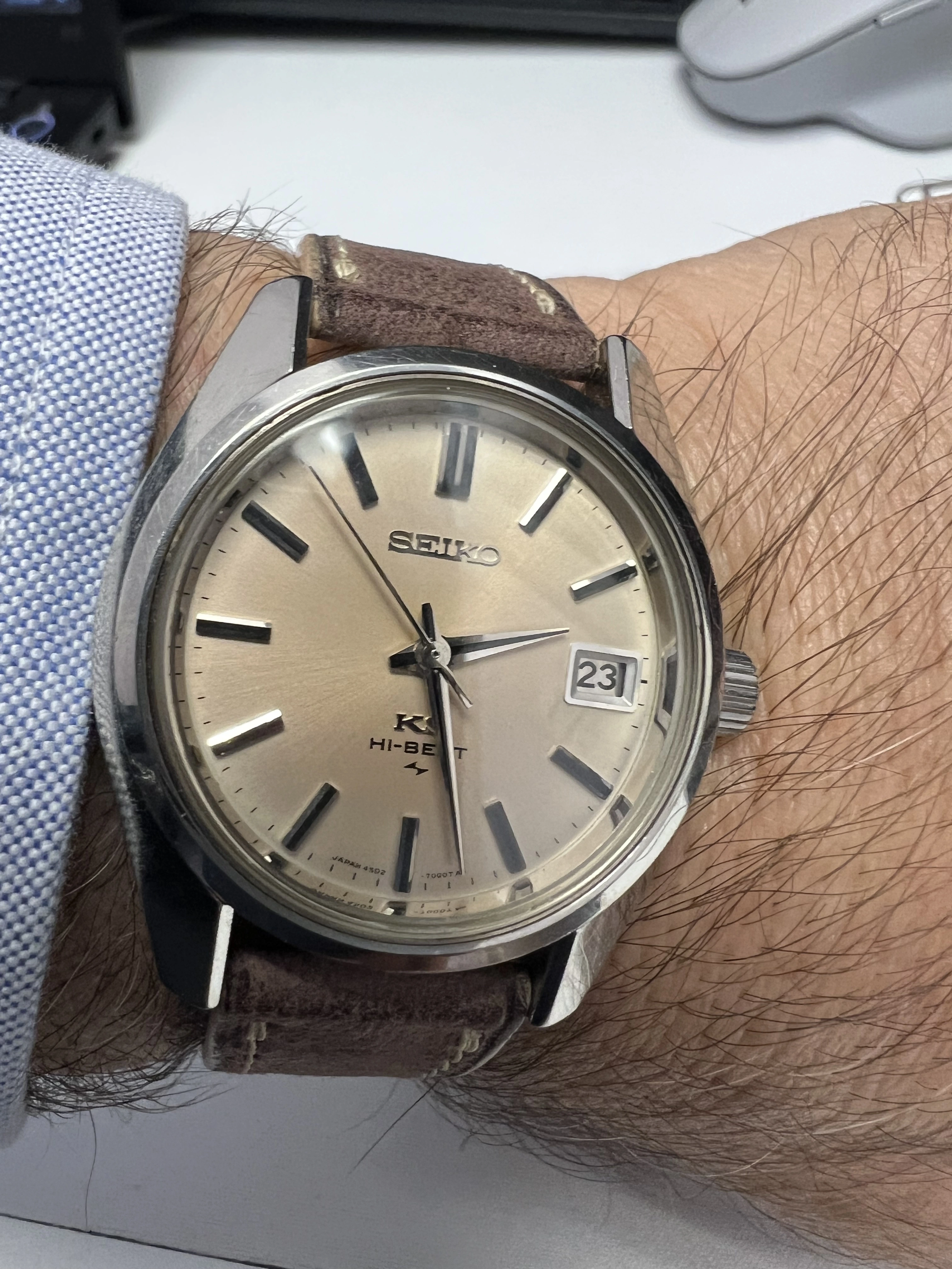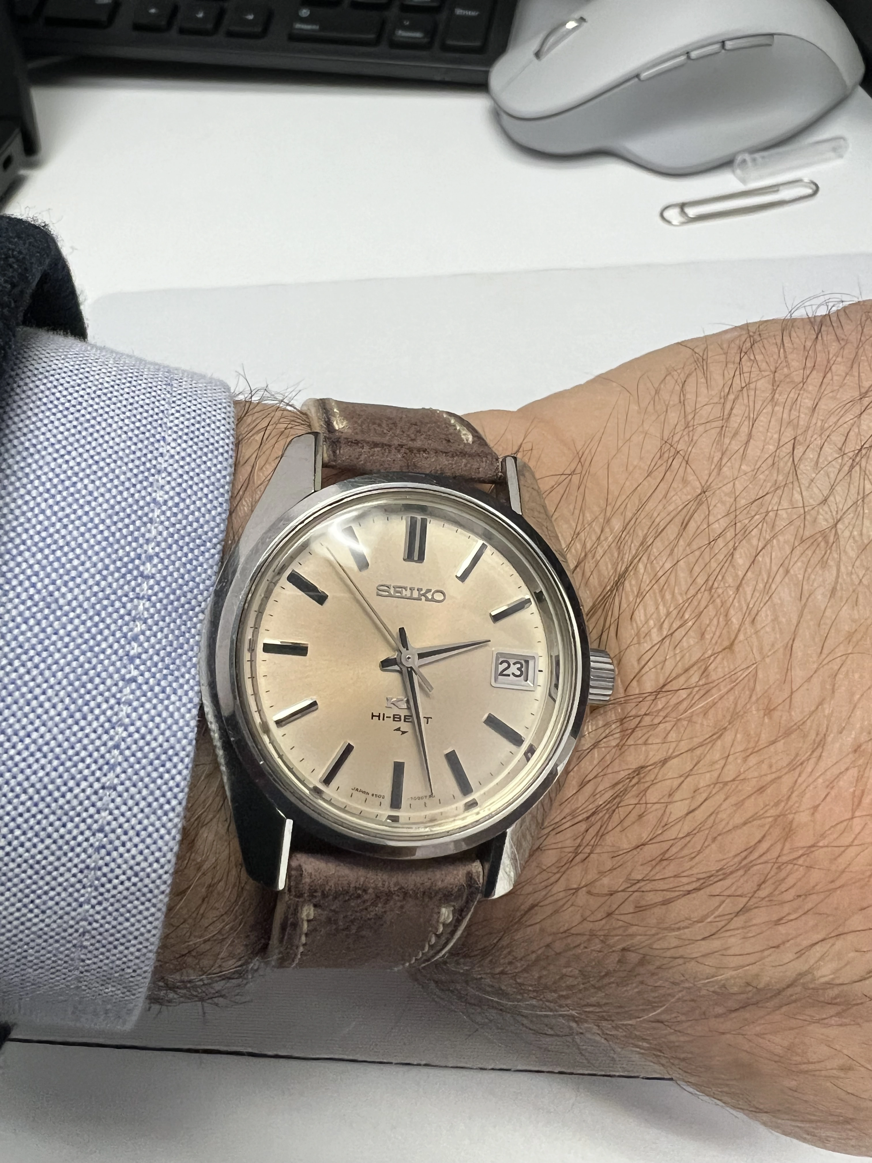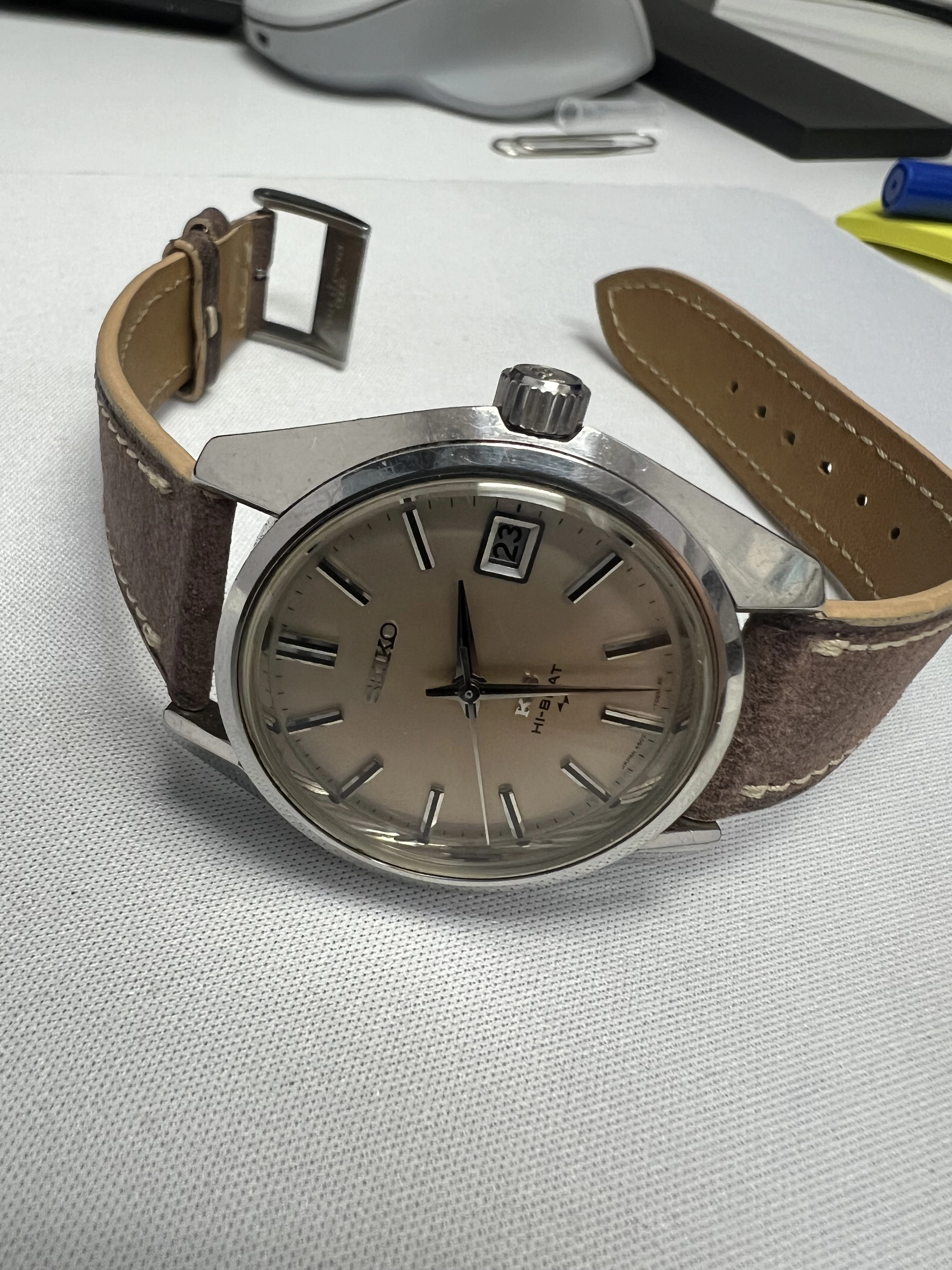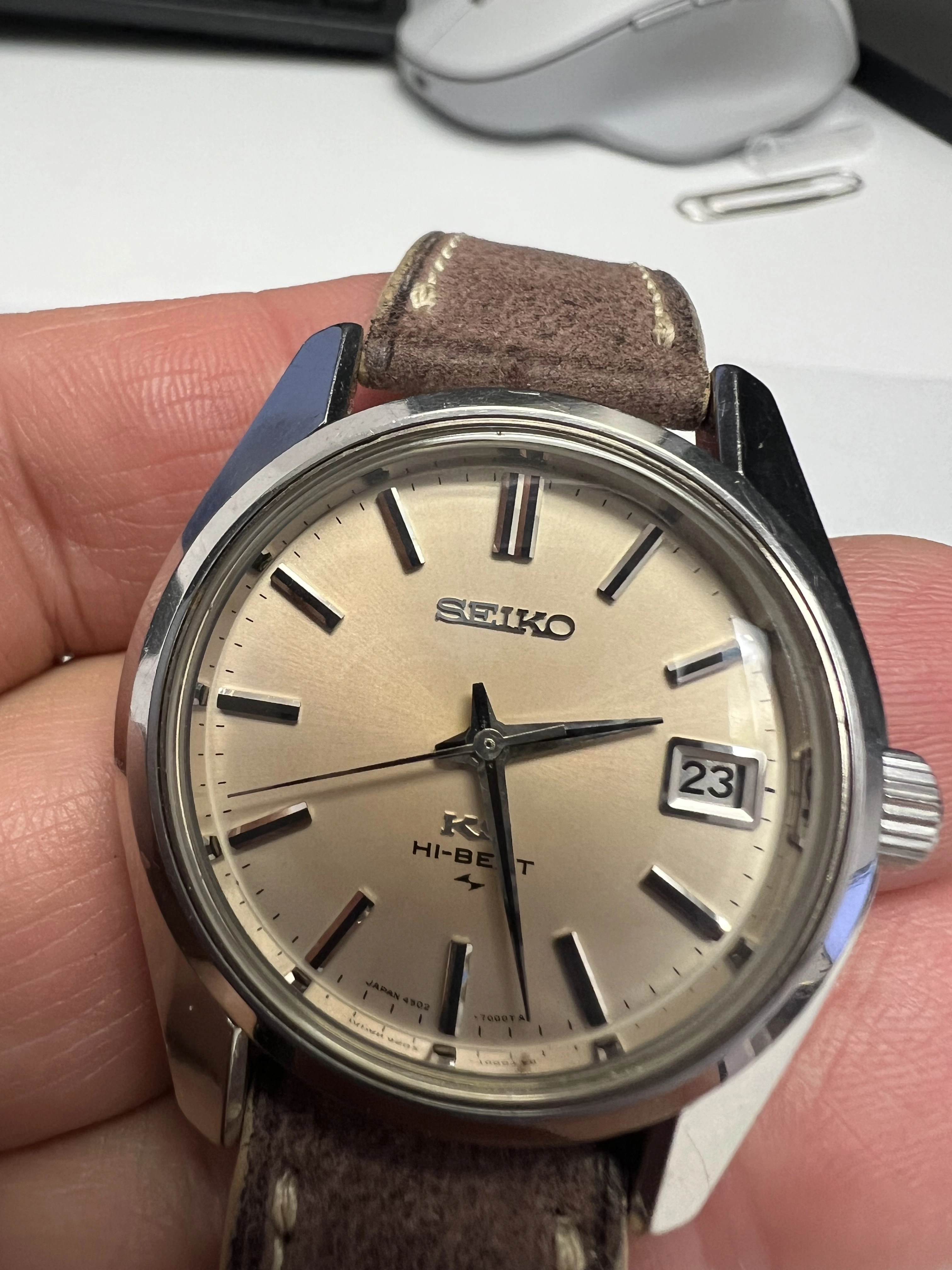 路King Seiko HI-Beat 4502-7000 watch, Vintage from 1969. 36000 bph watch. Manual winding caliber 4502a movement with 25 jewel. Original Seiko white dial with uniform pink patina, no marks or scratches dial is excellent.