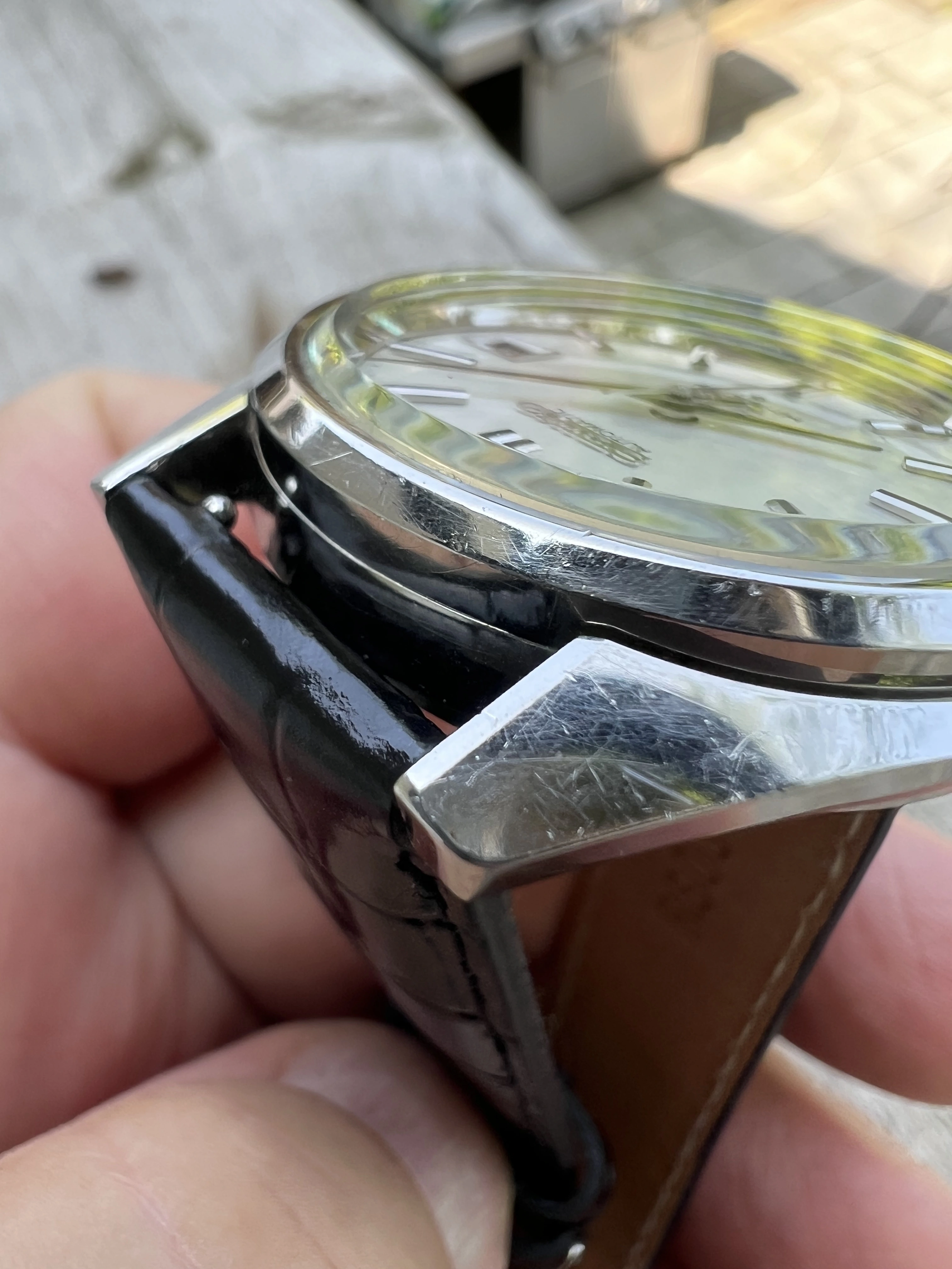 Strap: New SEIKO black calf leather with croc pattern, lug width 18 mm