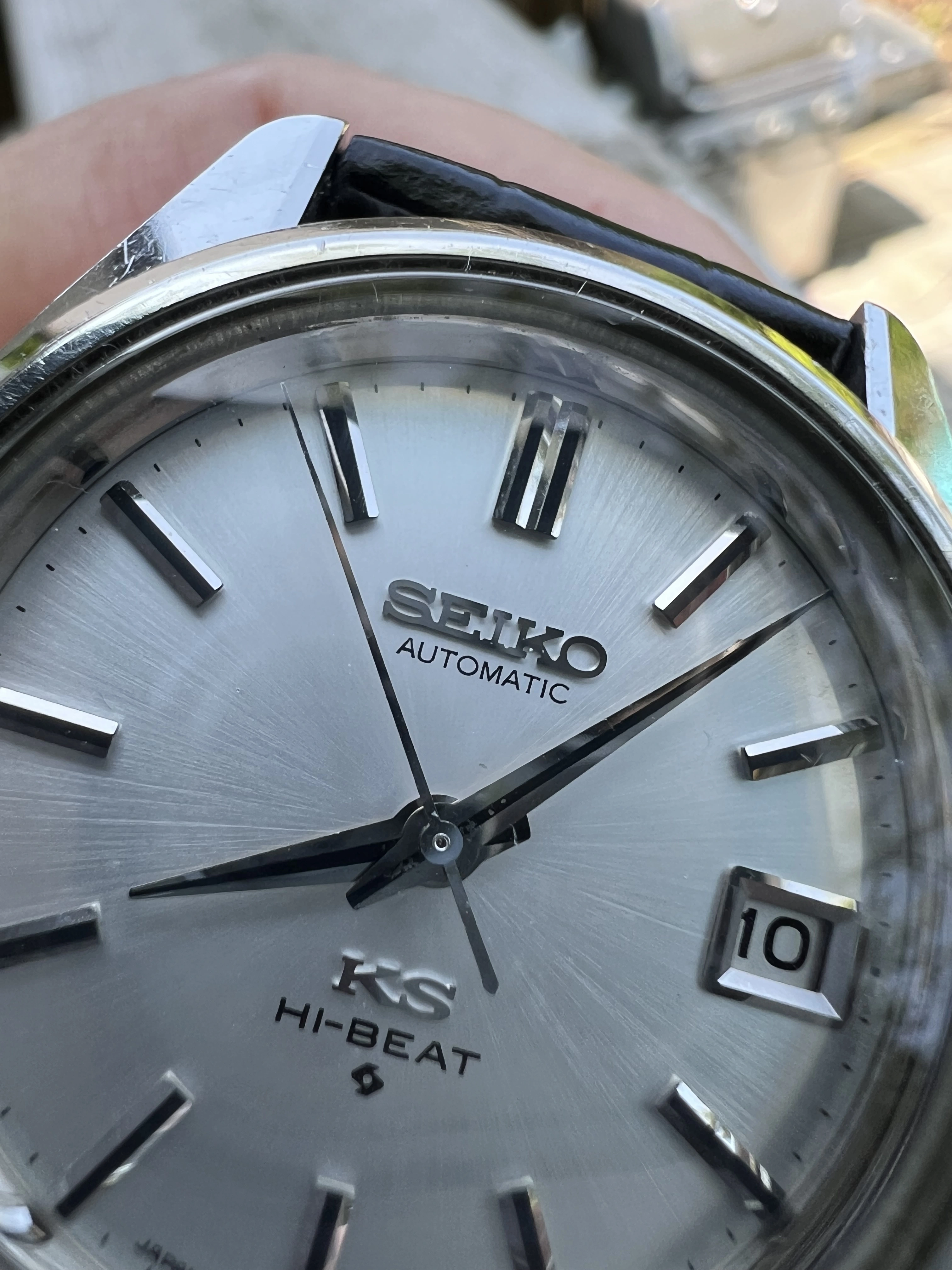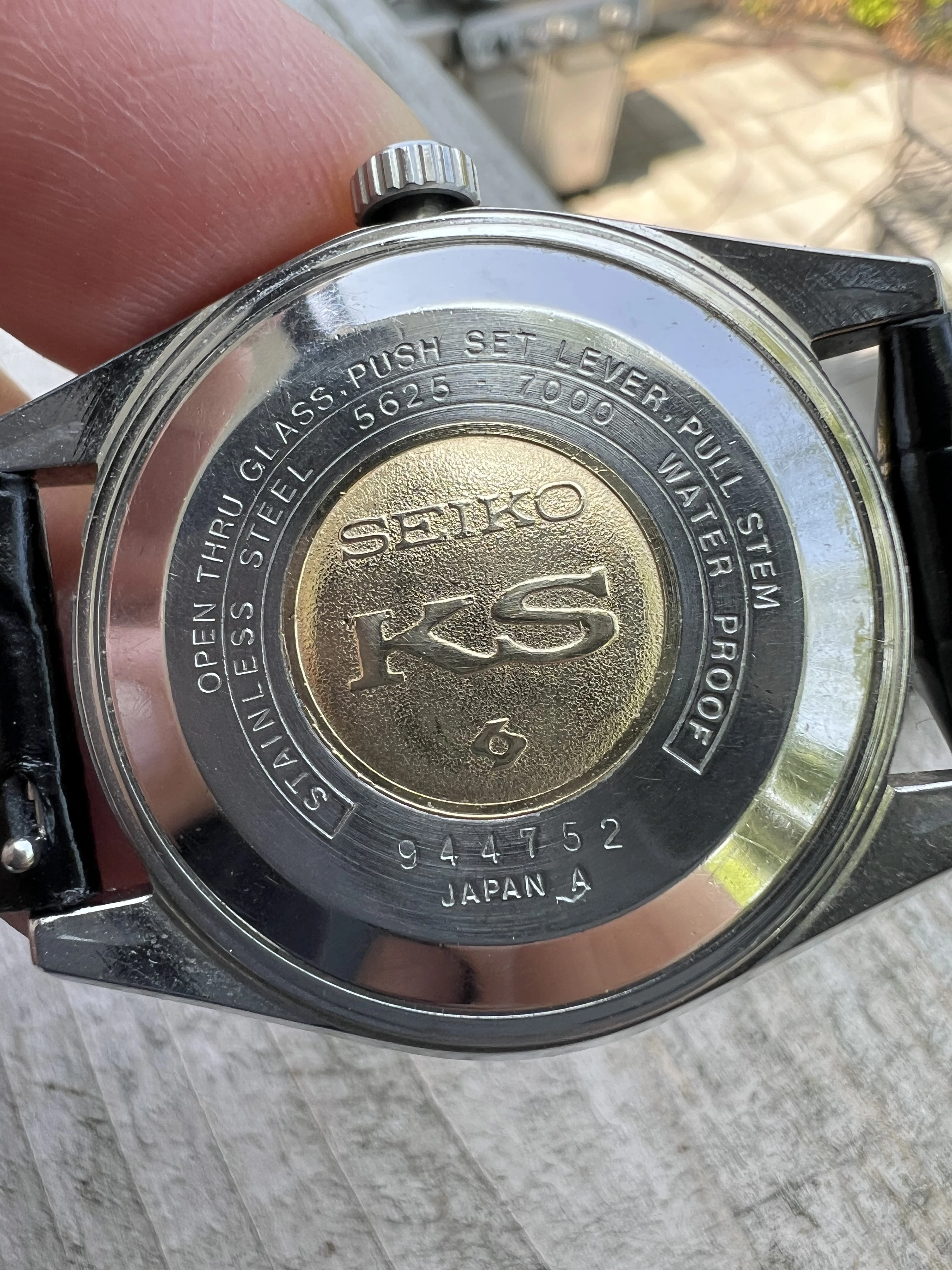Dial: Original sunburst dial is near perfect condition no visible marks. Stainless hour markers with black inserts, Applied SEIKO and KS, Suwa logo, all text correct and excellent. Date window 3:00 date turns over at MN and quickset functioning as it should.