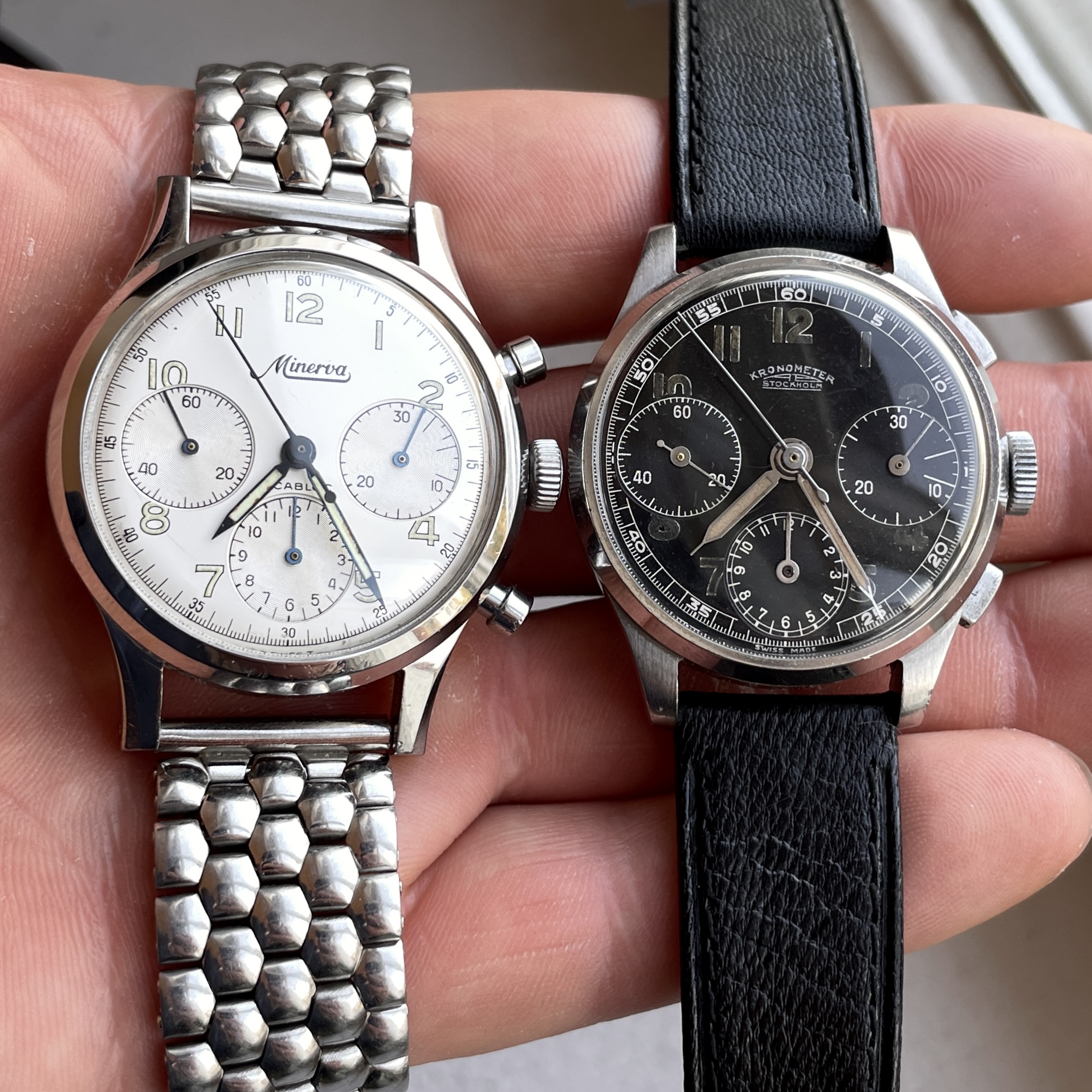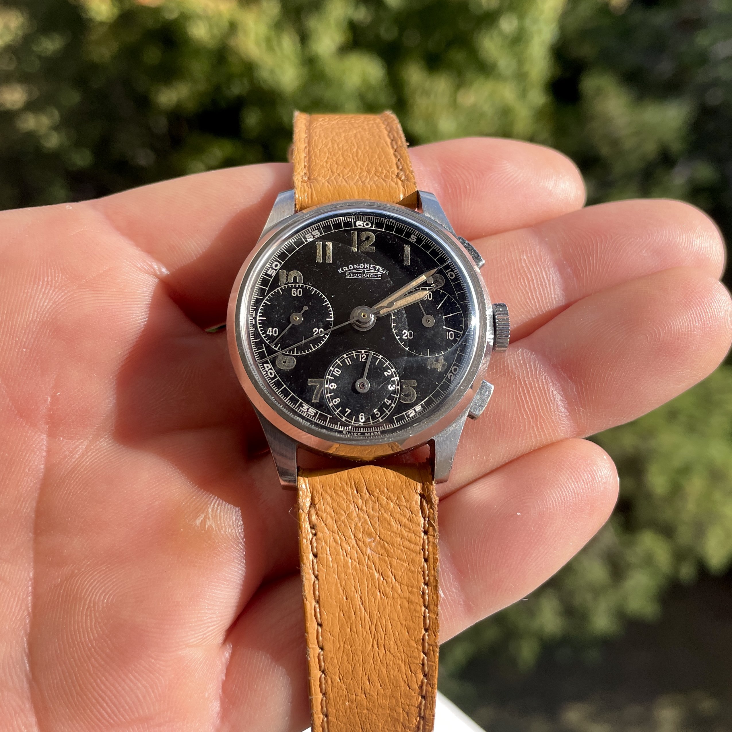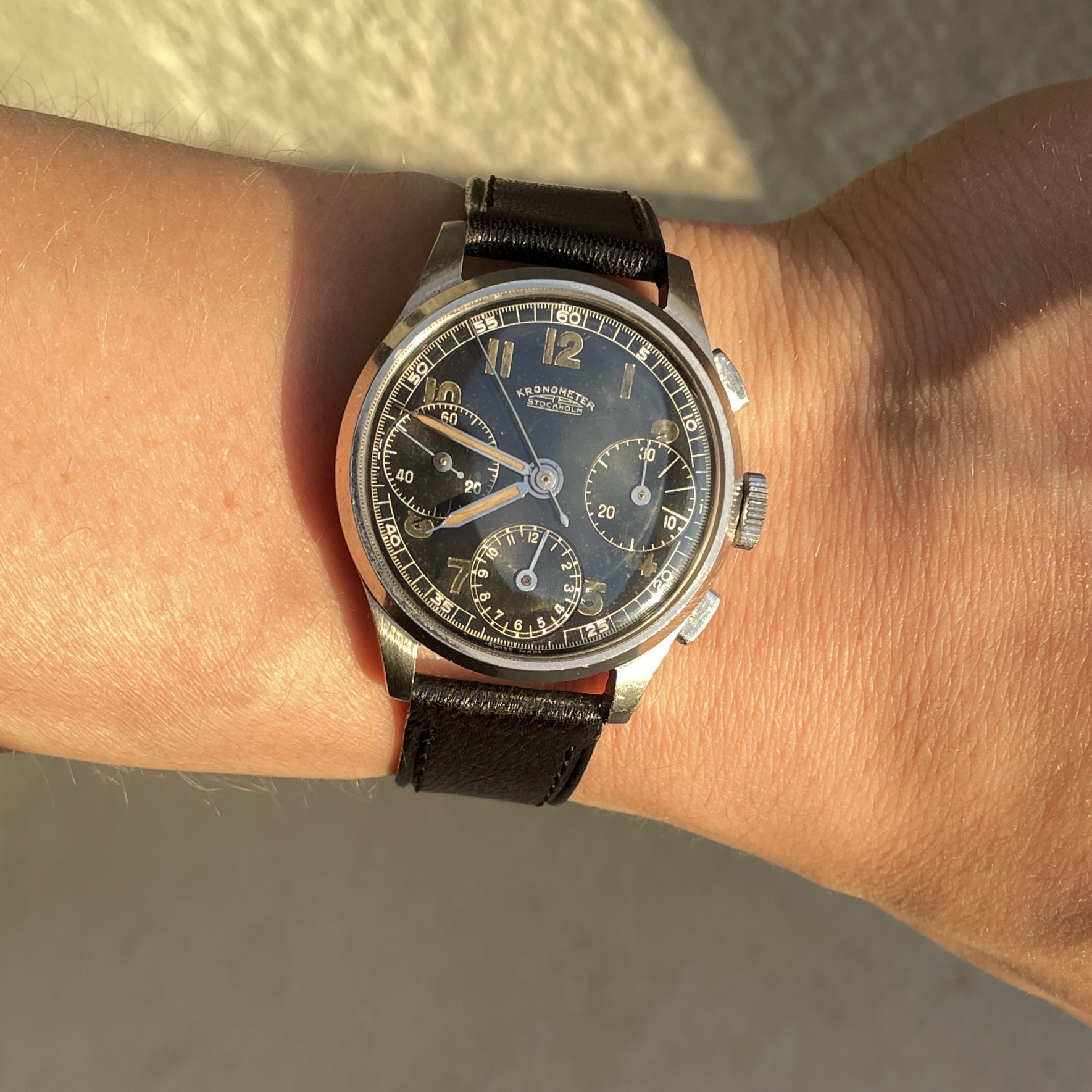 Here is my 1940 three register Kronometer Stockholm in a 35.5mm steel case: