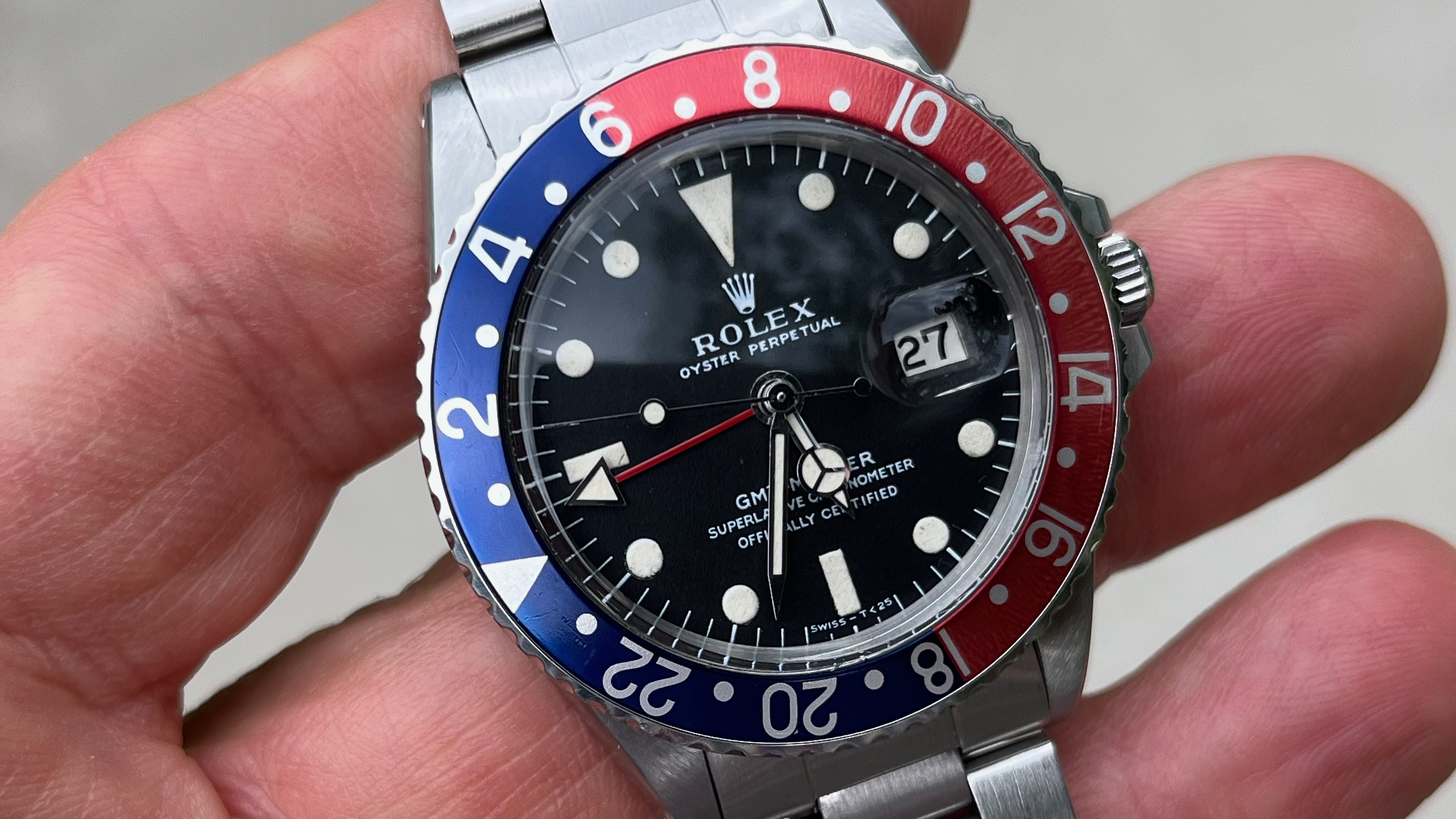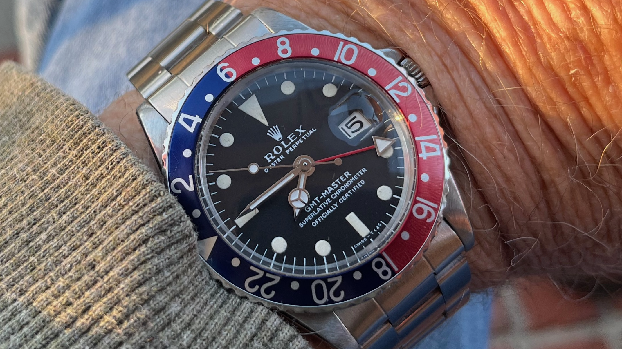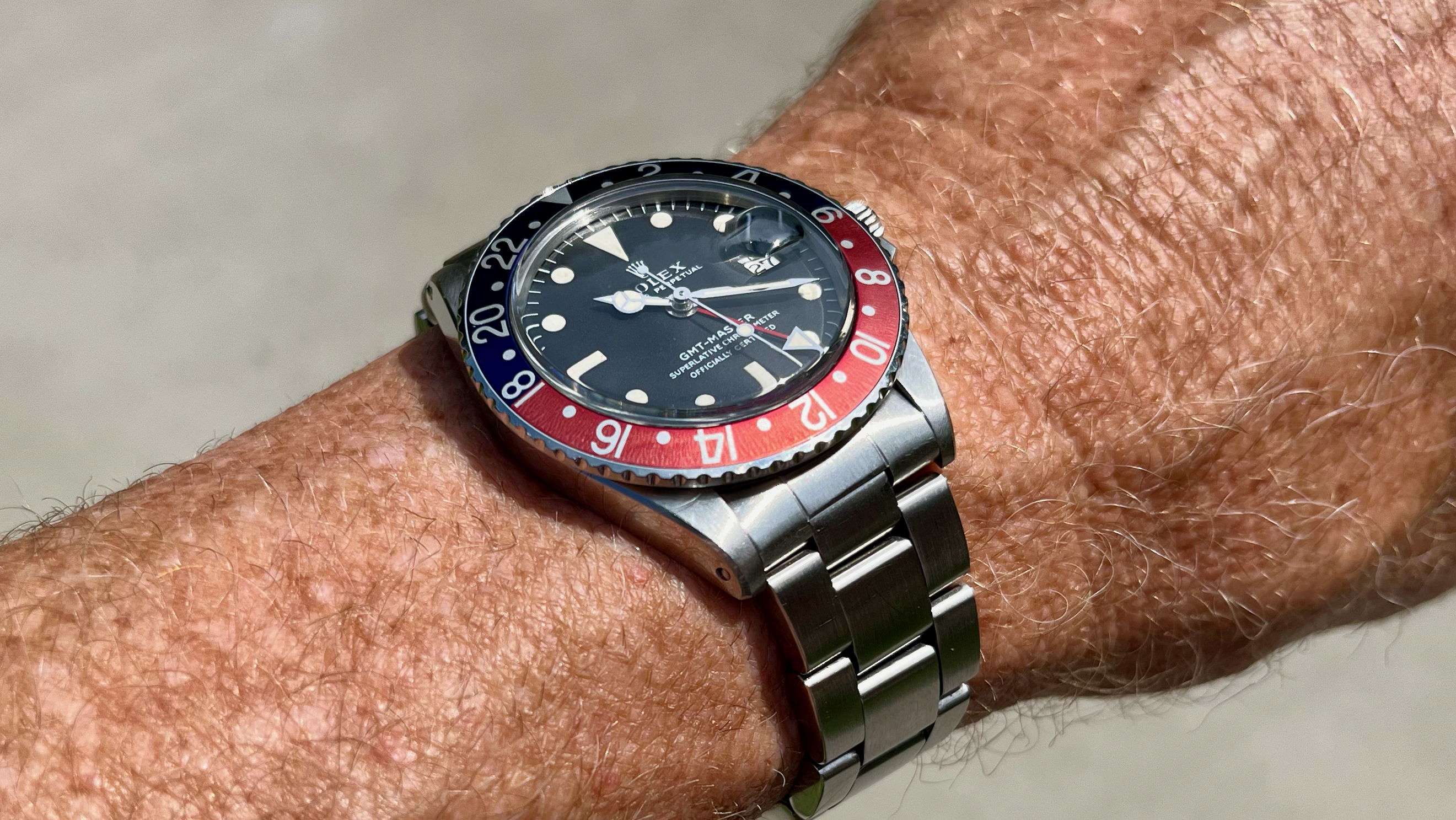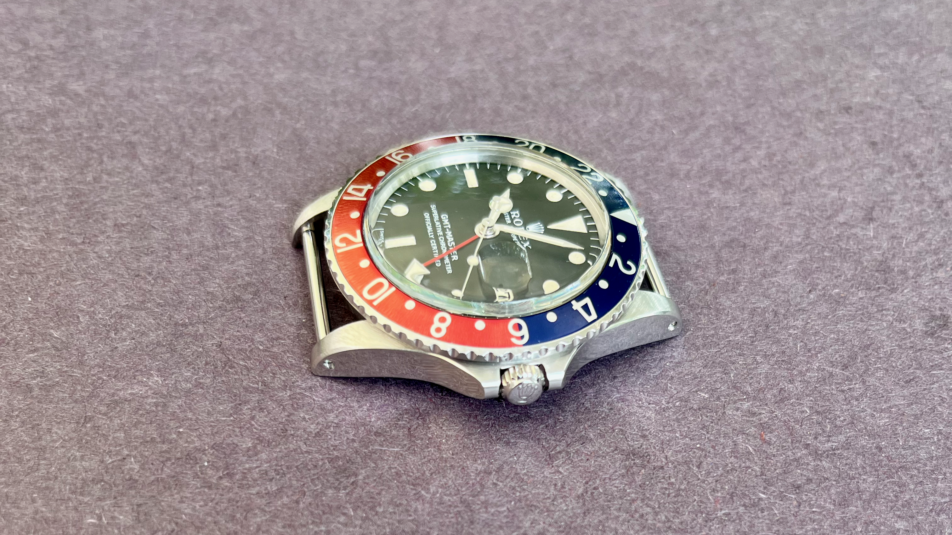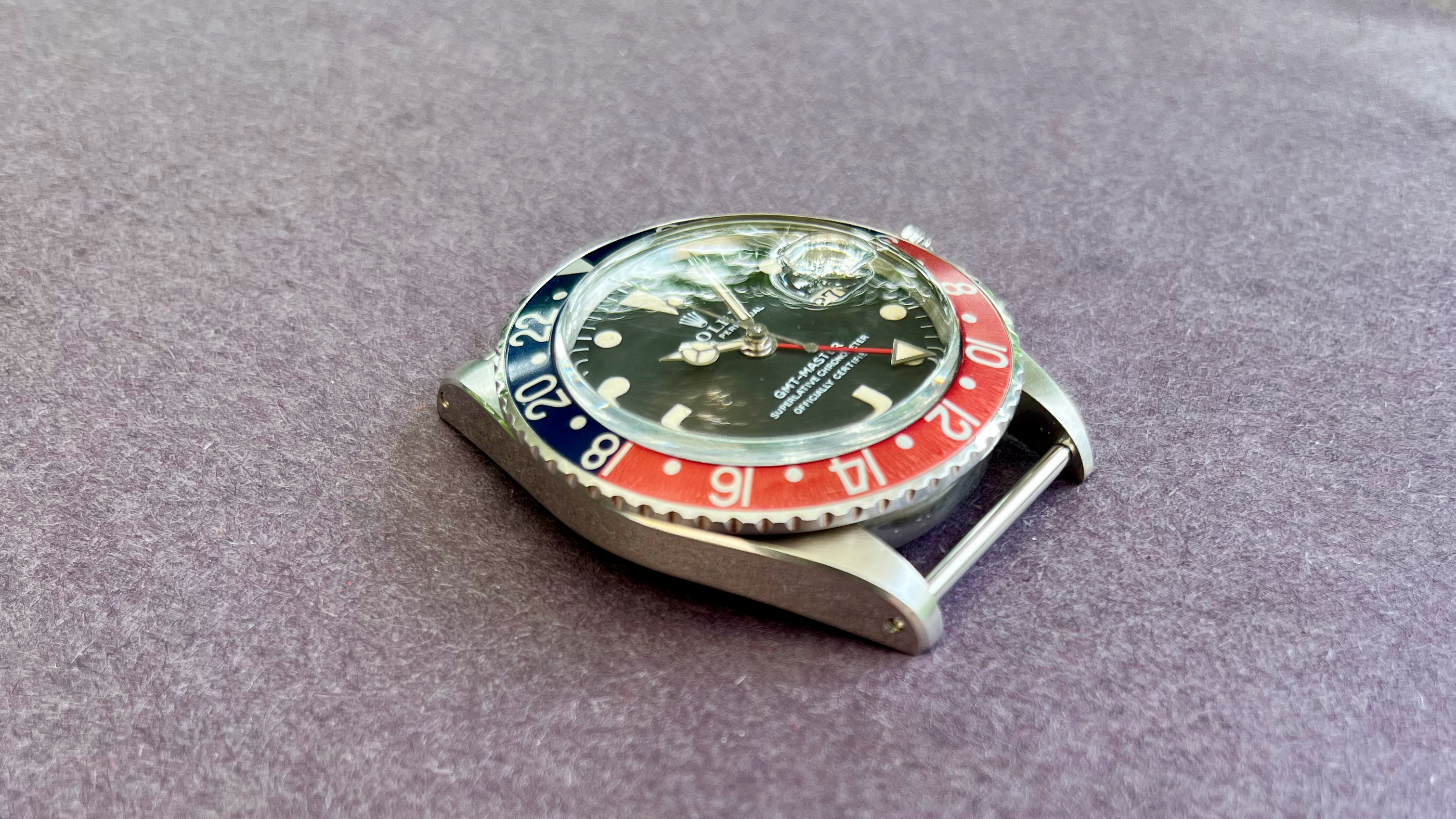 The hands were replaced somewhere along the way and never matched the beautiful cream color of the dial. They were tritium OEM replacement hands but were somewhat whiter. The case somewhere along the way was polished, and in my opinion was not great, but I could live with it. The bezel insert was replaced along the way too but over the past 10 years of daily wear during its world travels in the sun its beginning to take on a lovely aged patina of its own.