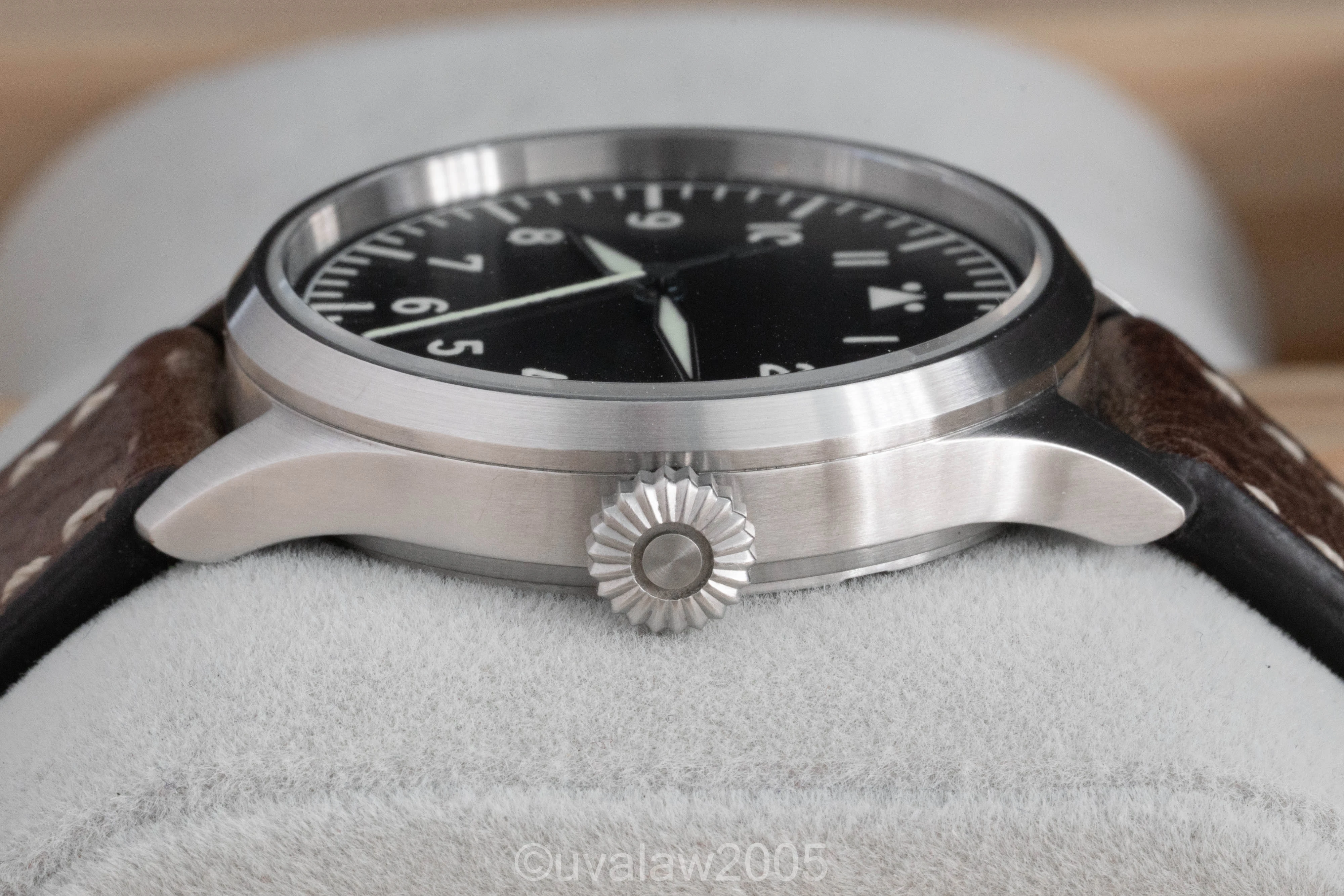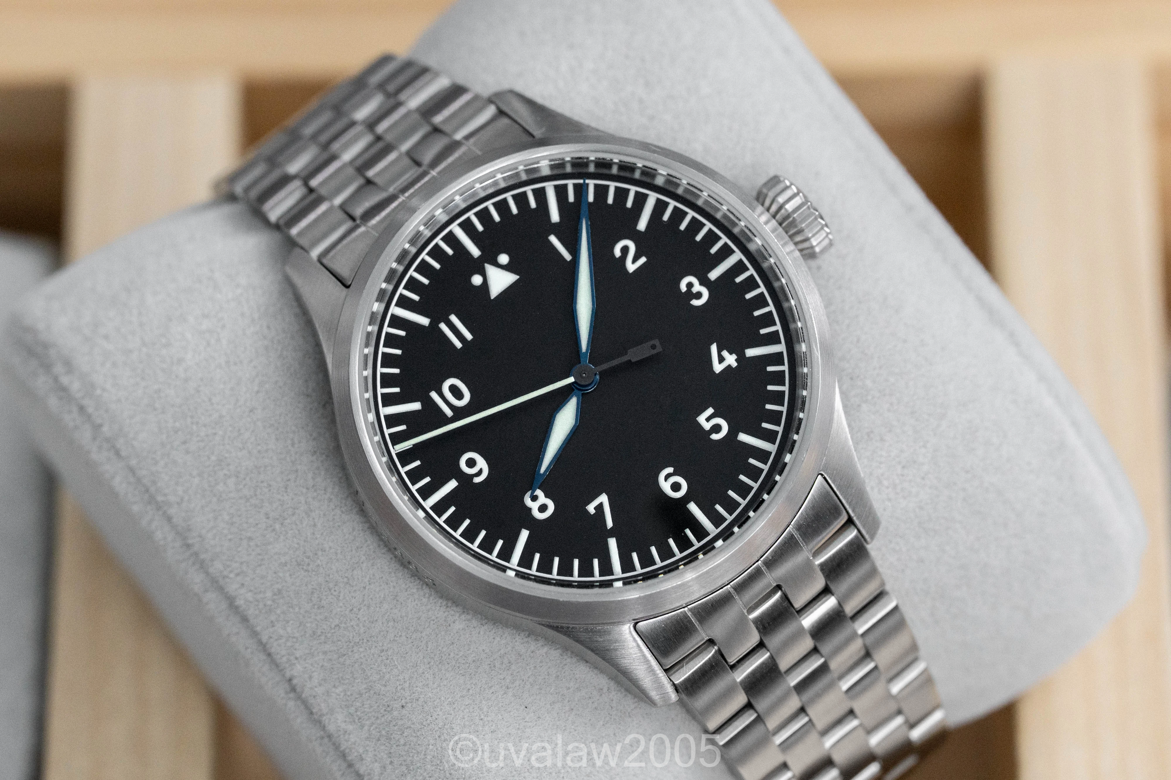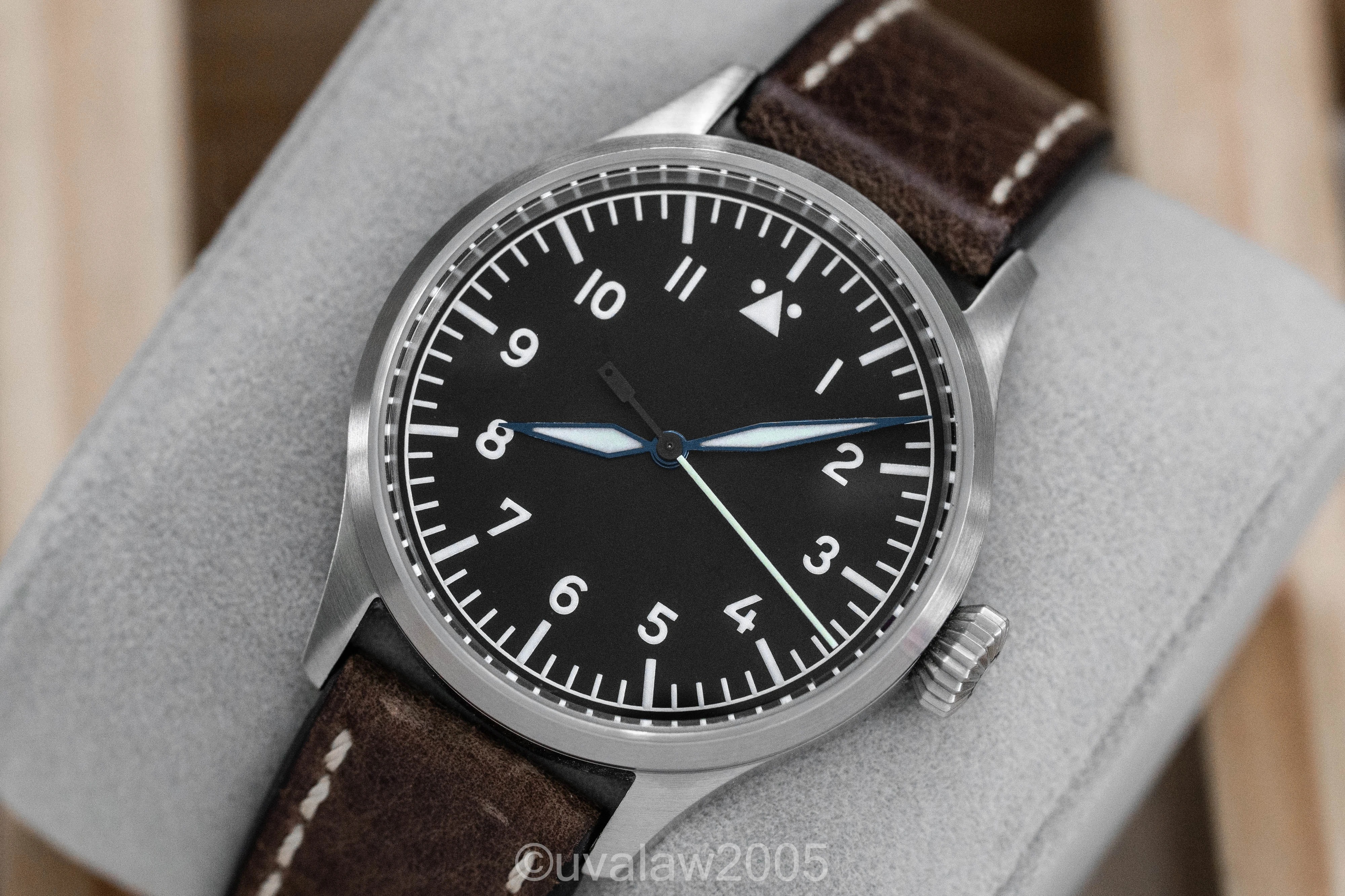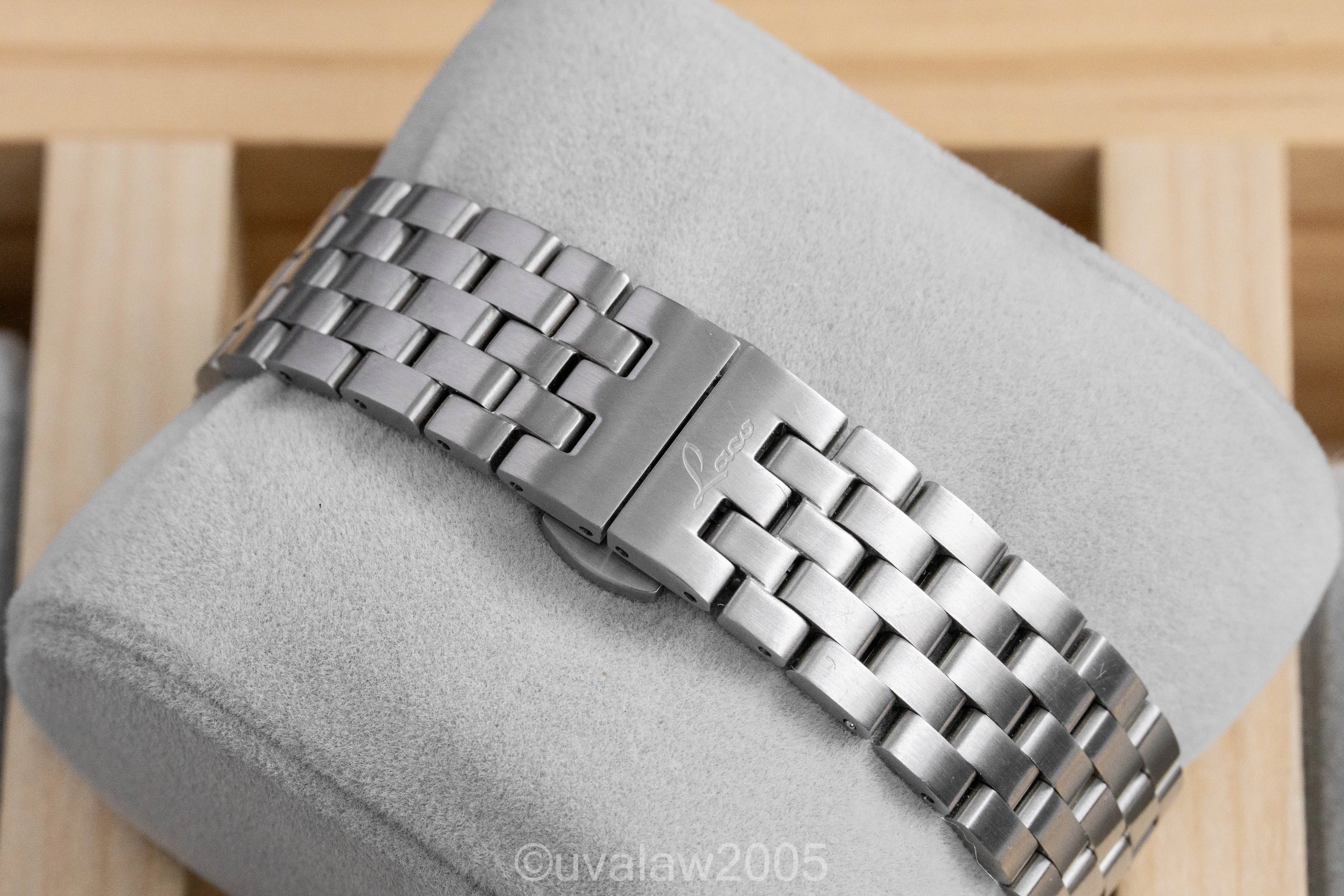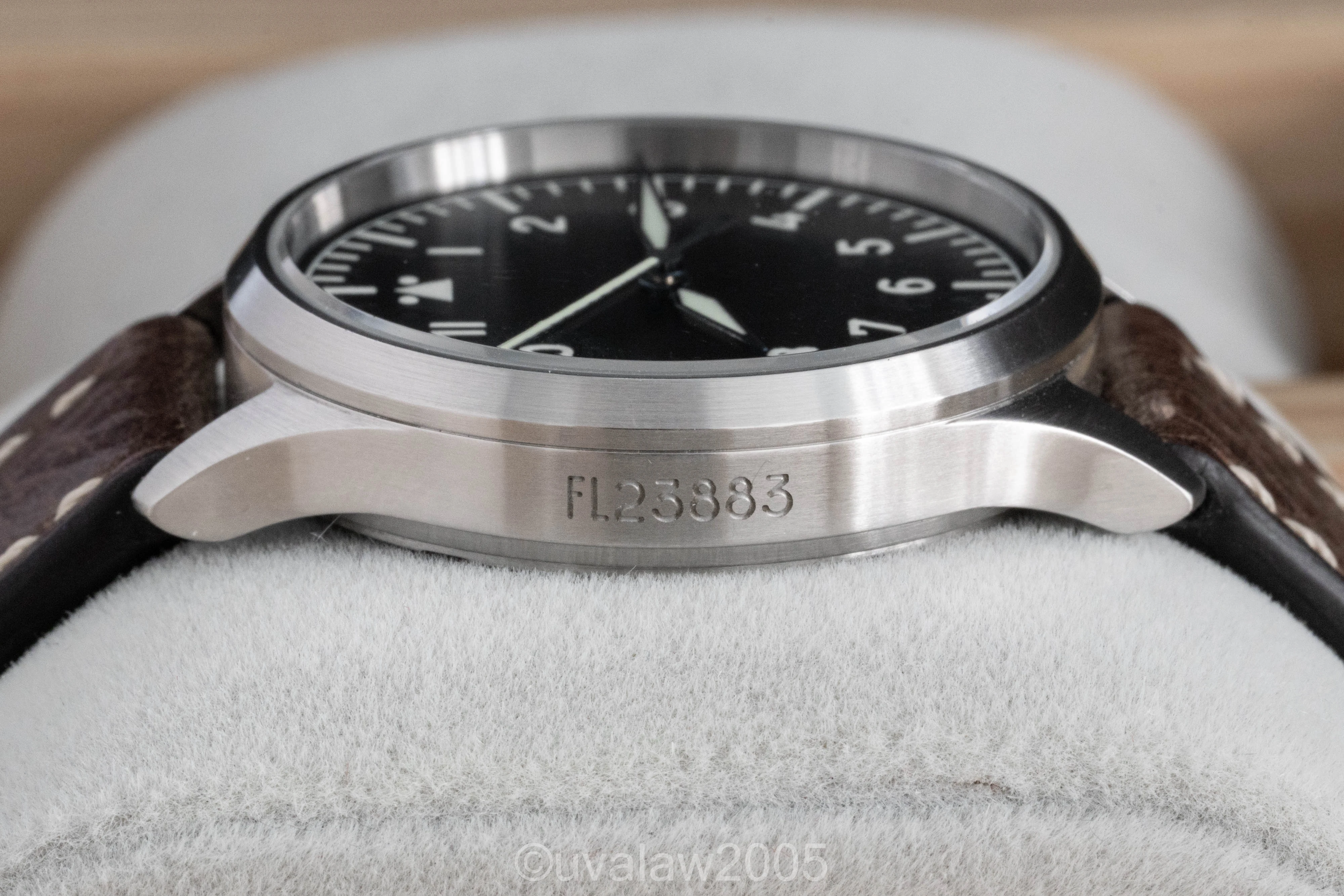 Customized with the no-logo dial, top grade Swiss automatic movement, sapphire crystals on front and back (inner AR on front), thermal blued hands, and brushed case with FL23883 engraving.