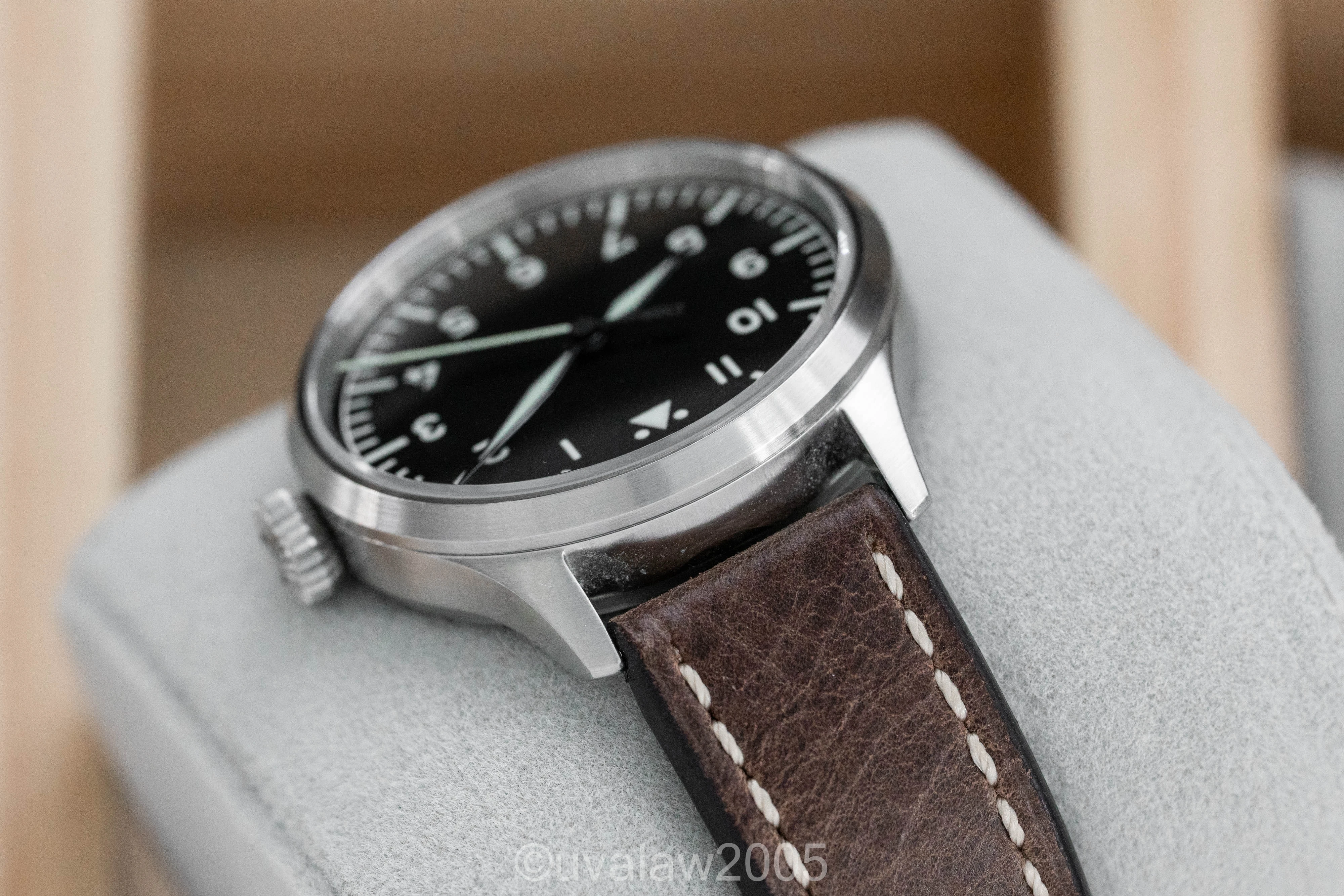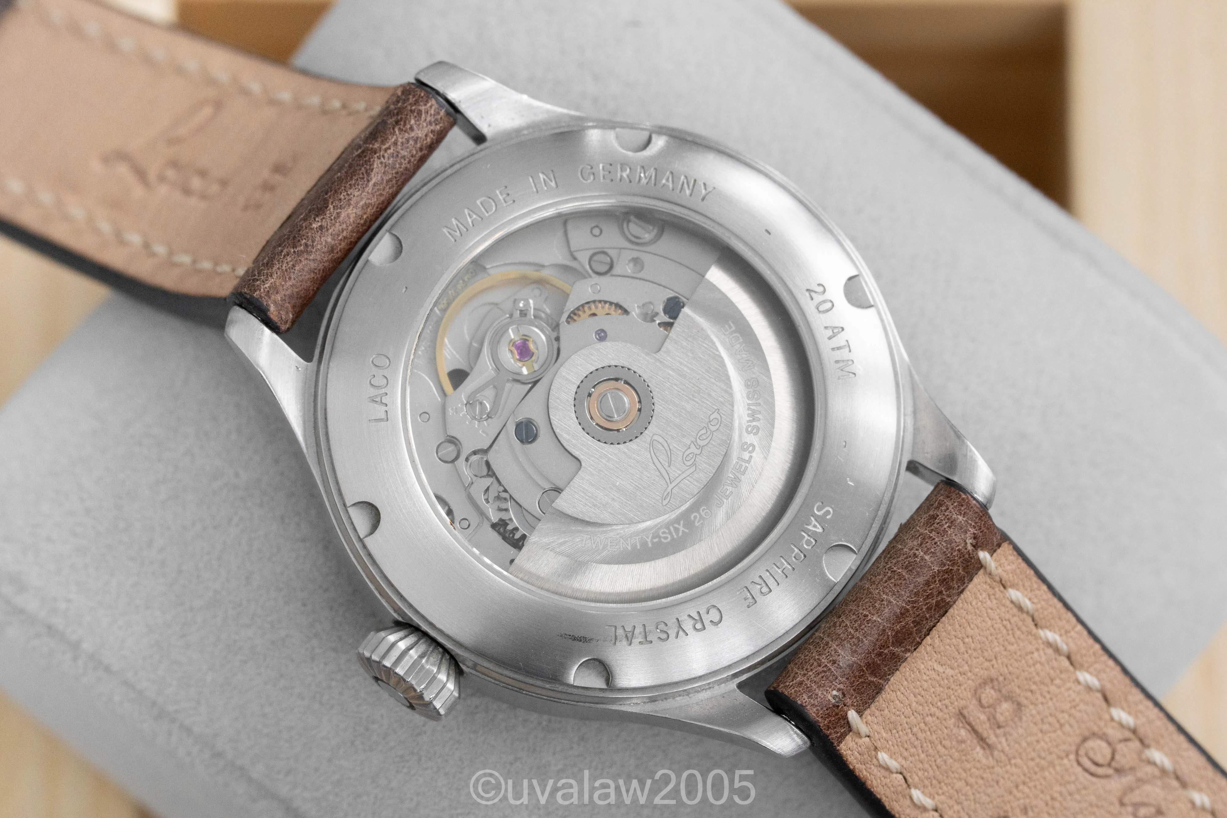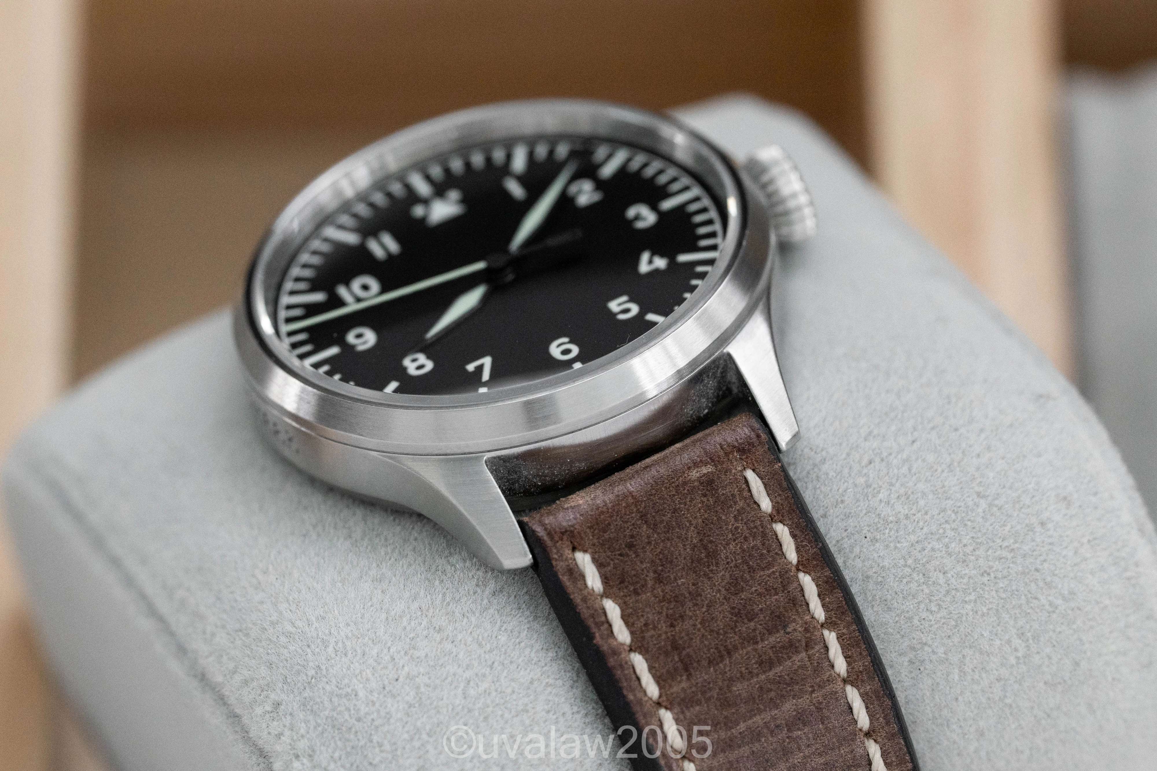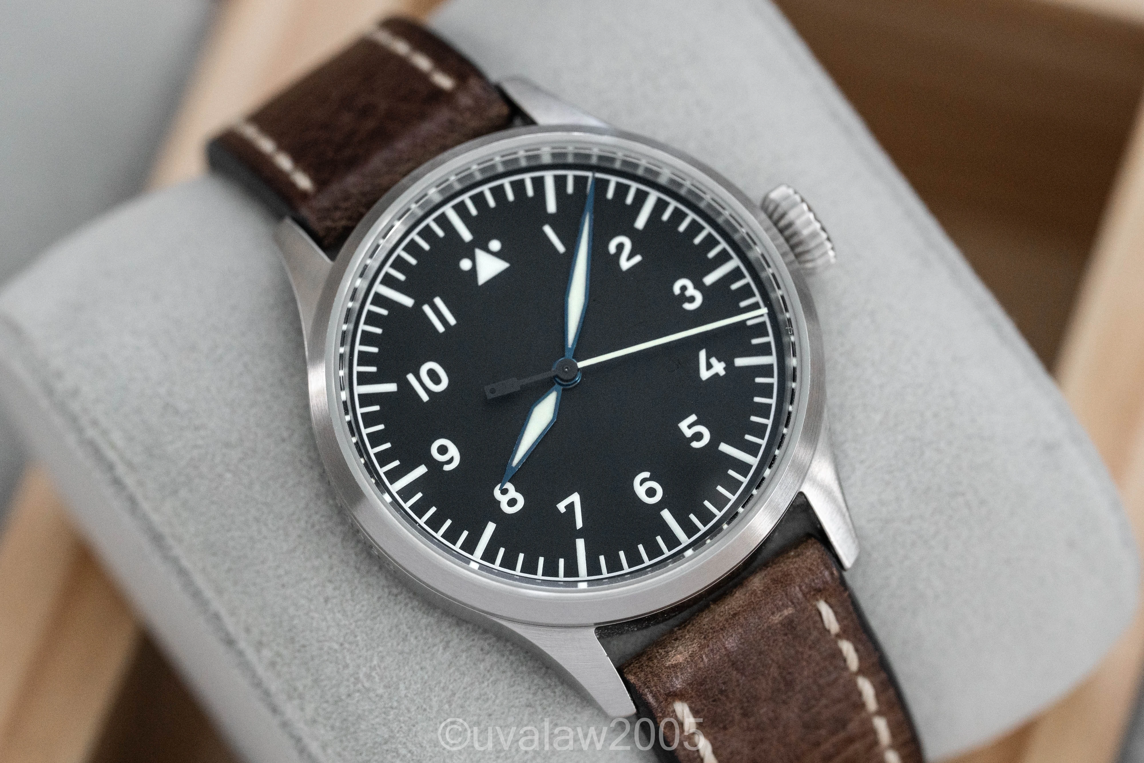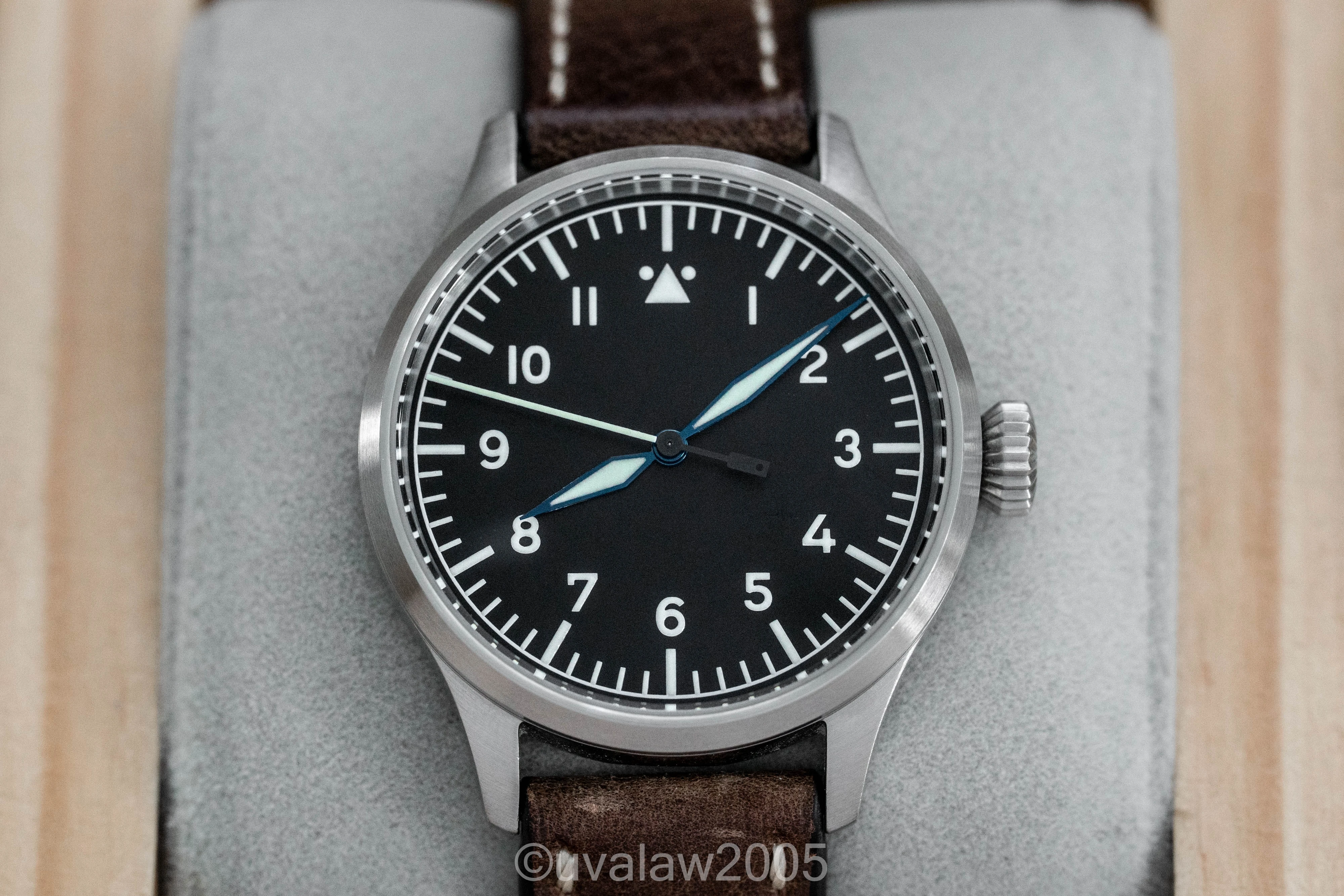 Customized with the no-logo dial, top grade Swiss automatic movement, sapphire crystals on front and back (inner AR on front), thermal blued hands, and brushed case with FL23883 engraving.