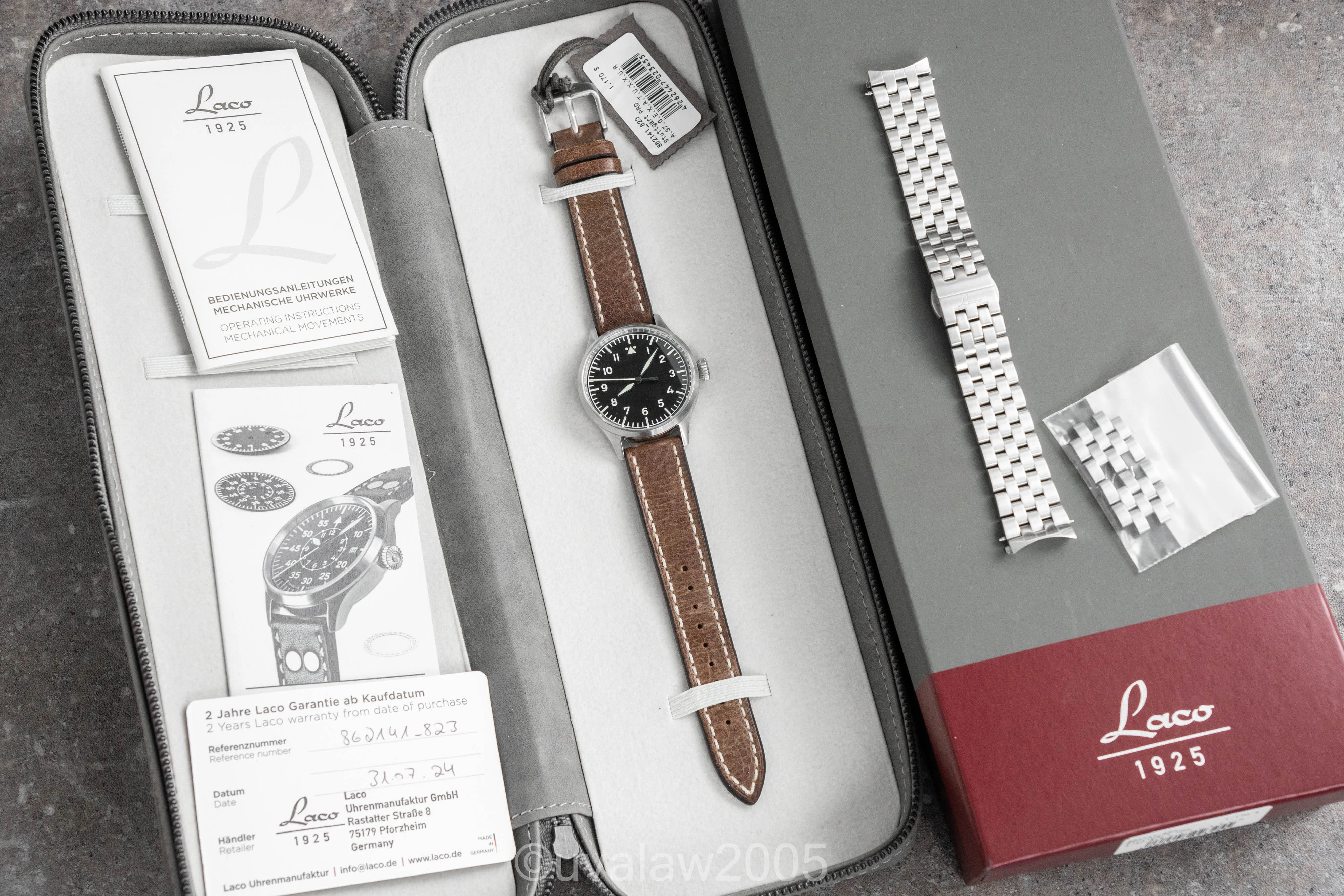 ·For sale is my Laco Flieger Stuttgart Pro in excellent condition with light surface wear. This is the 37mm model, just under 11mm thick, 44.5mm lug-to-lug, 18mm lug width, and 200-meter water resistance via the screw-down crown. Comes with OEM leather strap plus the OEM bracelet that was purchased separately.