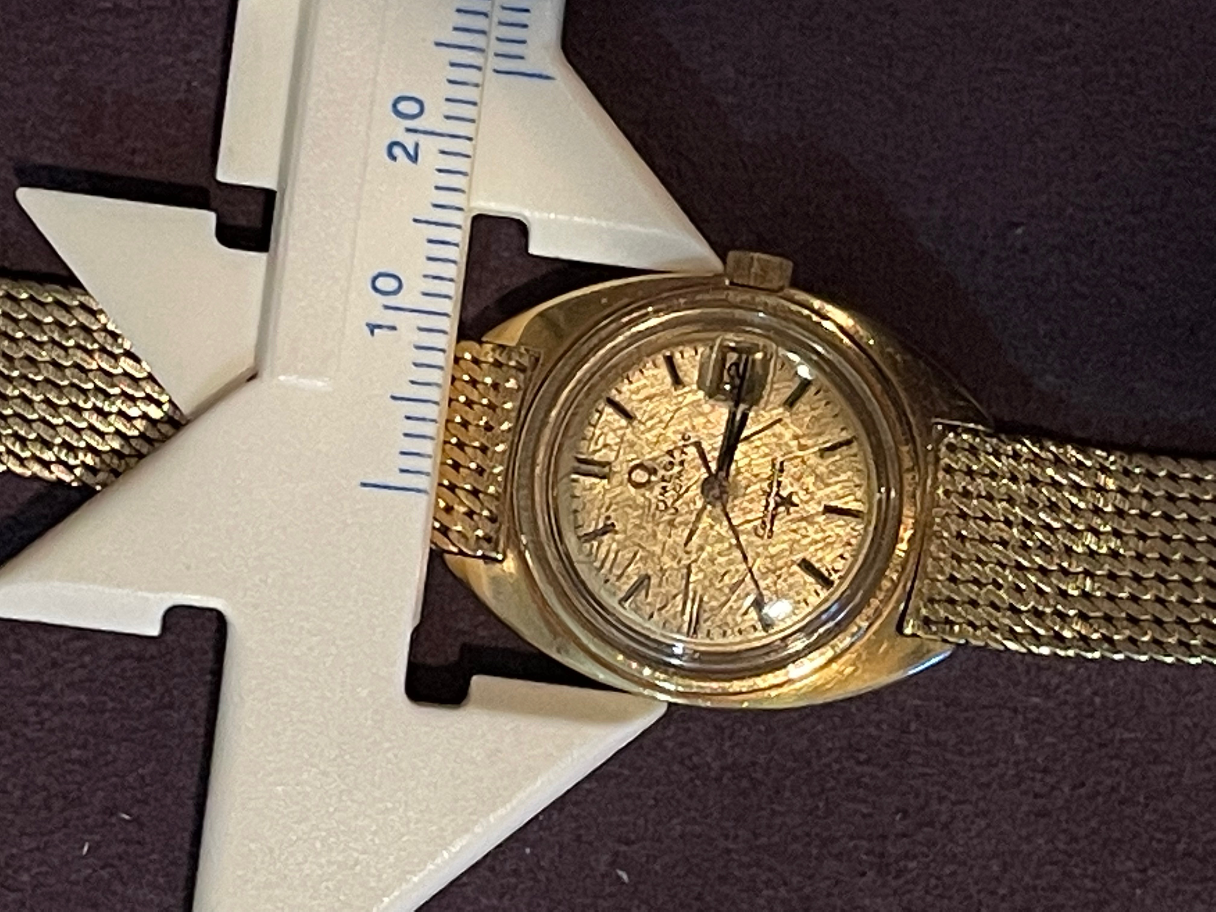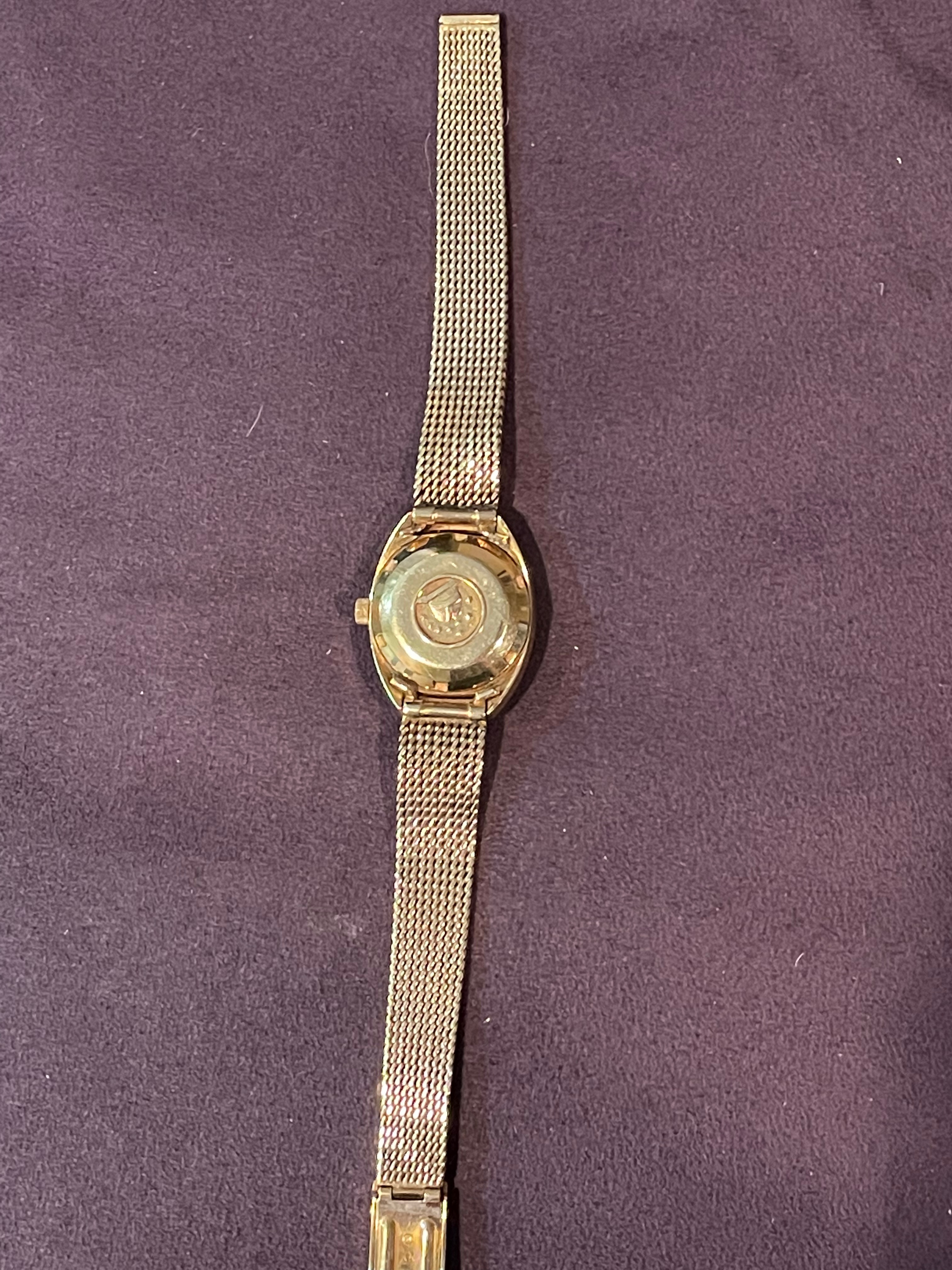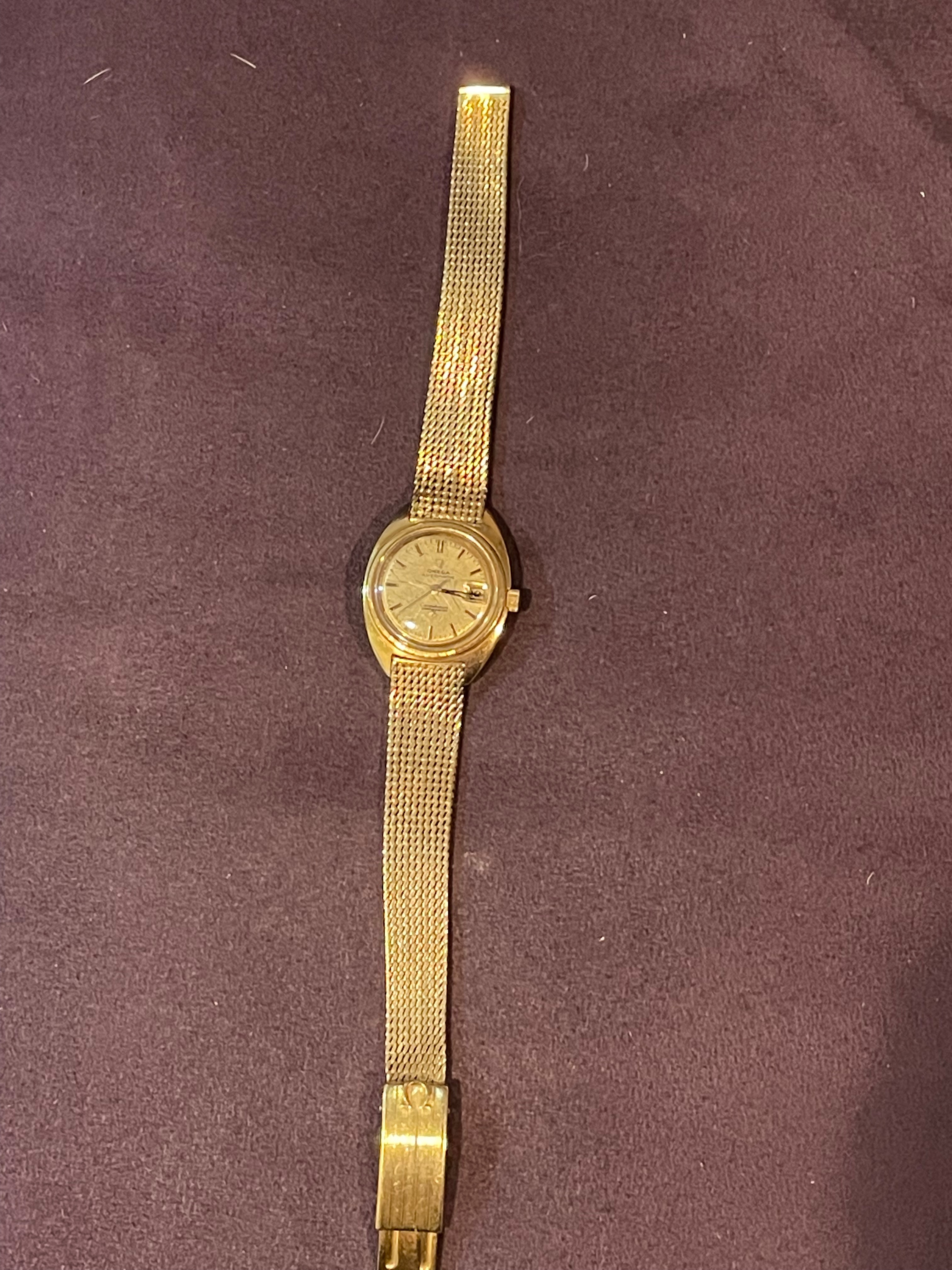 ·Up for sale is a watch that I purchased for Mrs. P around Valentine's day around 4 years ago. She did not "bond" with it, opting instead for a modern seamaster. Reference is 568.001 with calibre 672 inside. This is an 18K C-case ladies watch dating from around 1968 (according to the original owner) with gold milanese bracelet. The case measures 24mm without crown and 10.5 mm to top of domed crystal. I did not get around to getting it serviced as it never made it into a wearing rotation. I have not opened the case as I do not want to scratch things up. There is some light crazing of the crystal commensurate with age and use. There are no papers or box and undoubtedly will need a service before real use, although it does wind, set, keep reasonable time.