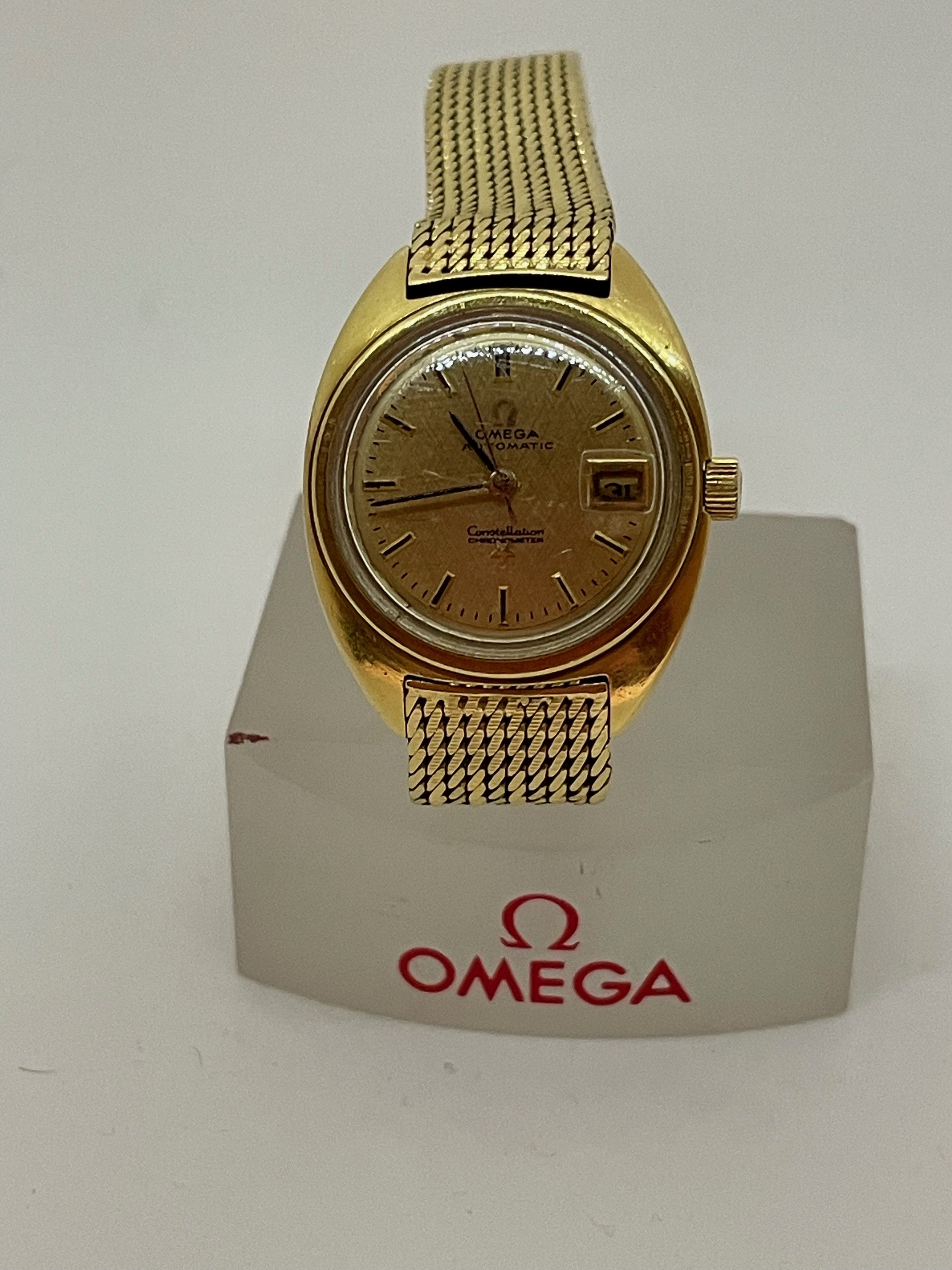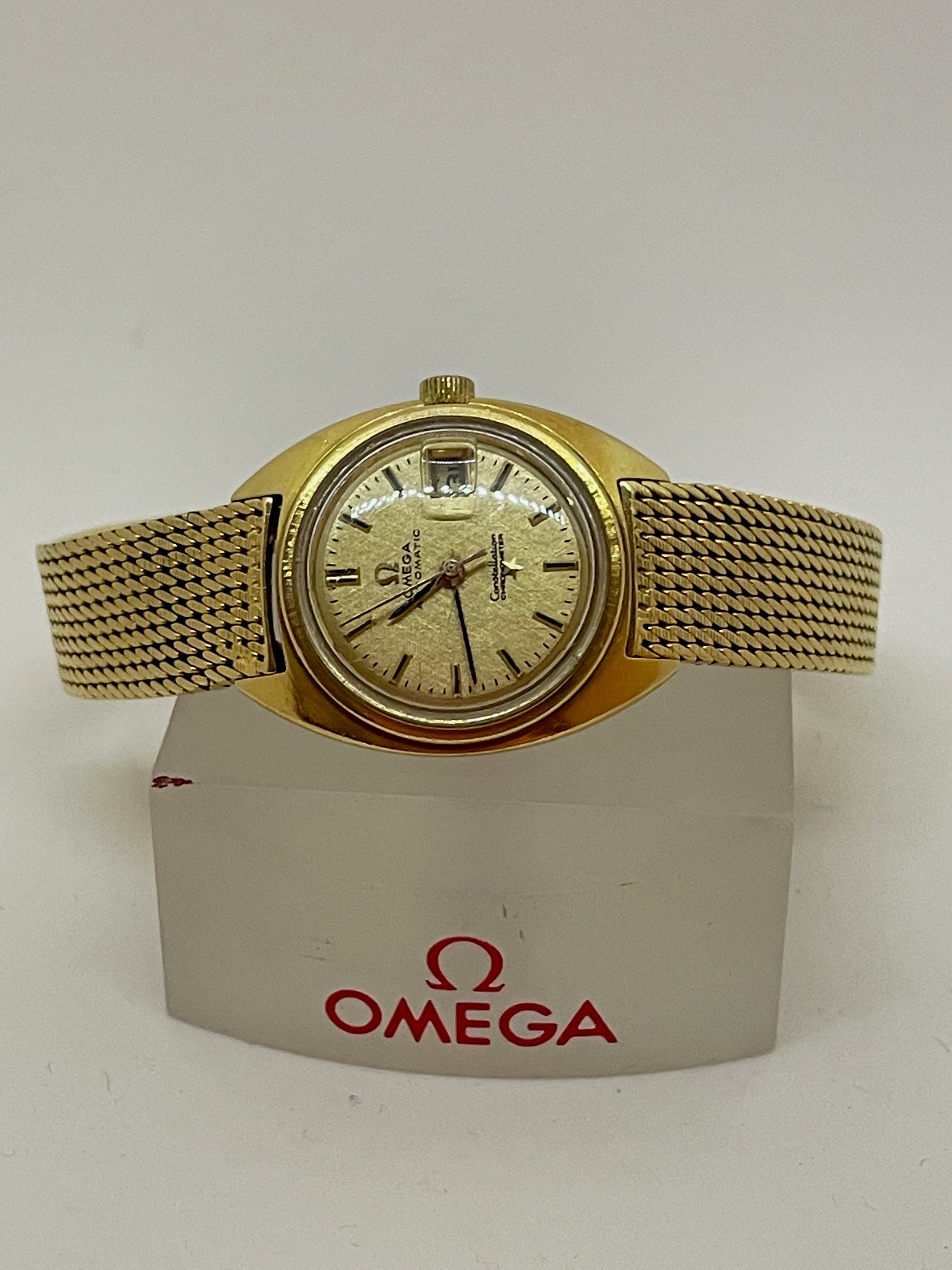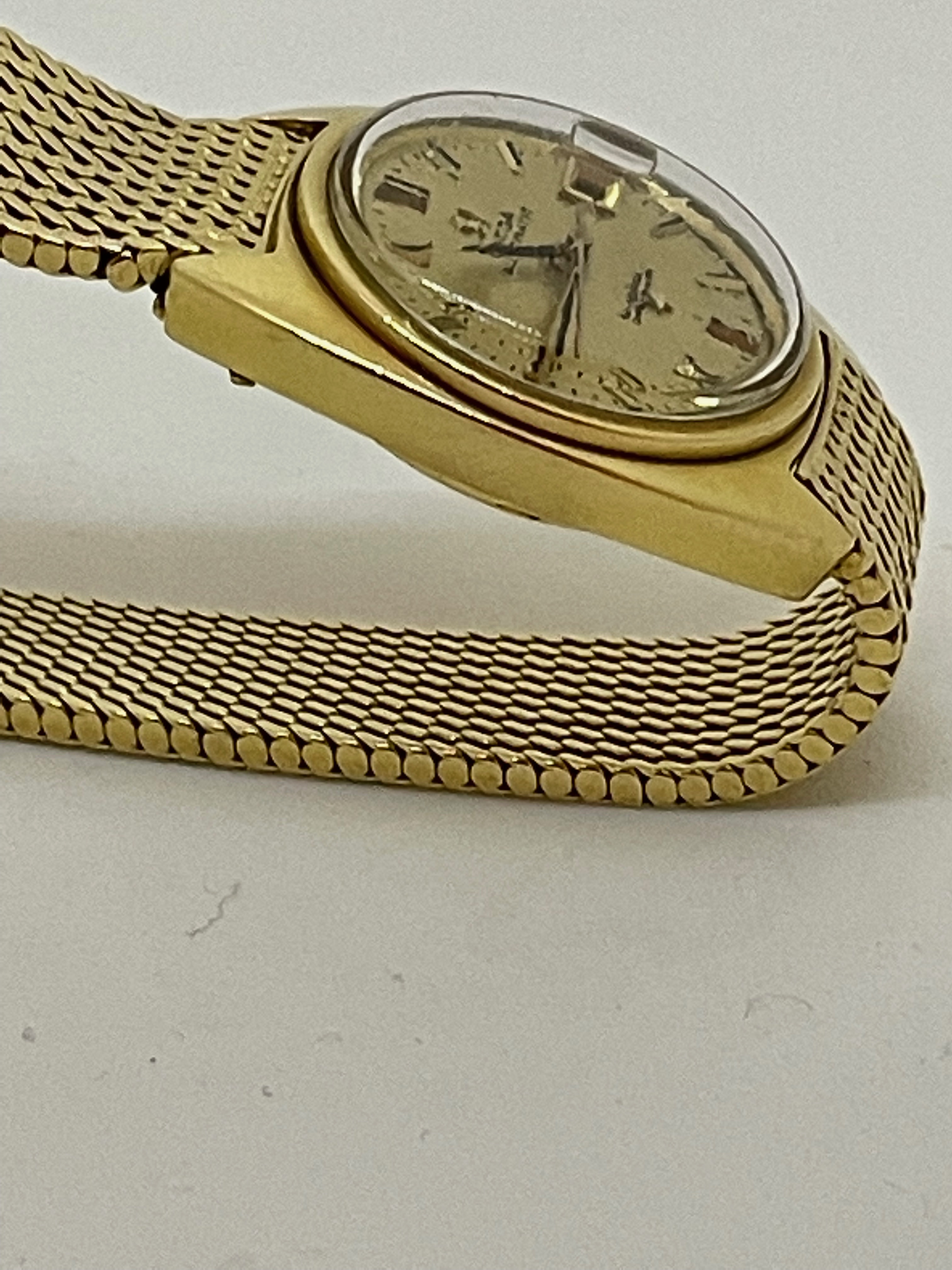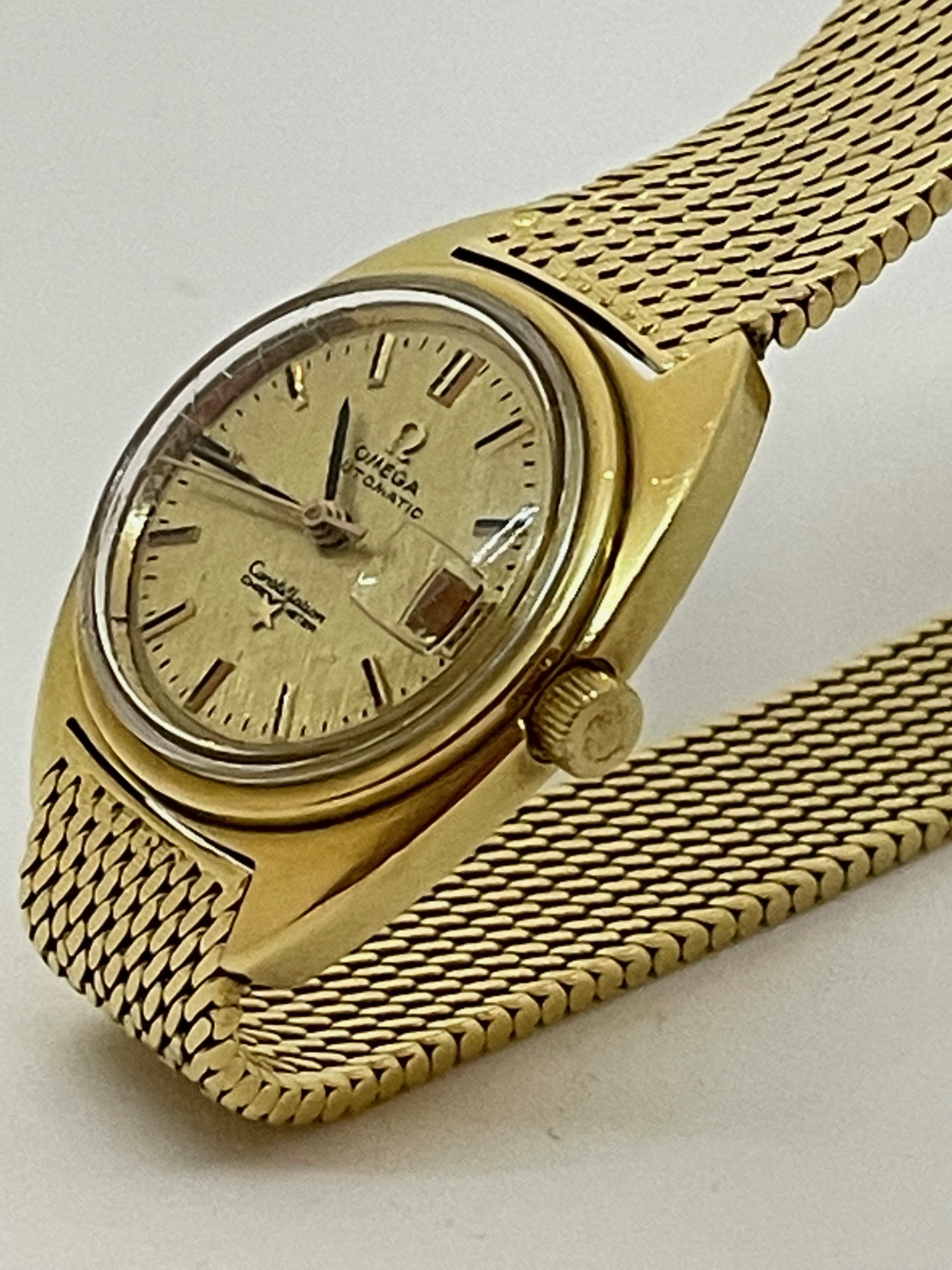 ·Up for sale is a watch that I purchased for Mrs. P around Valentine's day around 4 years ago. She did not "bond" with it, opting instead for a modern seamaster. Reference is 568.001 with calibre 672 inside. This is an 18K C-case ladies watch dating from around 1968 (according to the original owner) with gold milanese bracelet. The case measures 24mm without crown and 10.5 mm to top of domed crystal. I did not get around to getting it serviced as it never made it into a wearing rotation. I have not opened the case as I do not want to scratch things up. There is some light crazing of the crystal commensurate with age and use. There are no papers or box and undoubtedly will need a service before real use, although it does wind, set, keep reasonable time.