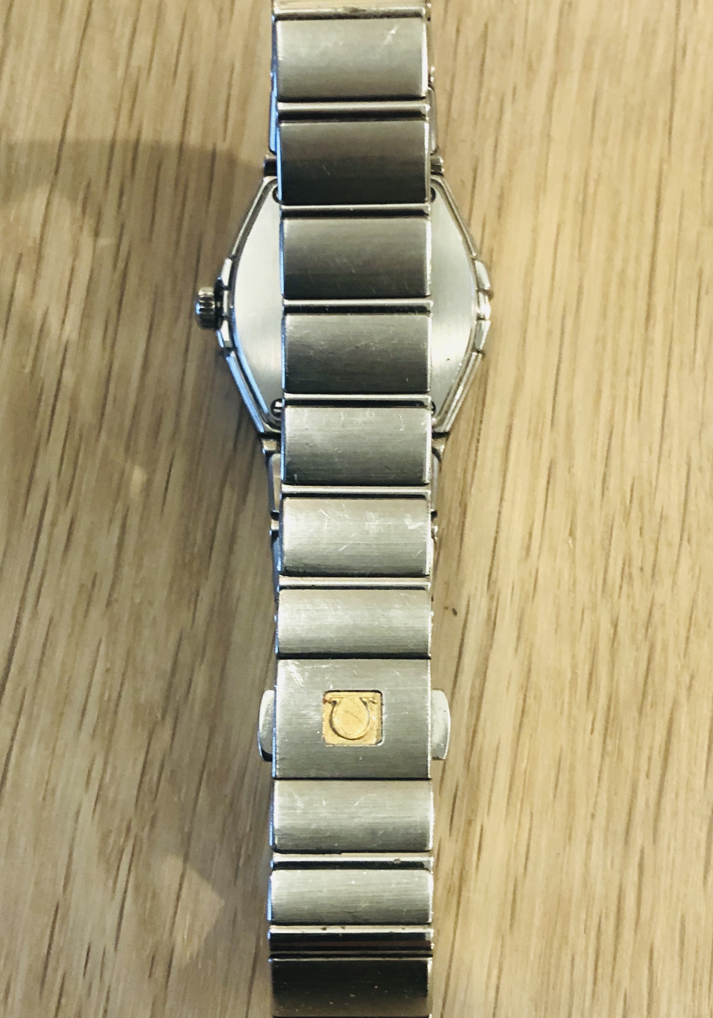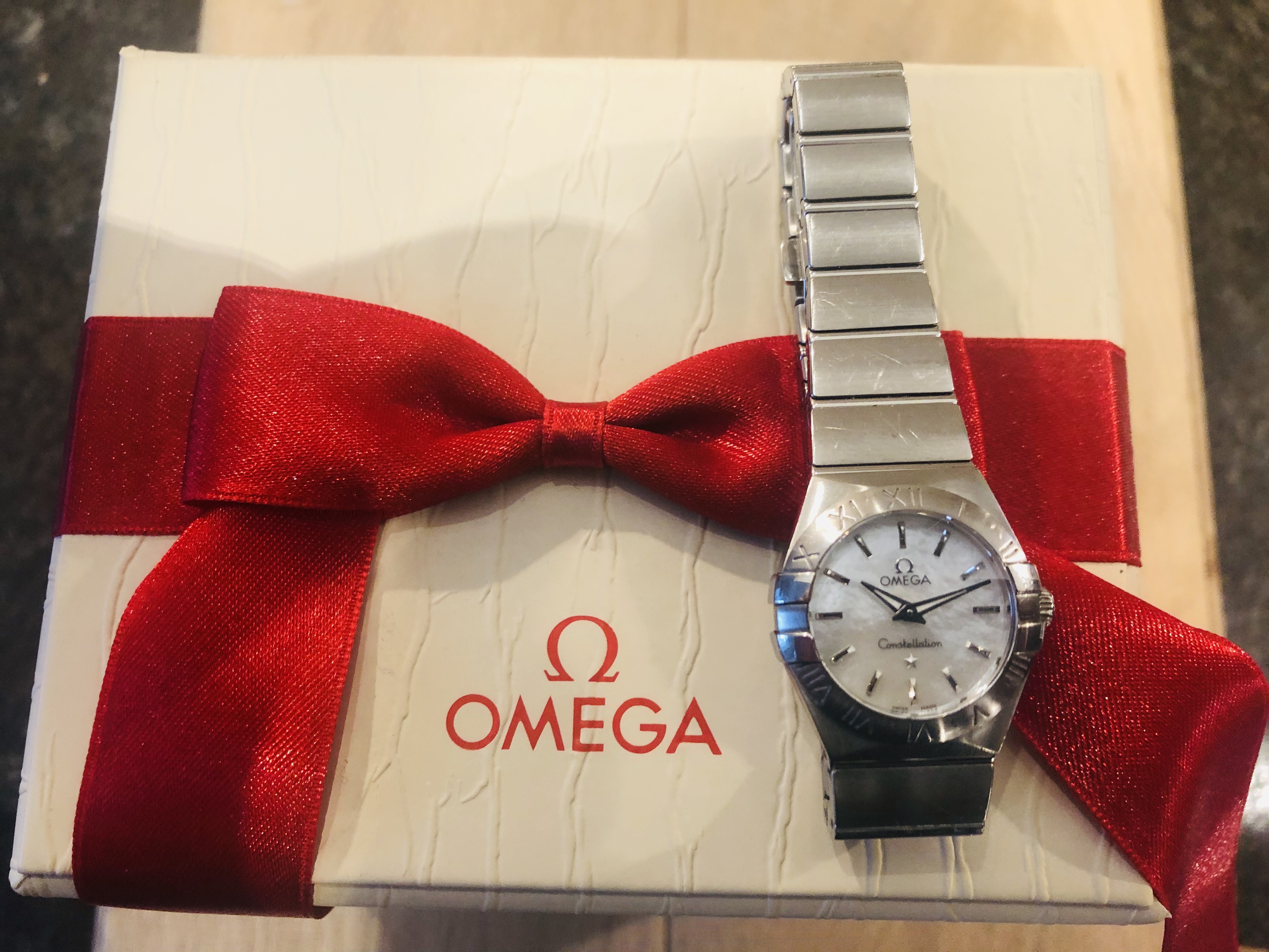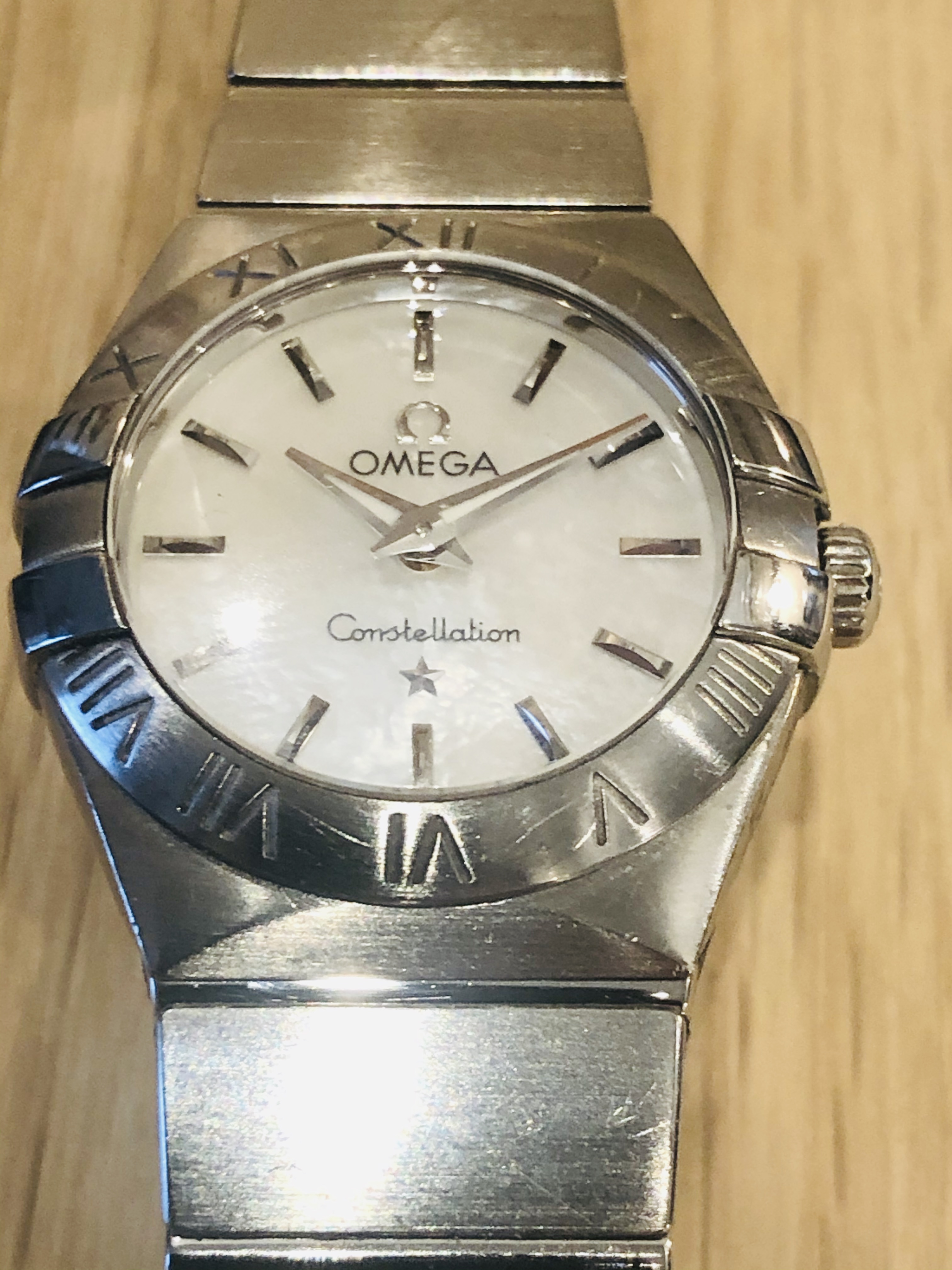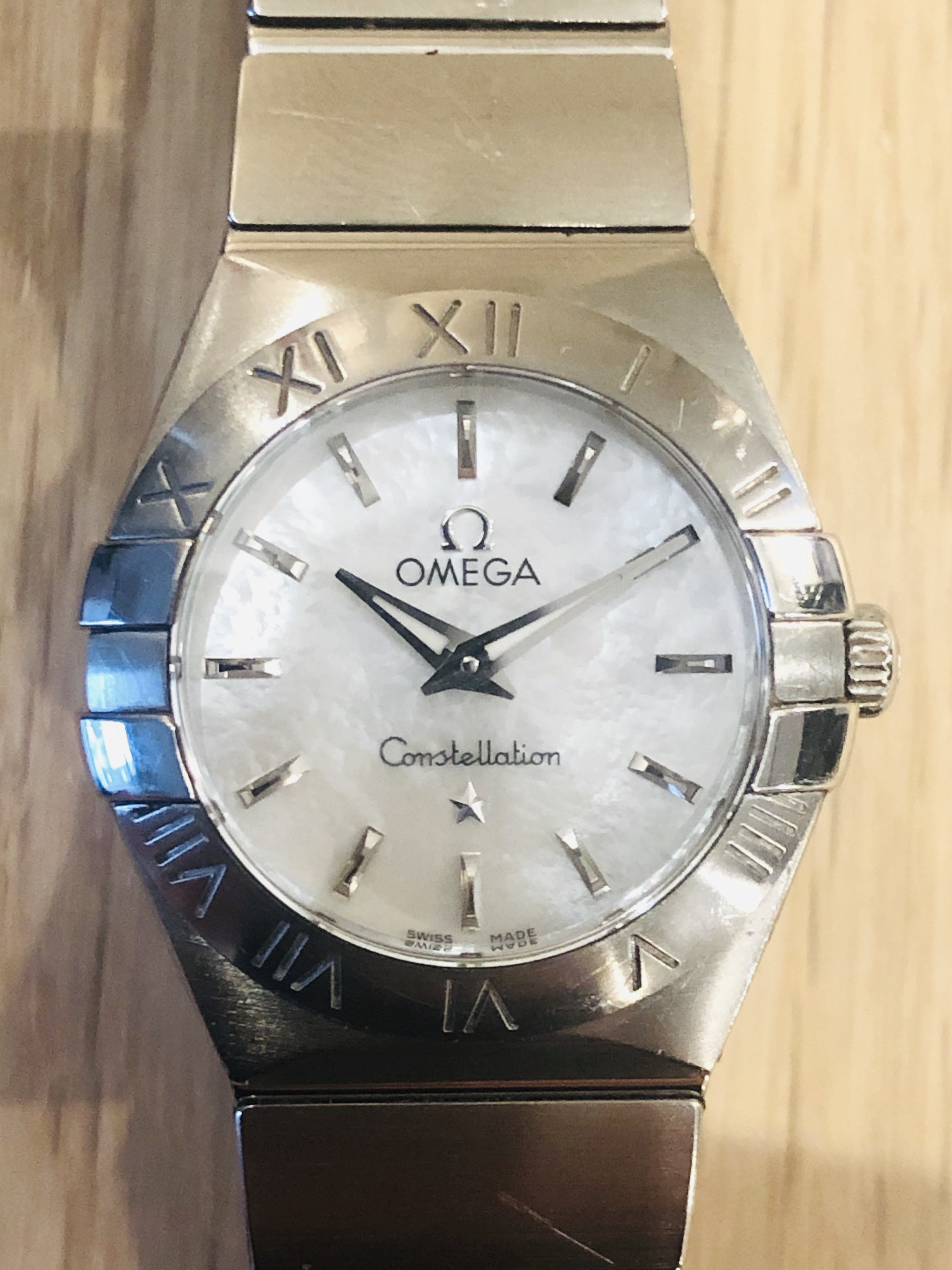 Up for sale is the lovely omega ladies constellation with a mother of peril dial with white gold Baton markers