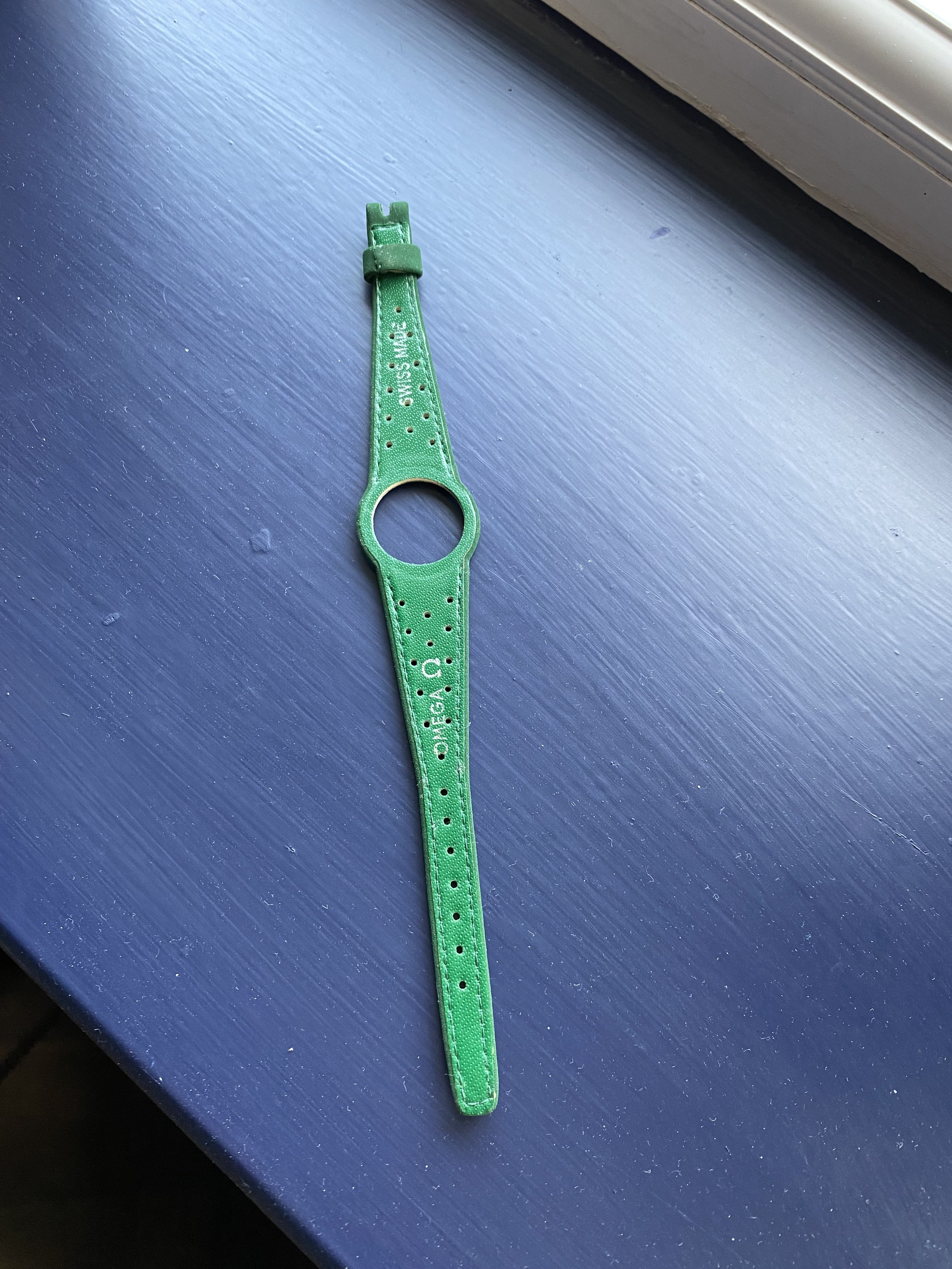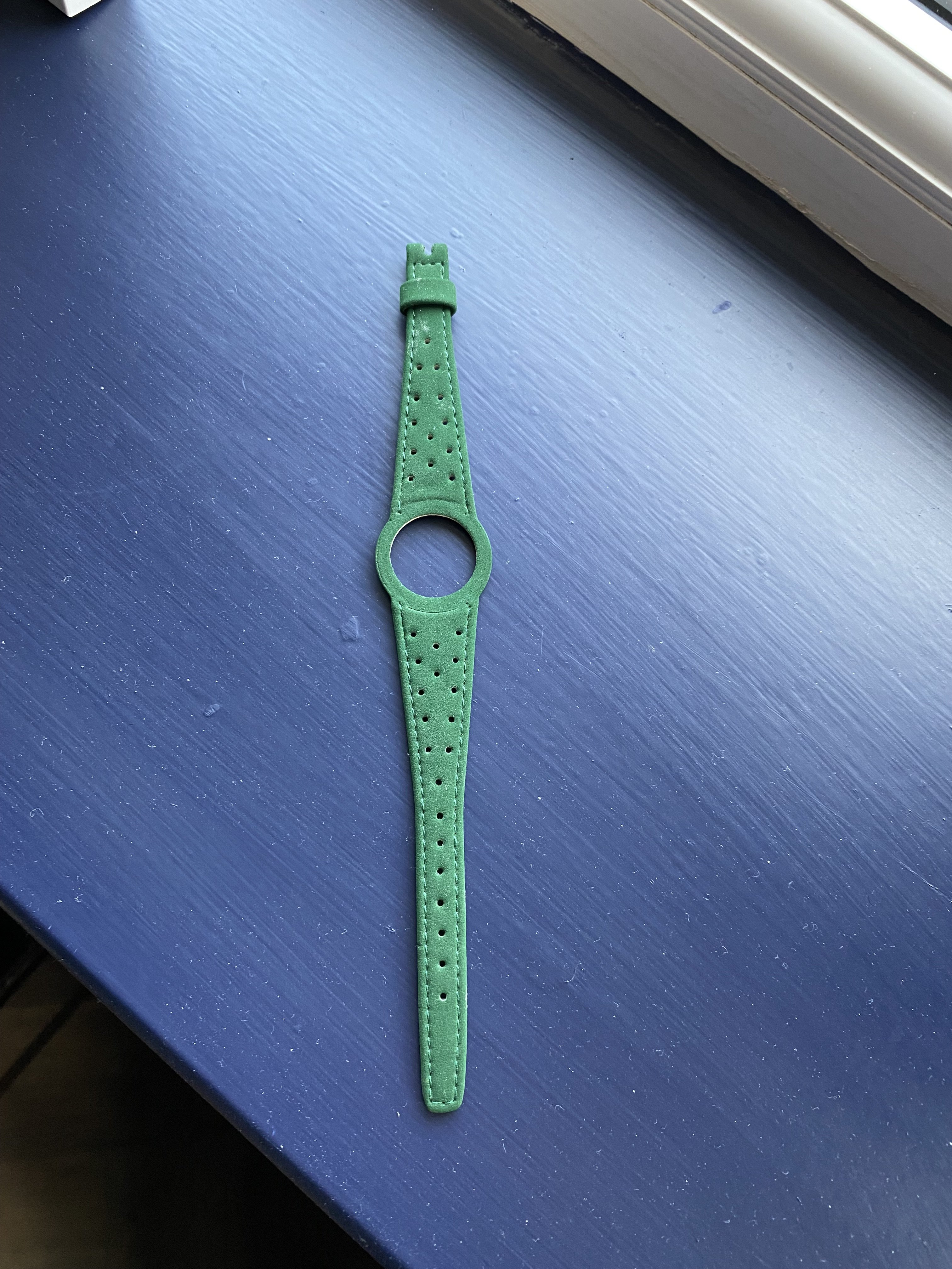 Material looks like leather/suede but I suspect it’s Omega’s “corfam”, patented waterproof suede like product.