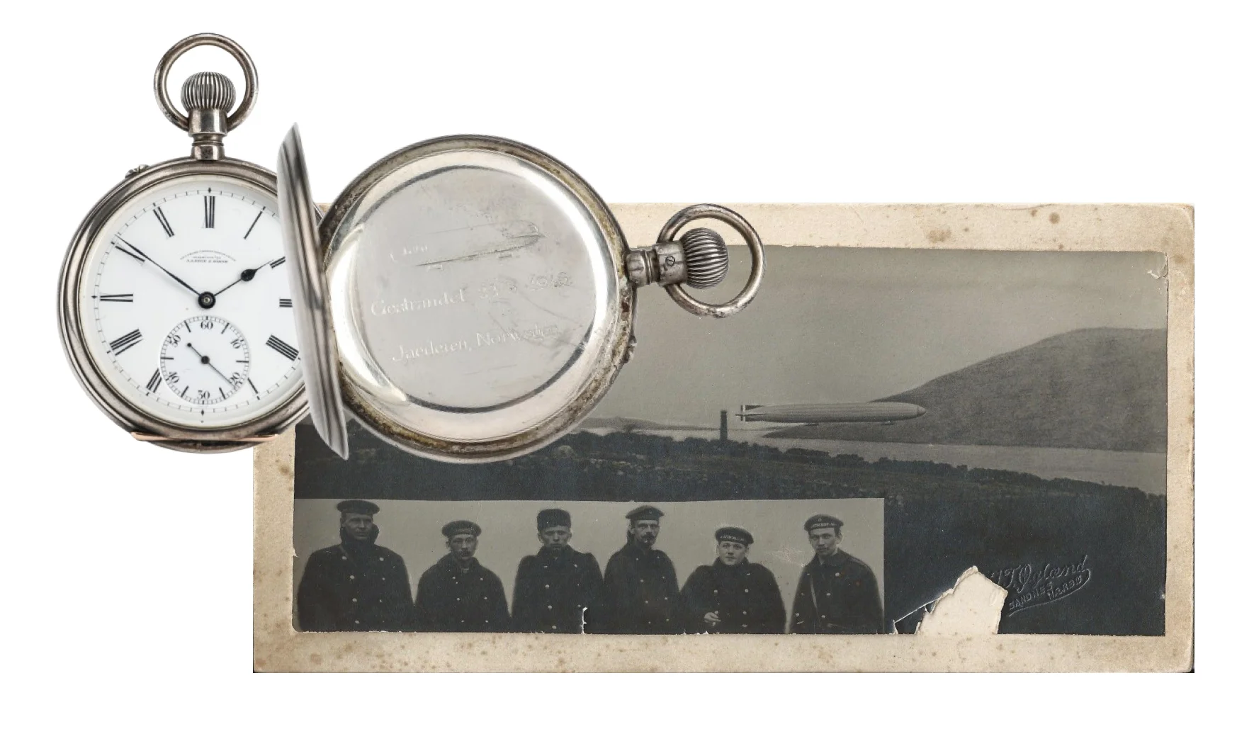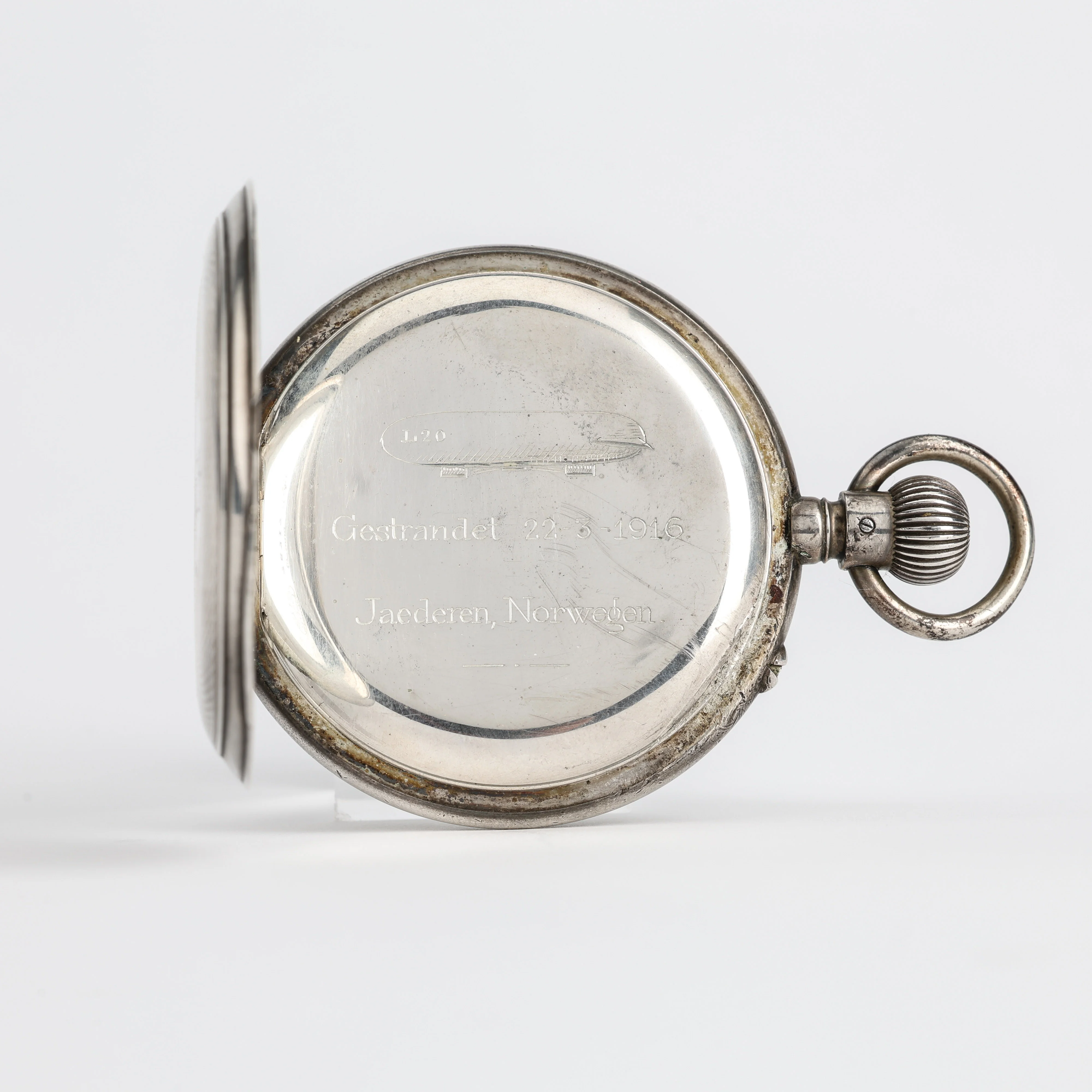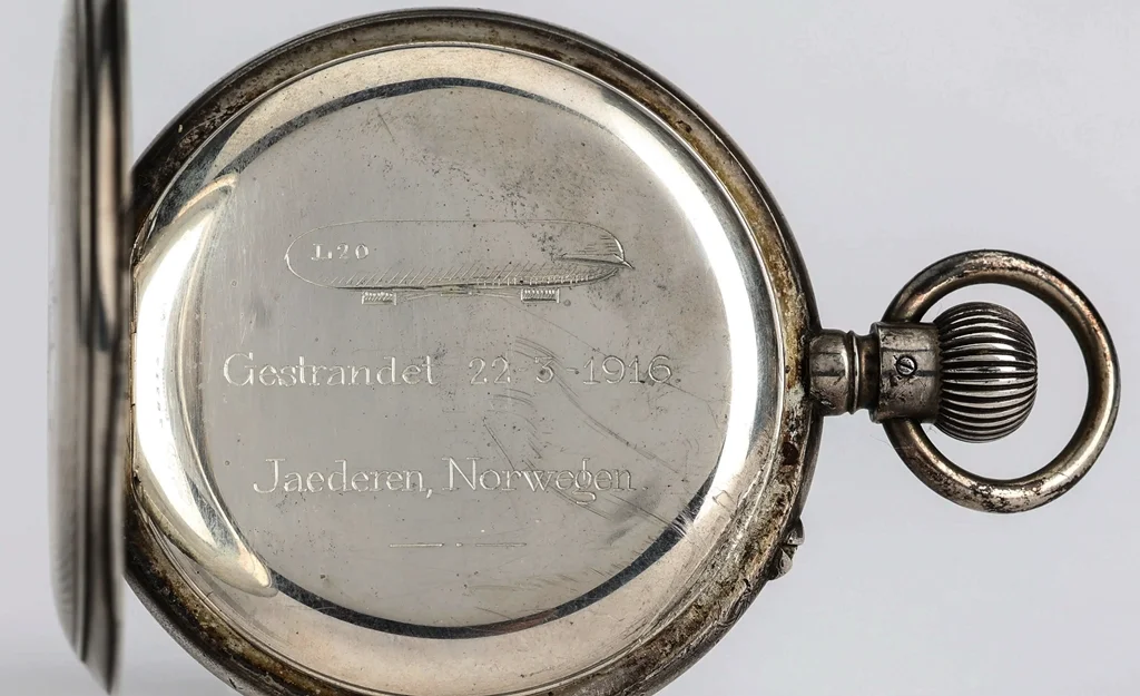 Most probably, the watch belonged to one of the 16 board members of L20 Zeppelin, infamously known as the Raider of Longborough. Attached images of the crew members and the L20 passing the Fjords in Norway are authentic witnesses of the event that followed shortly after in early May 1916.