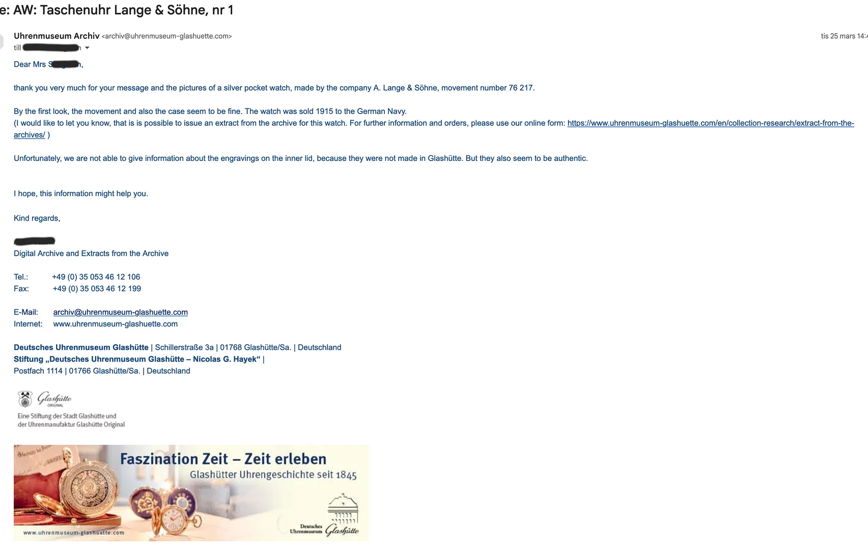 Presumably it deals with the very important watch. Lange & Sohne approved authenticity of the watch, but engraving in the inner lid hasn't been made in the factory though. Approved fact is, that this particular watch was delivered to the German Navy in 1915.