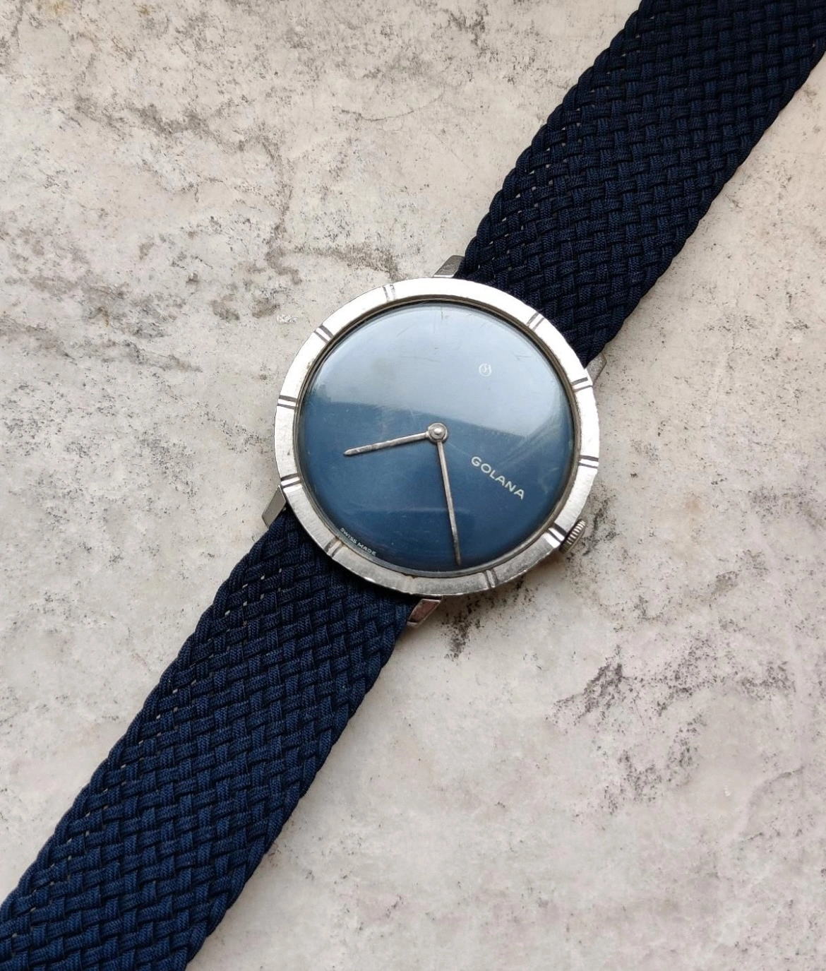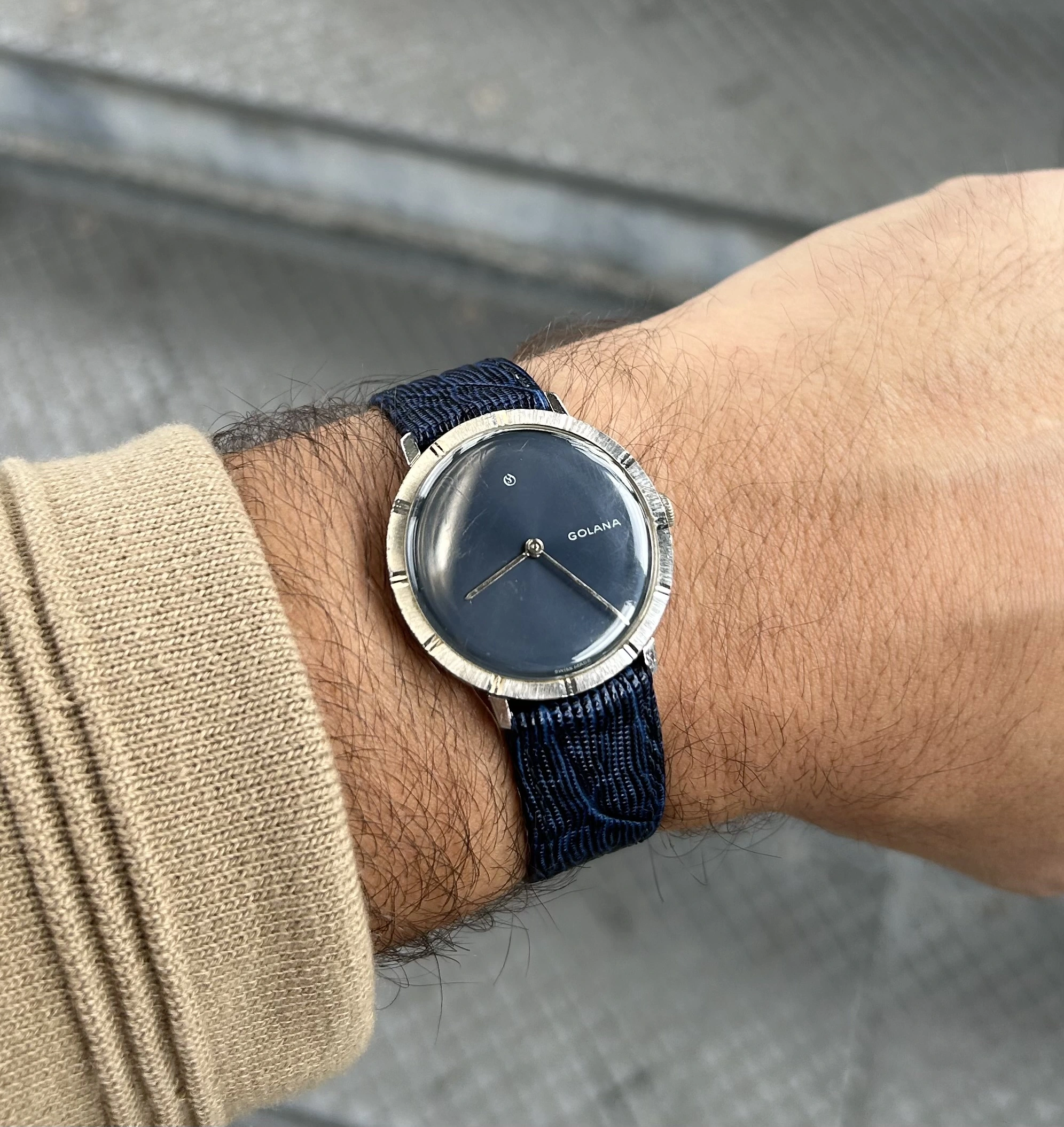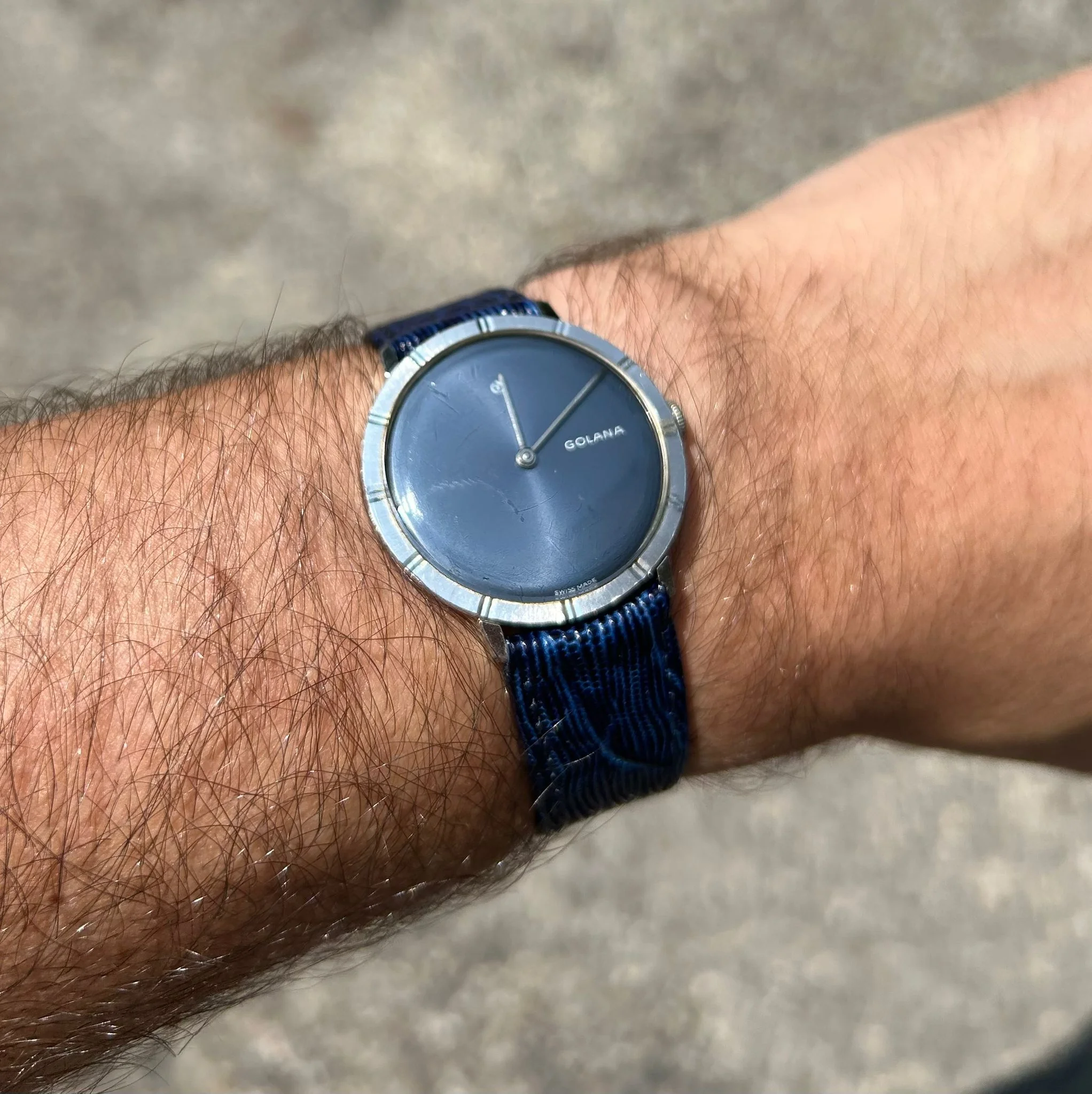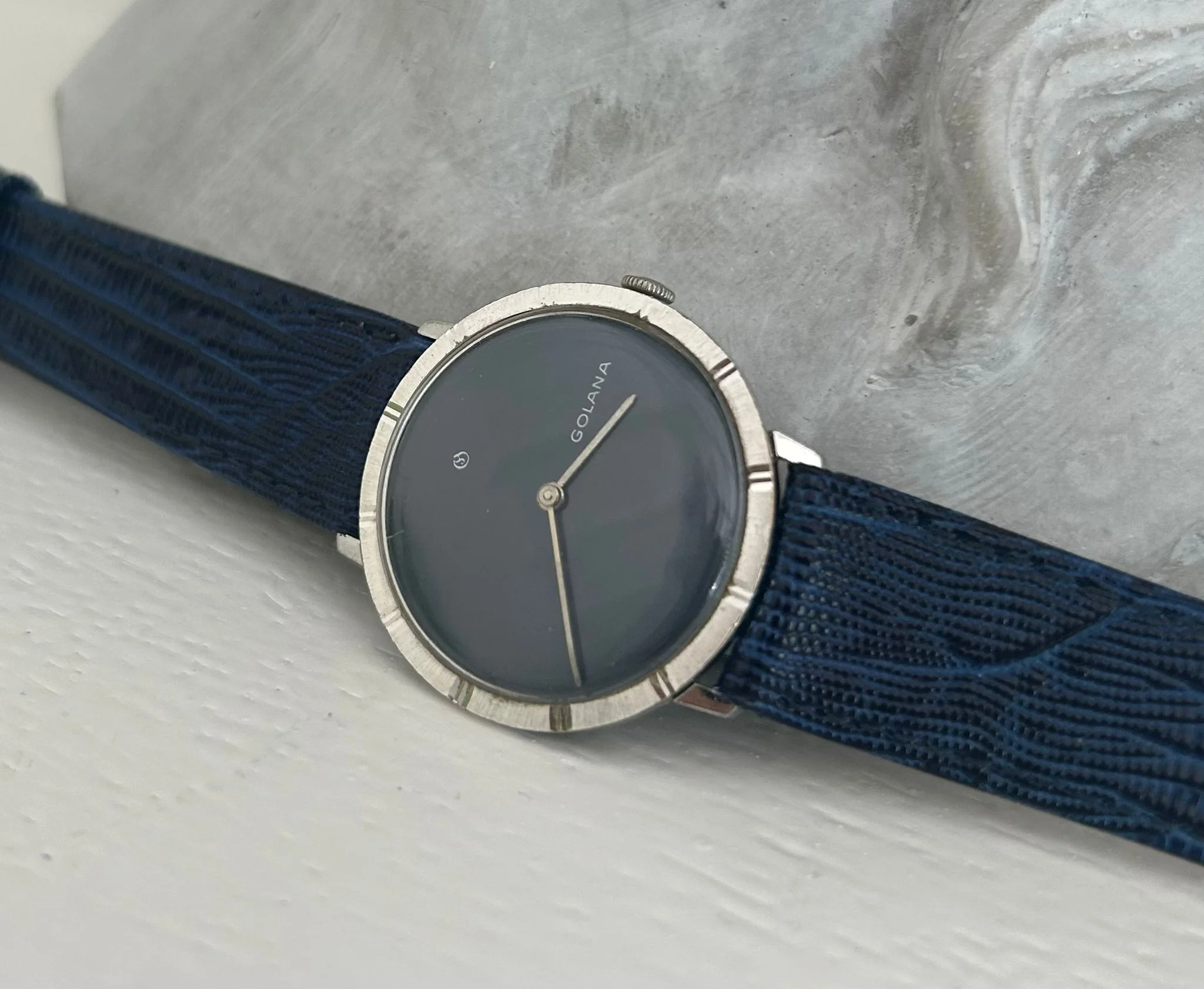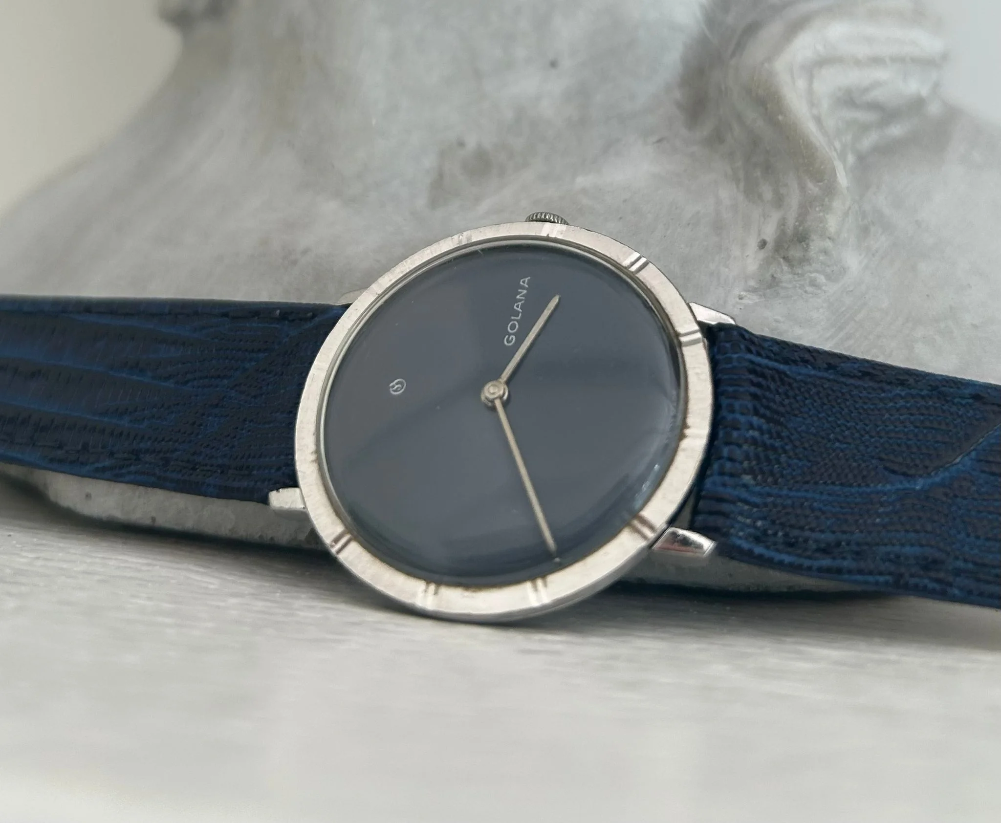 ·A dress watch with unexpected depth—this vintage Golana blends classic Swiss elegance with a dial that steals the spotlight. The deep, satinated blue surface shimmers between cobalt and navy depending on the light, lending the piece a quiet confidence that feels both refined and distinctive.