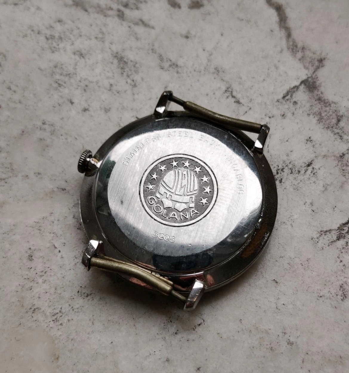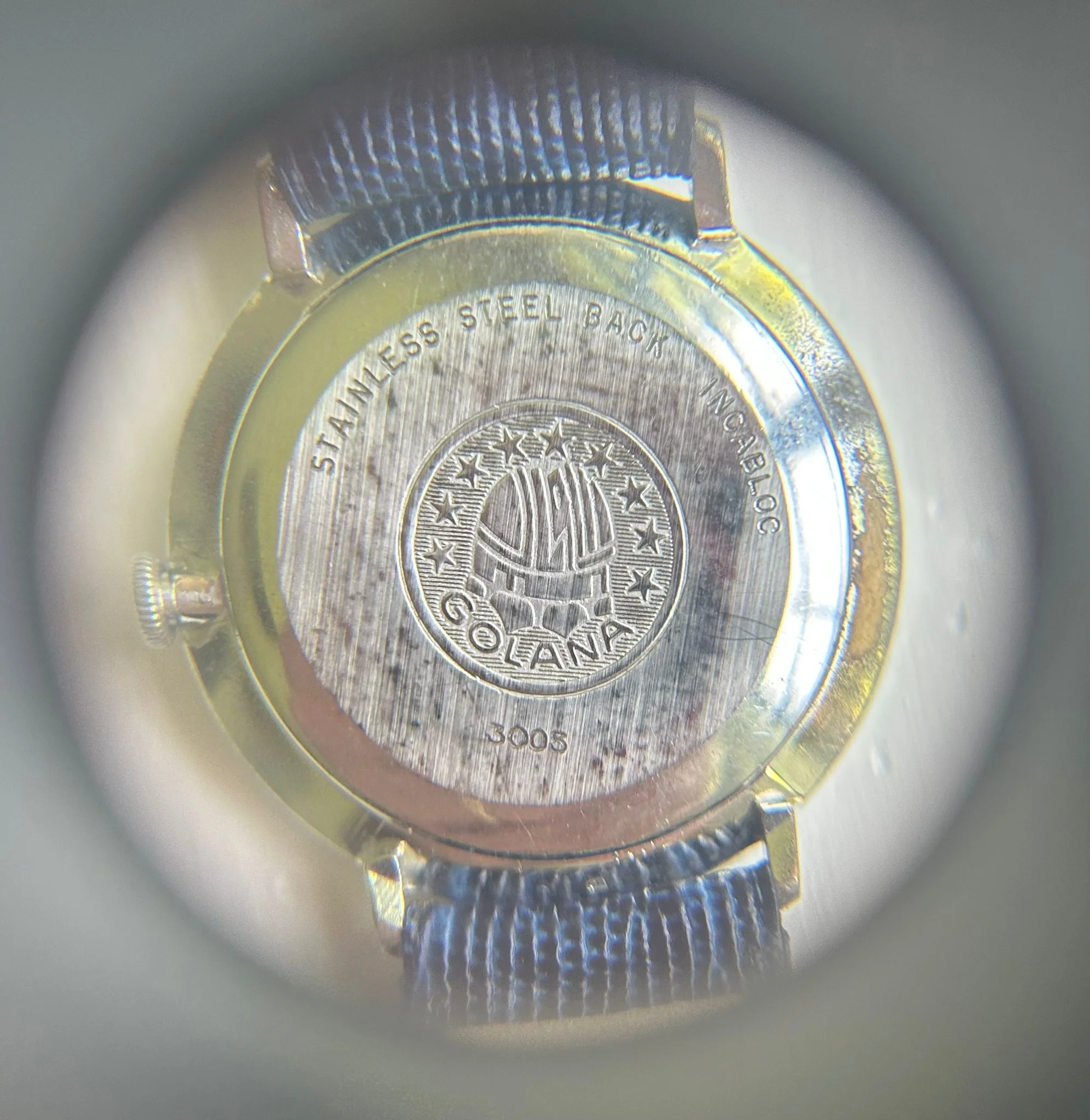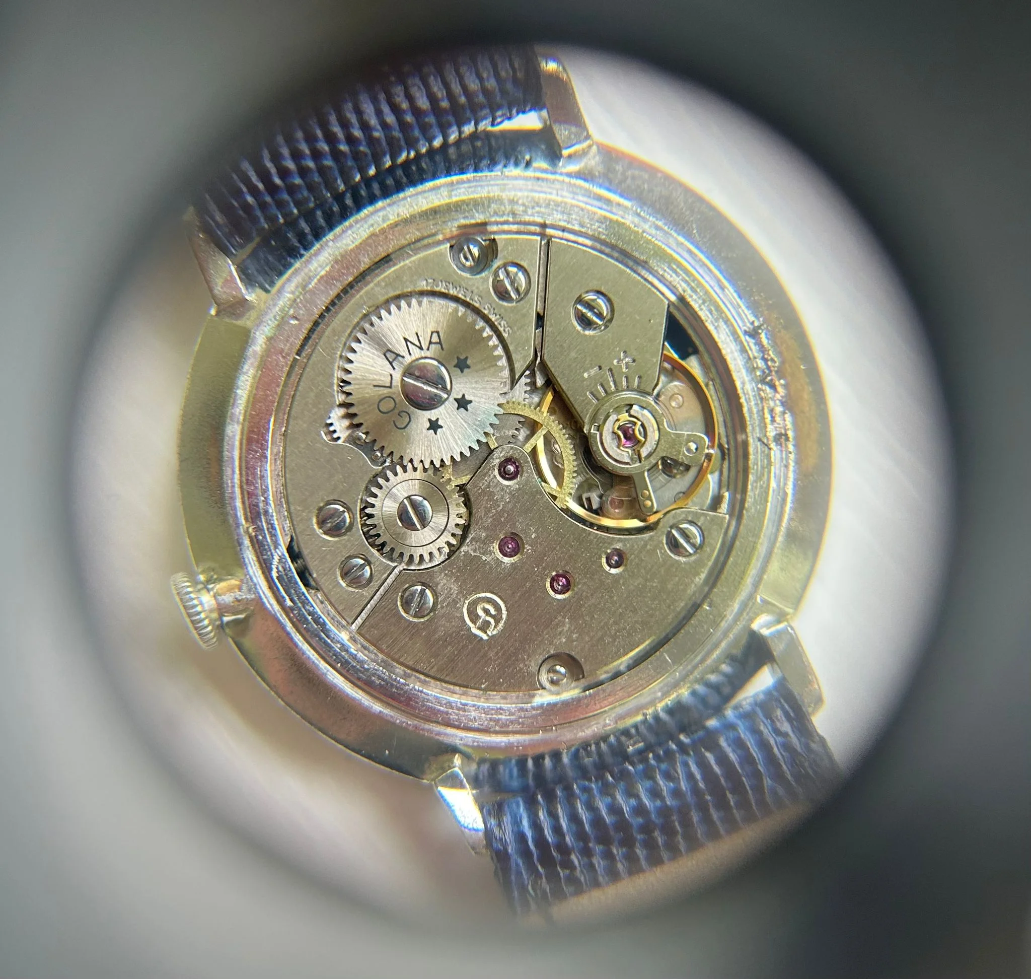 At 34mm, the case wears effortlessly, ideal for those who appreciate vintage proportions or understated wrist presence. Inside ticks a manually-wound Swiss movement, double-signed with “Golana” on the ratchet wheel—a charming hallmark of the era’s private-label craftsmanship.