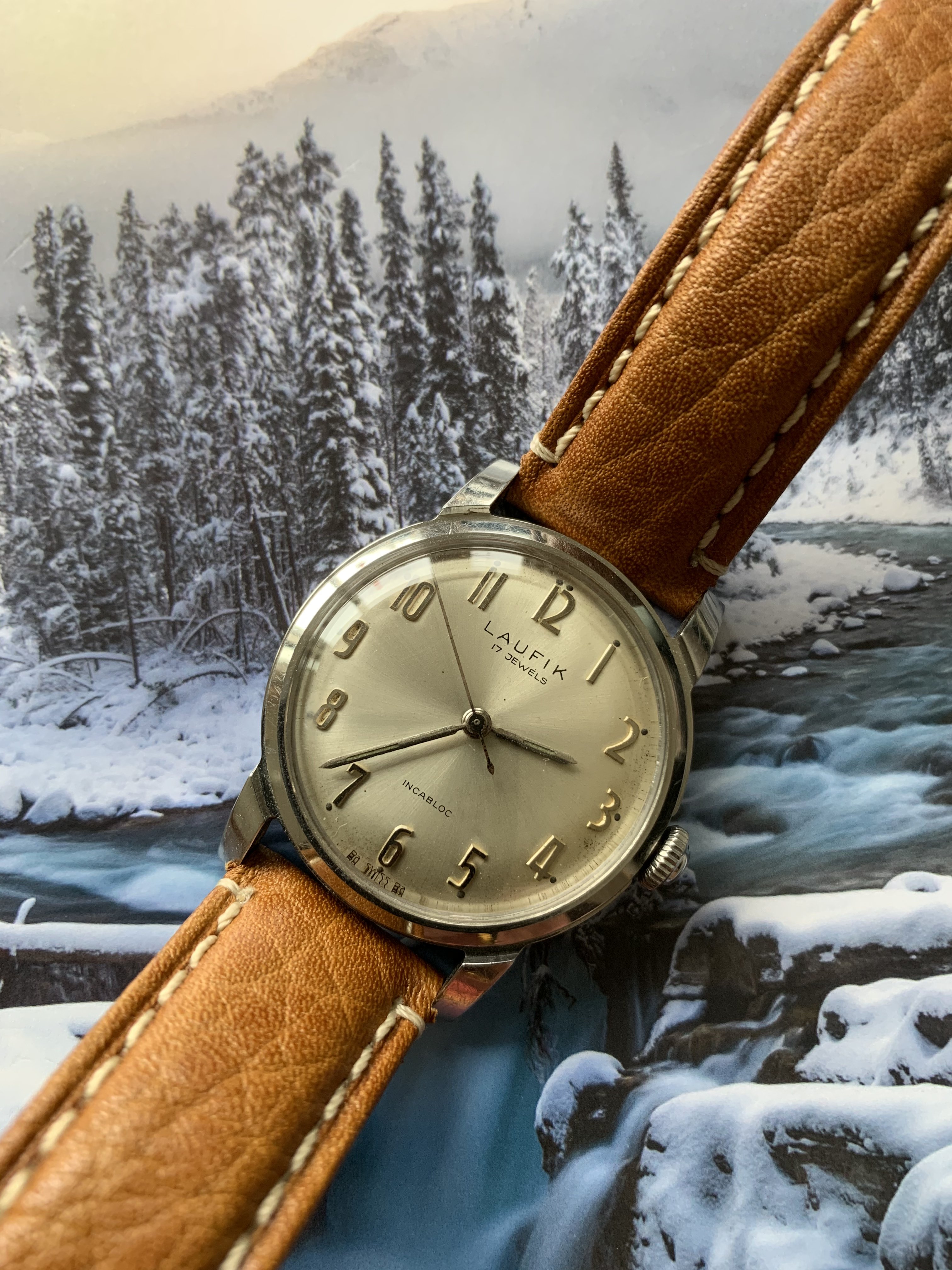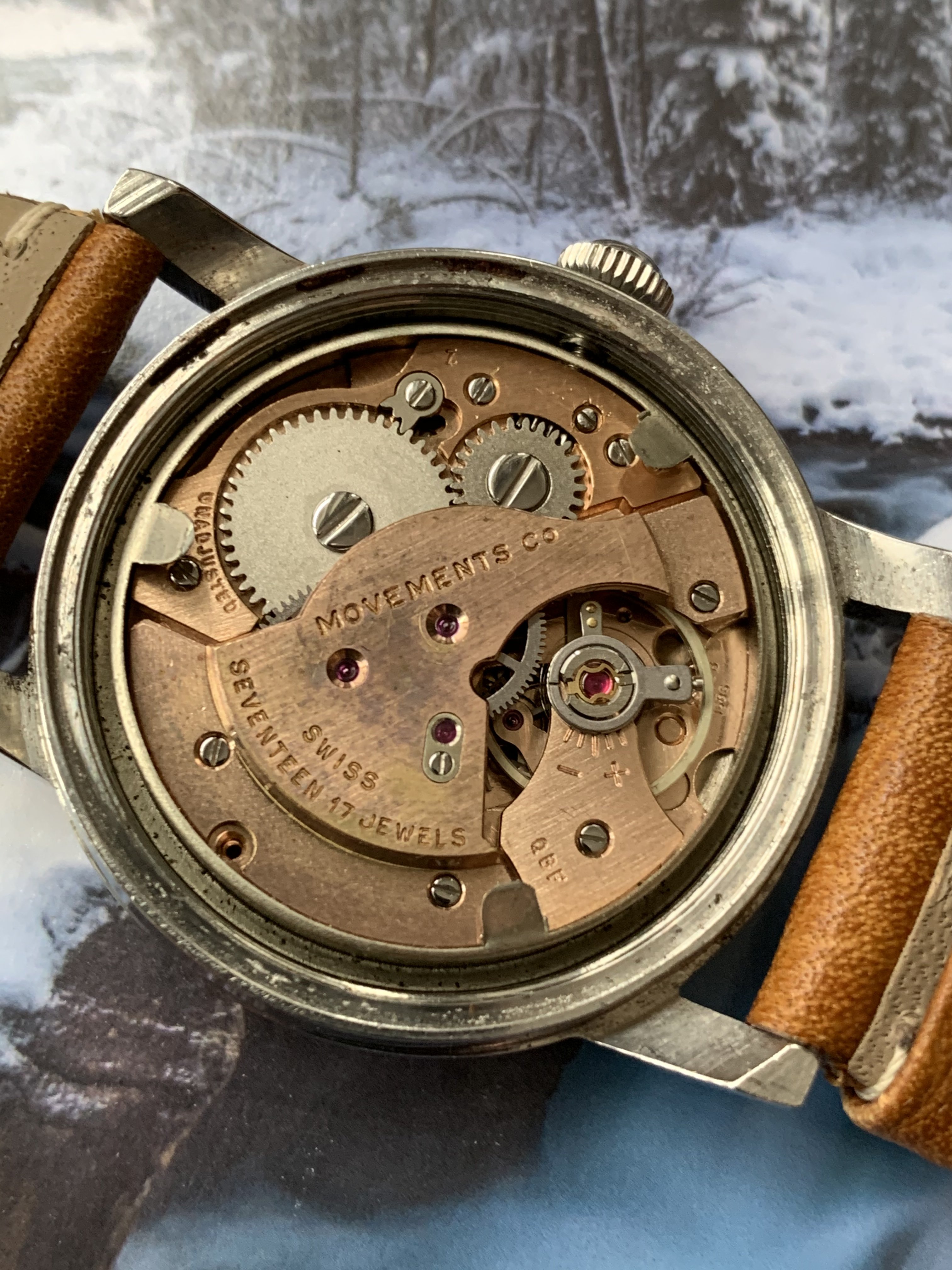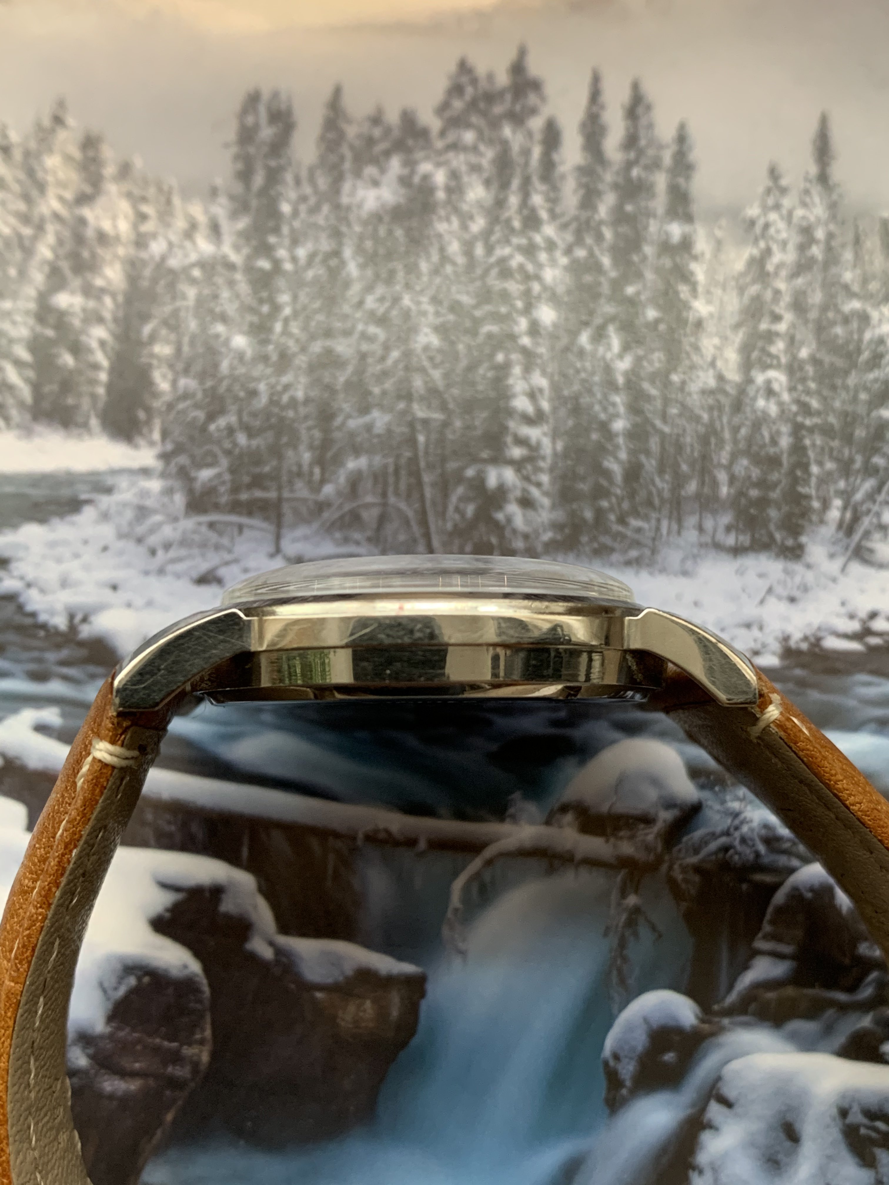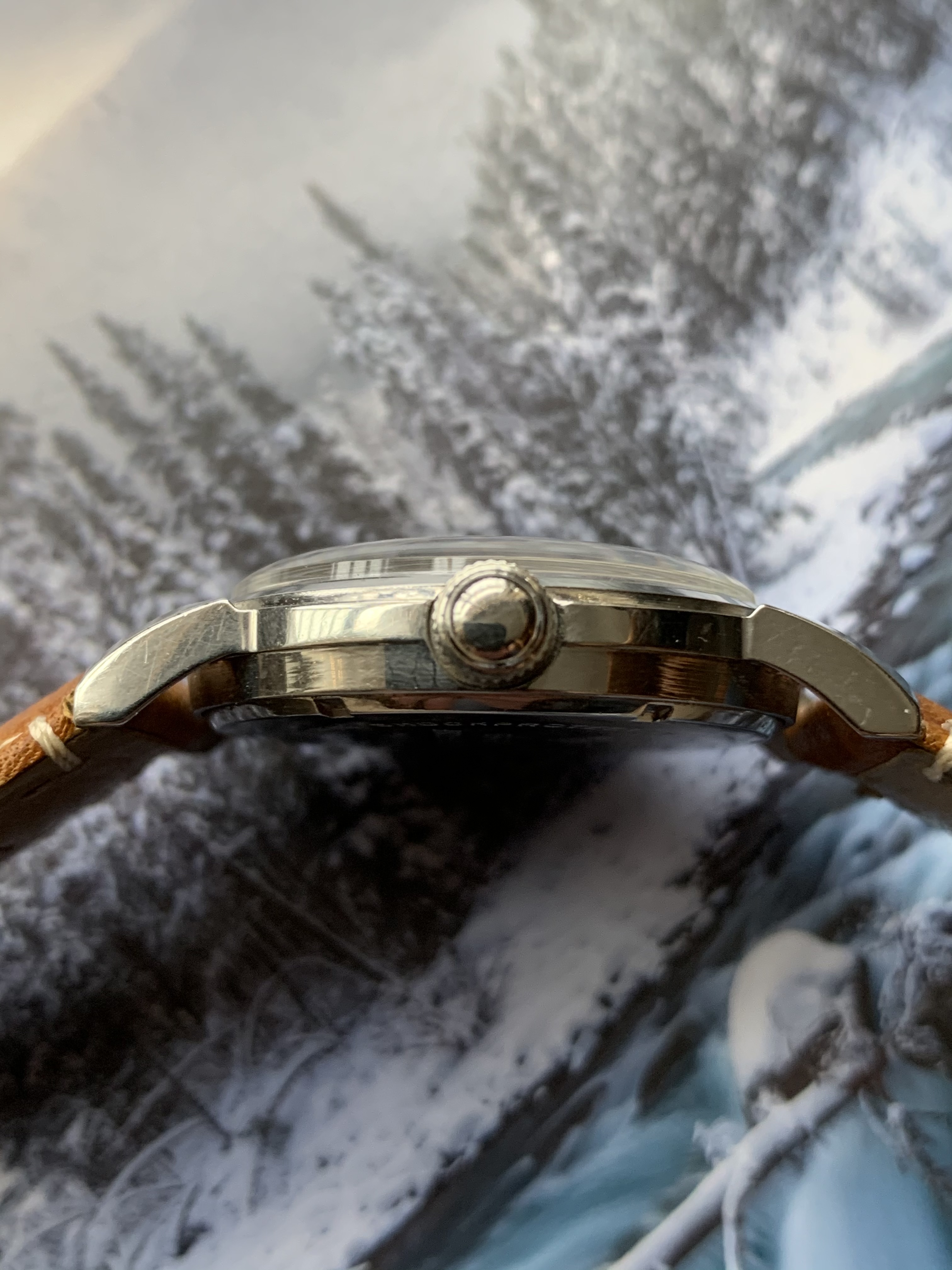 The 17 jewel, manual wind AS 1686 movement was fully serviced in 2019 and is keeping great time. The 33.3 (33.5?) stainless steel case (made in France) is in really nice shape and has sharp, confident lugs. The champagne dial is lovely, and playfully catches different light nicely. The applied furniture is pretty cool, too.