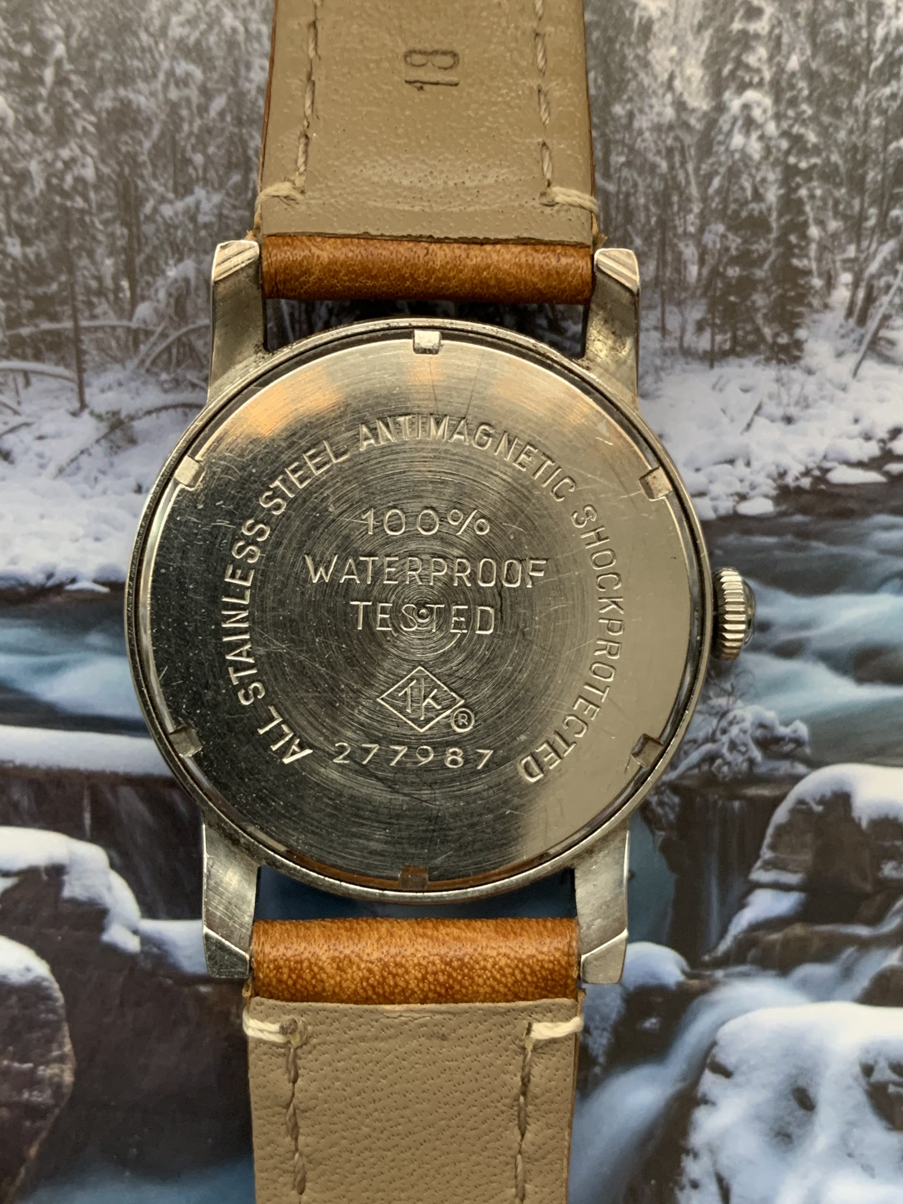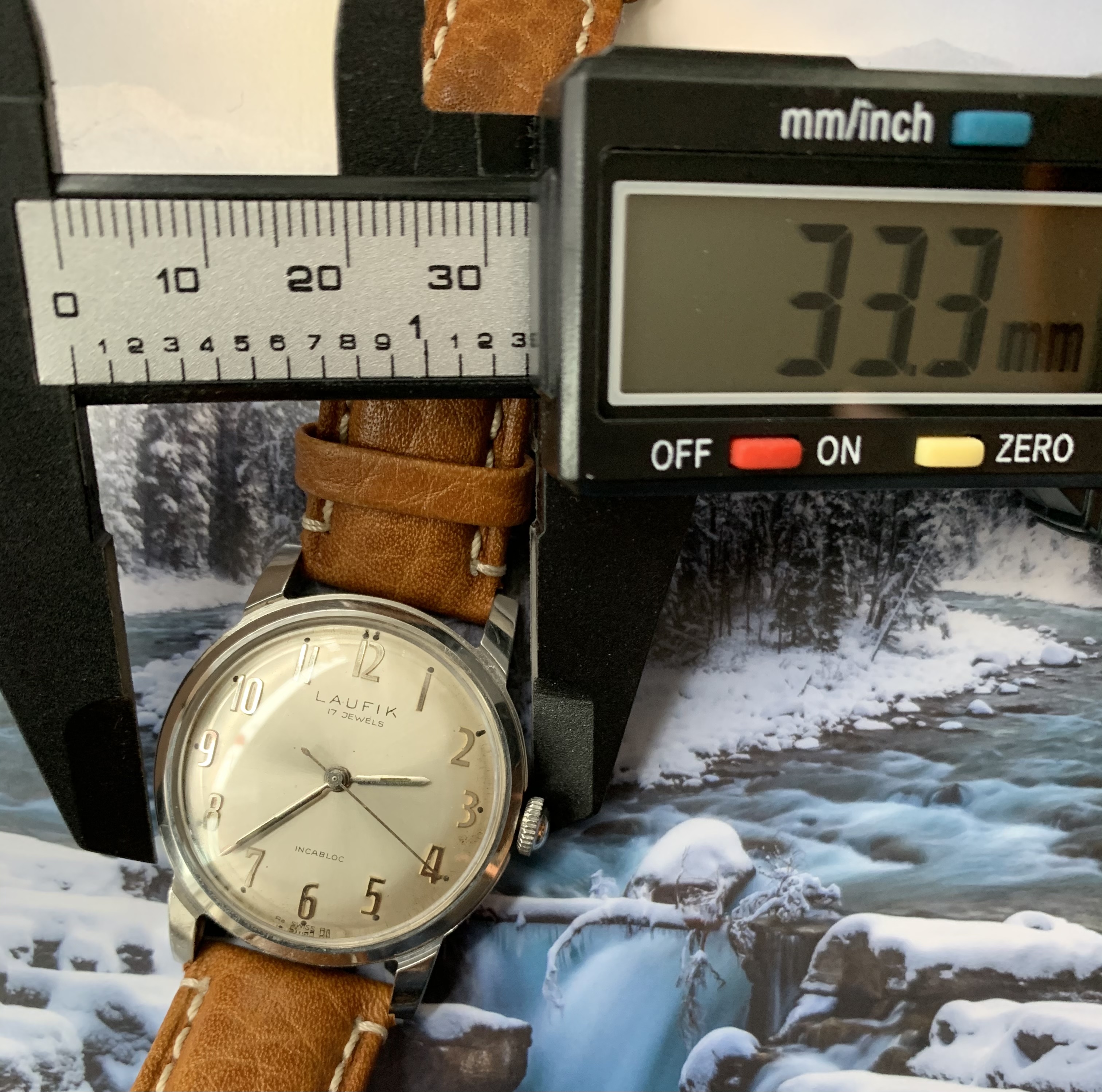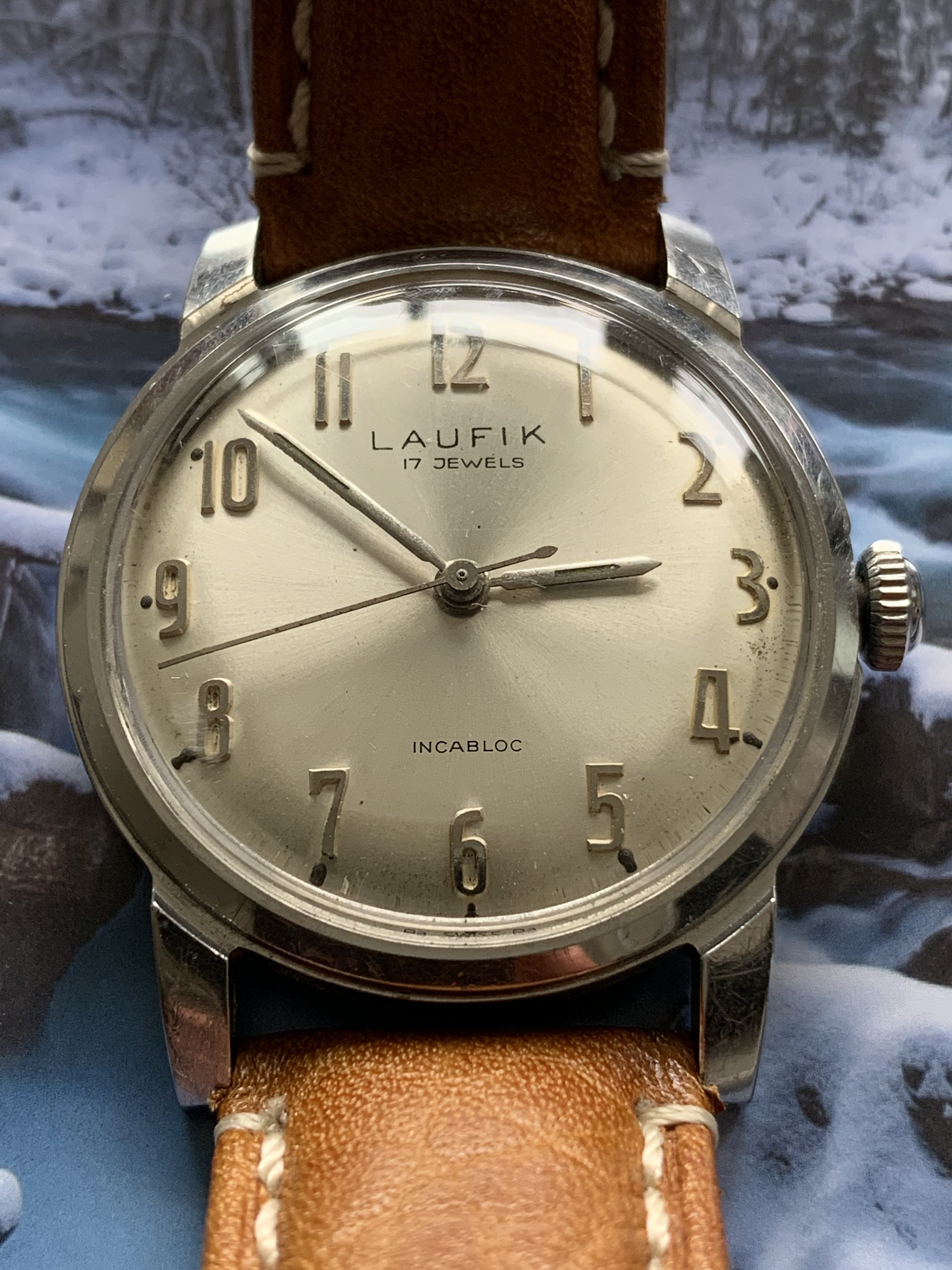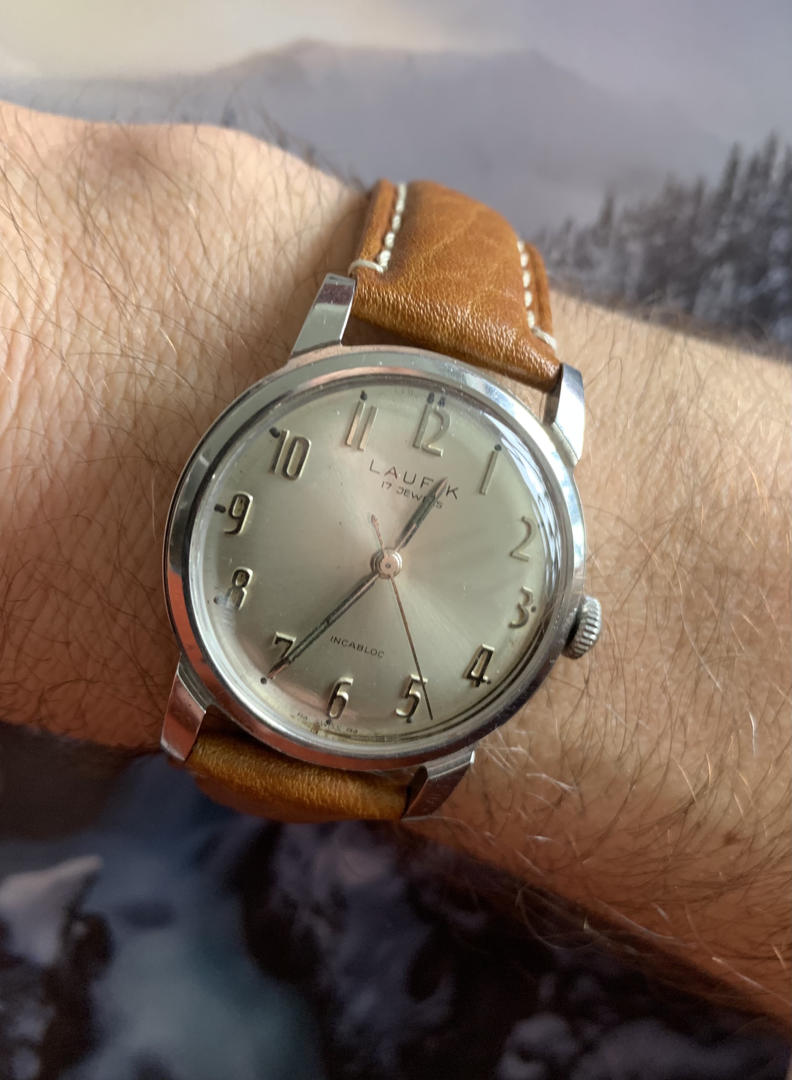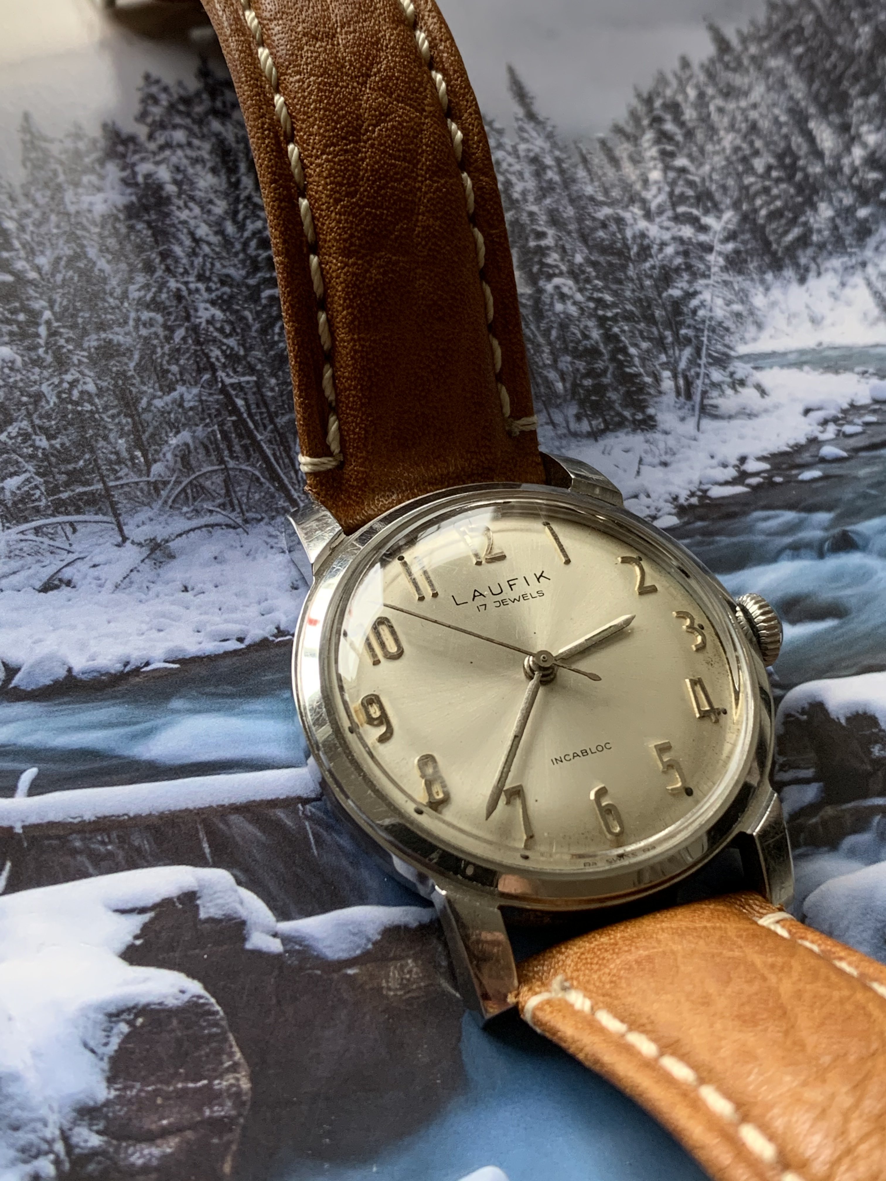 The 17 jewel, manual wind AS 1686 movement was fully serviced in 2019 and is keeping great time. The 33.3 (33.5?) stainless steel case (made in France) is in really nice shape and has sharp, confident lugs. The champagne dial is lovely, and playfully catches different light nicely. The applied furniture is pretty cool, too.